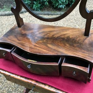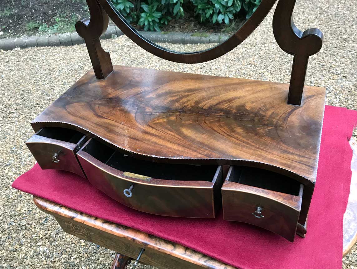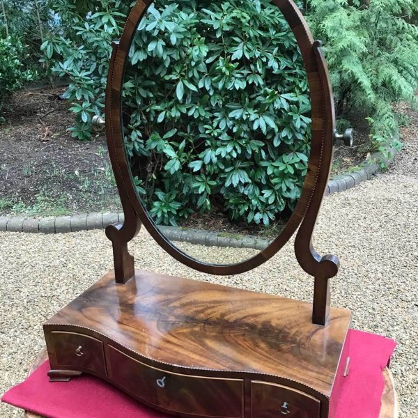 19th Century figured Mahogany Inlaid Dressing Mirror with a swing frame oval mirror on a serpentine base. With three fitted drawers on ogee bracket feet and original working key.