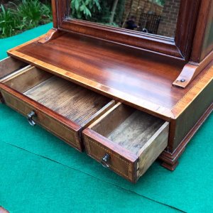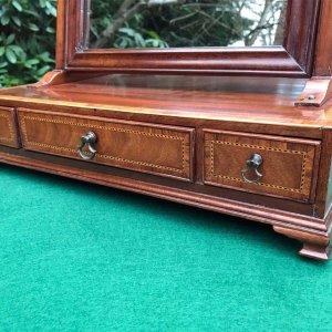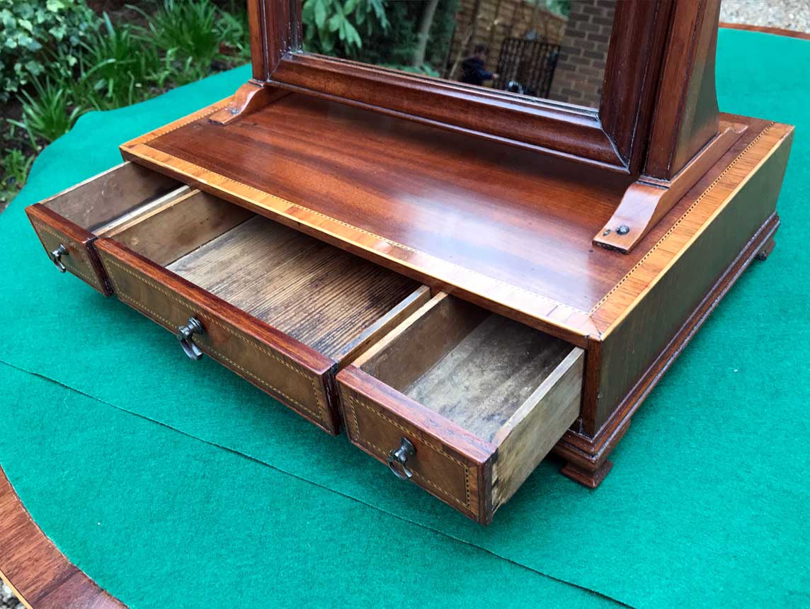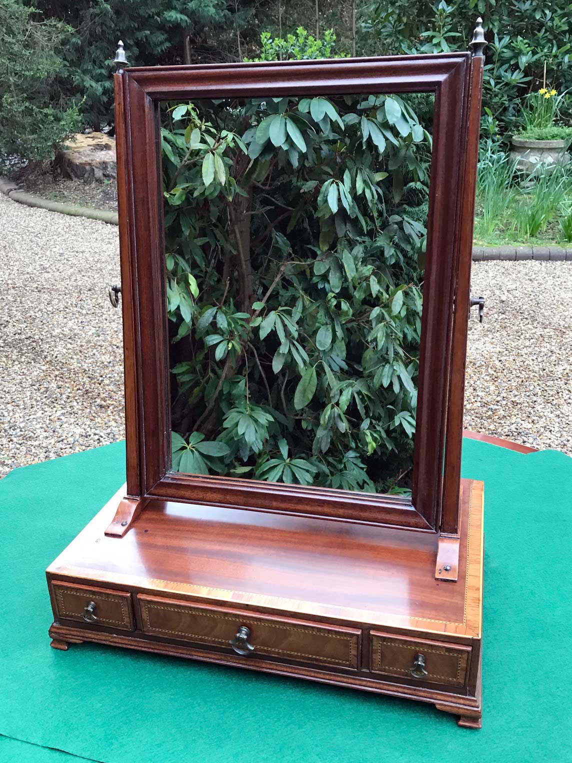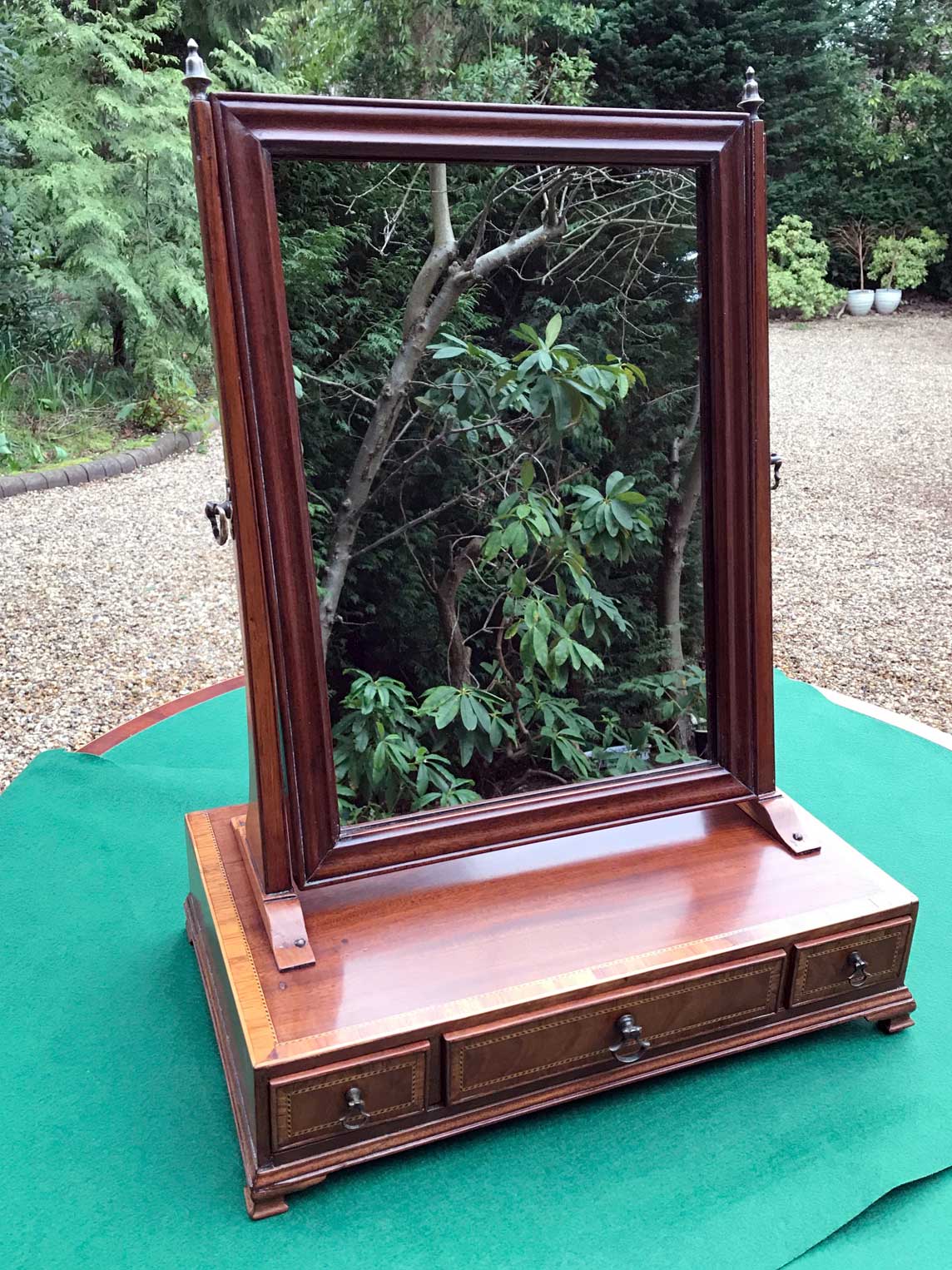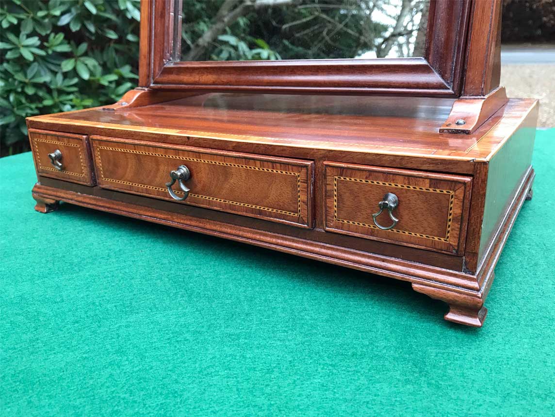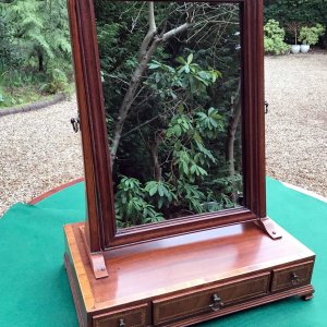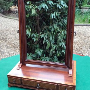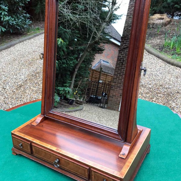 Georgian Mahogany Inlaid Swing Frame Dressing Mirror which is crossbanded with Rosewood, fitted with three drawers and brass fittings, on ogee bracket feet.