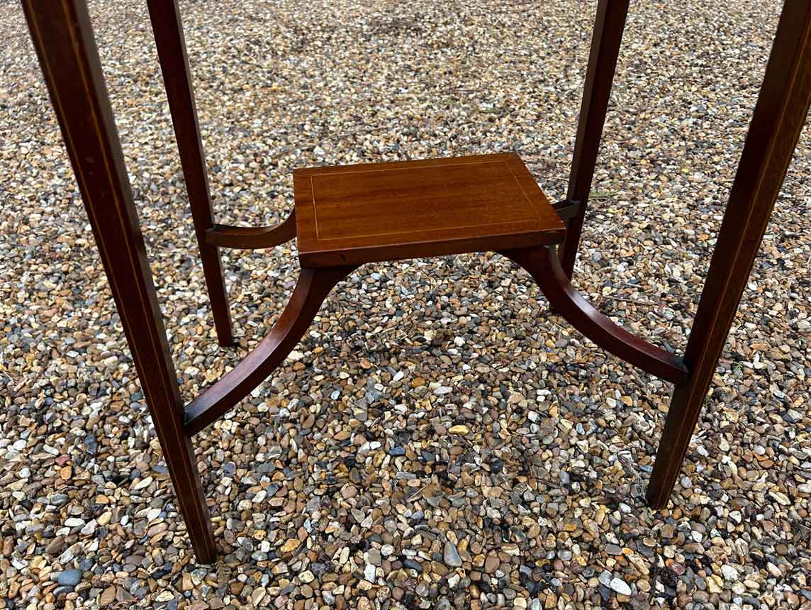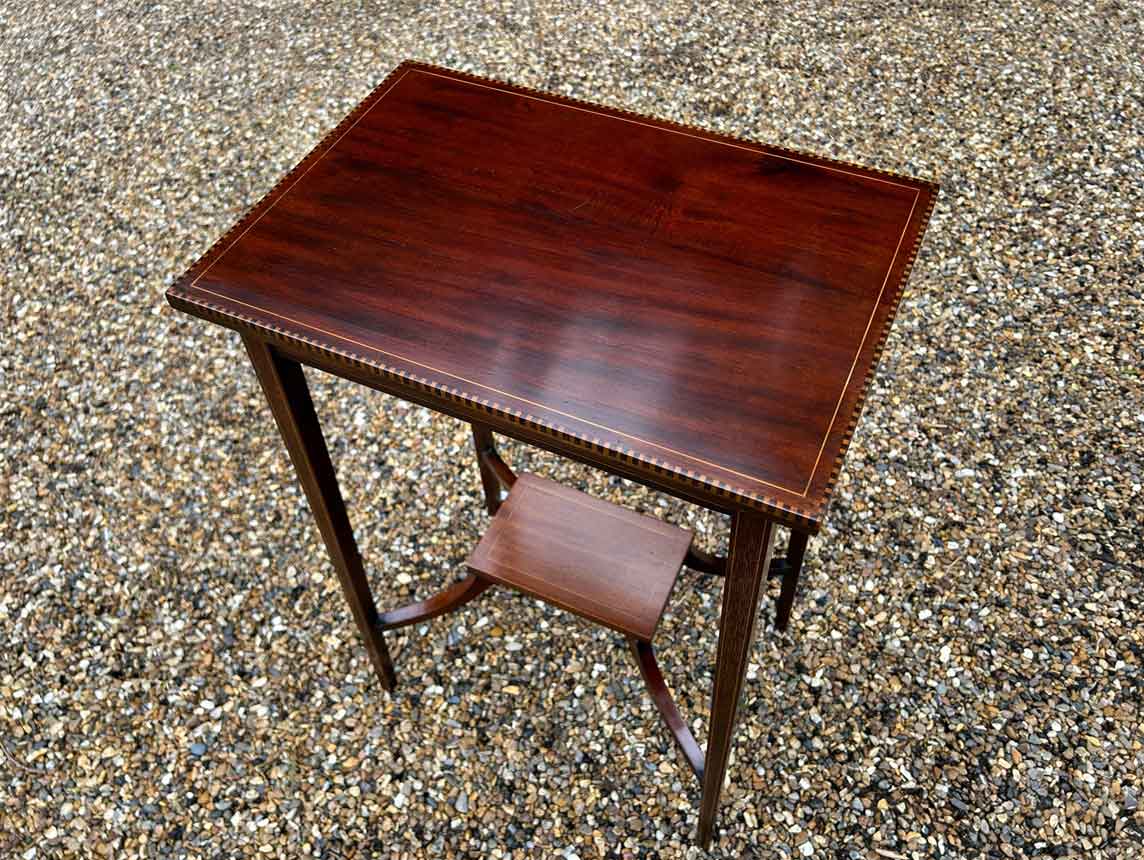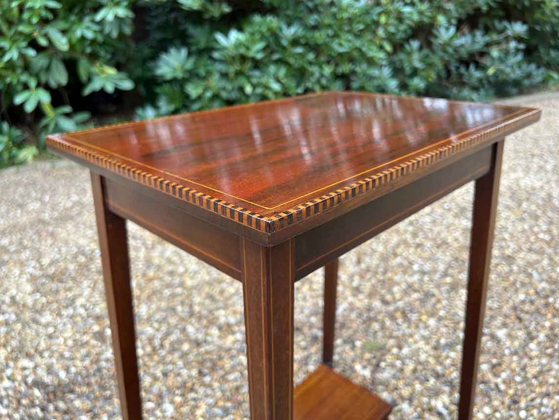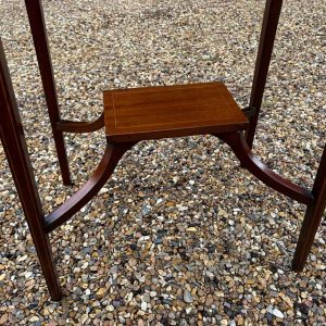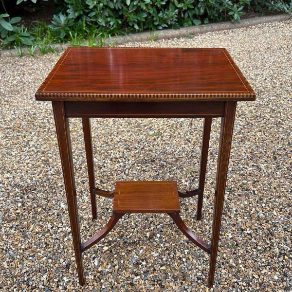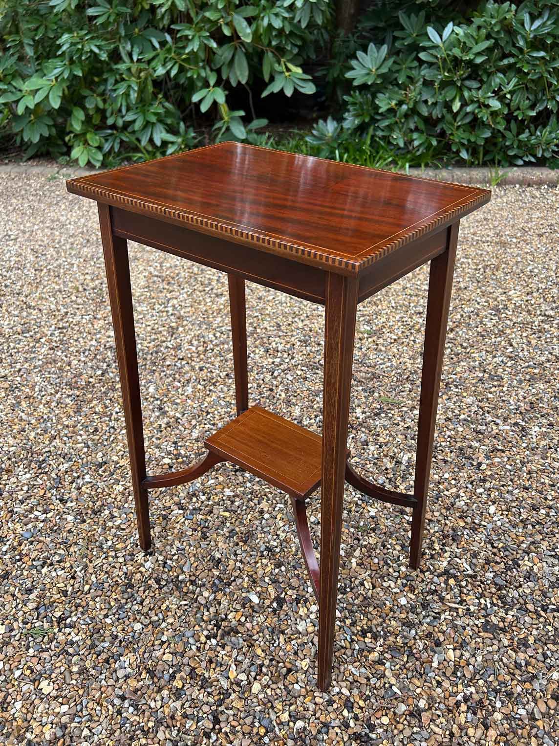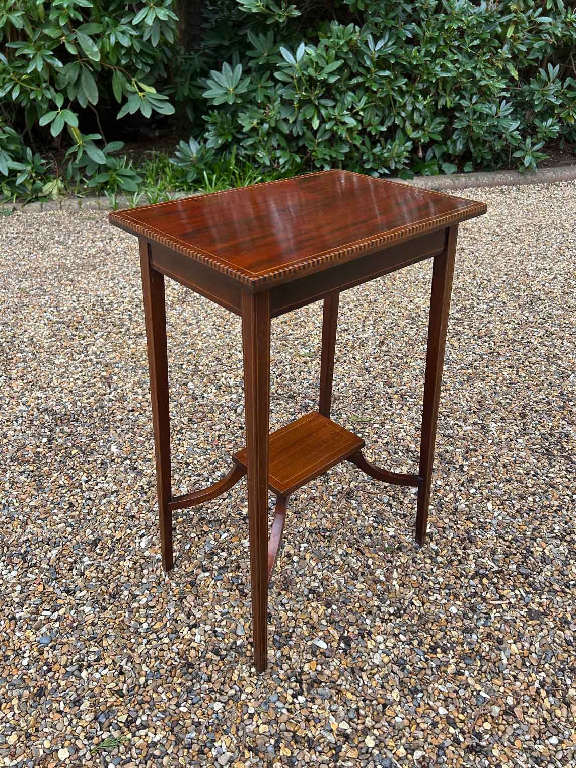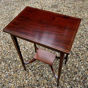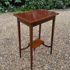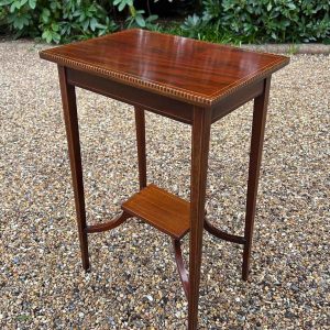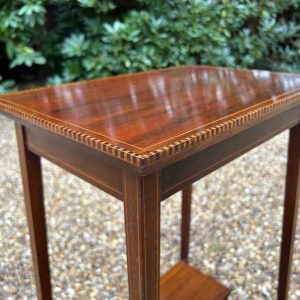 This very attractive small Edwardian Mahogany Square Occasional Table withchewuered banded edge top, lower shelf and inlaid decoration.