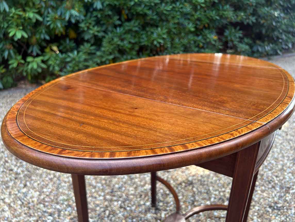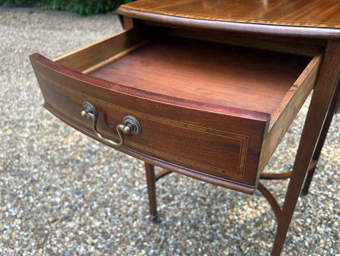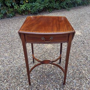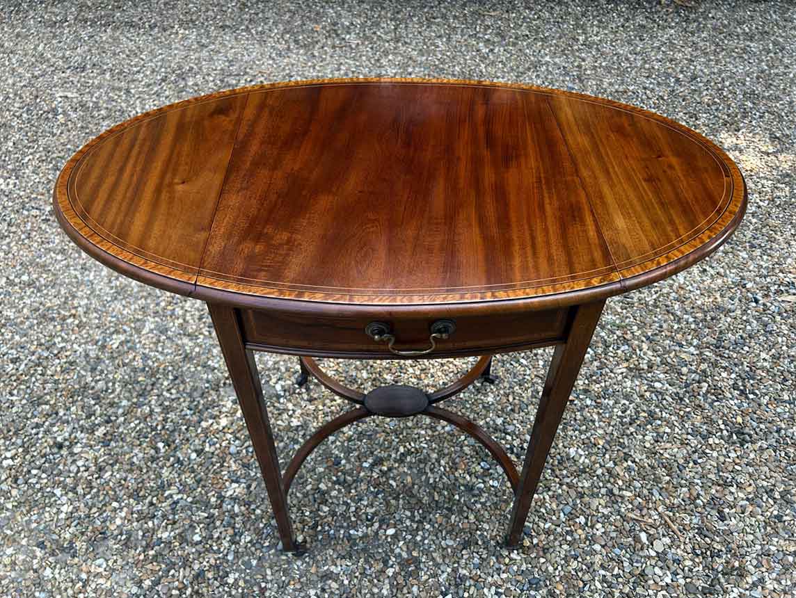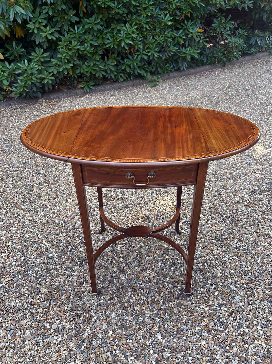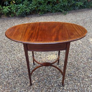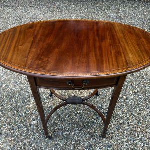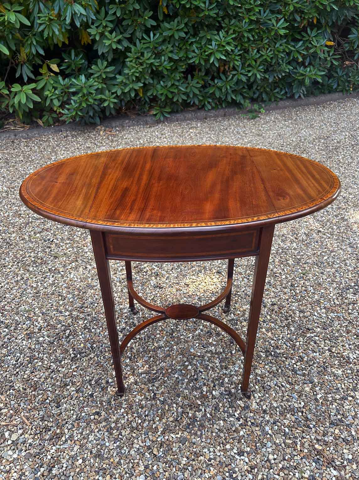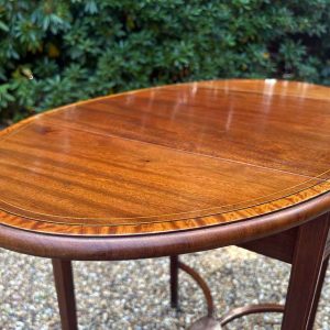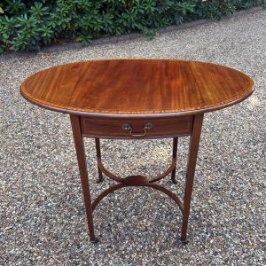 A very good quality 19th Century Mahogany Oval Pembroke Table, with inlaid satinwood crossbandings on top, a single mahogany lined drawer with a brass swan neck handle. Standing on elegant square tapered legs supports united by ‘X’ stretcher with brass castors to base.