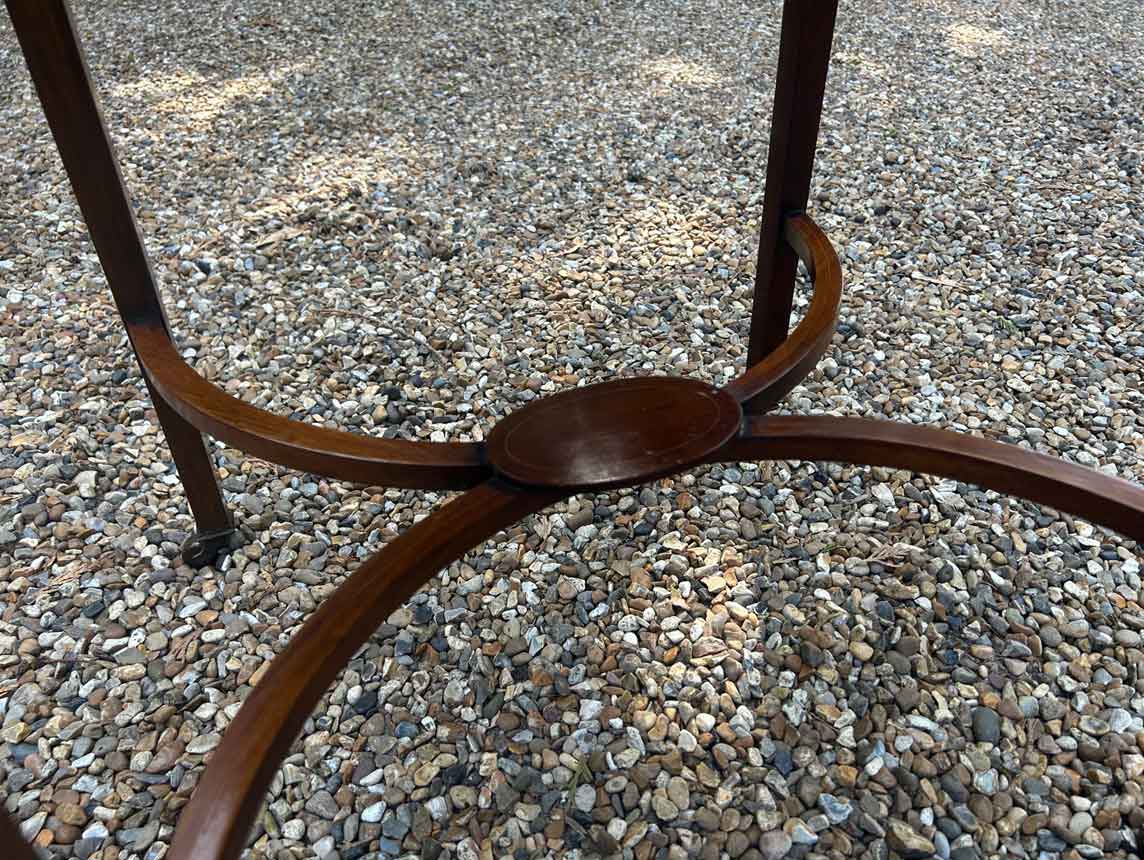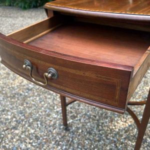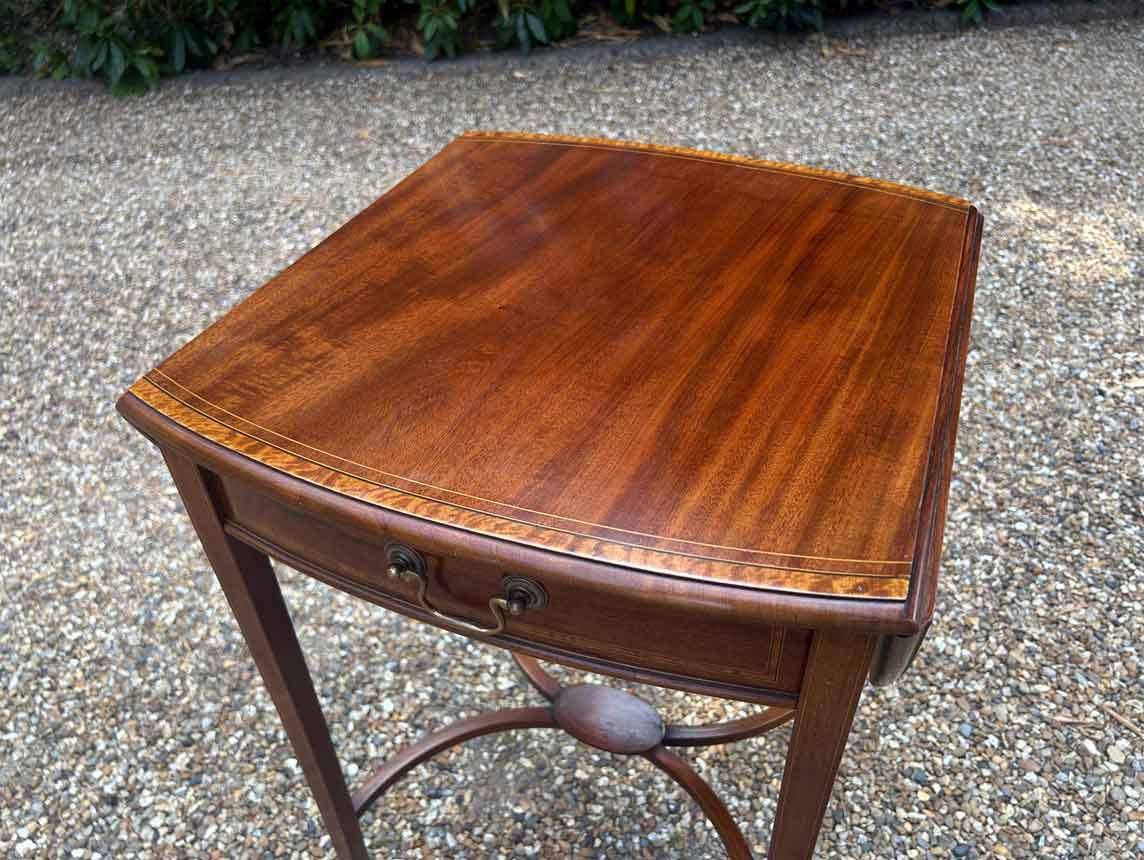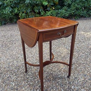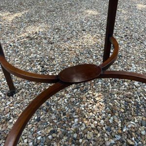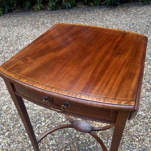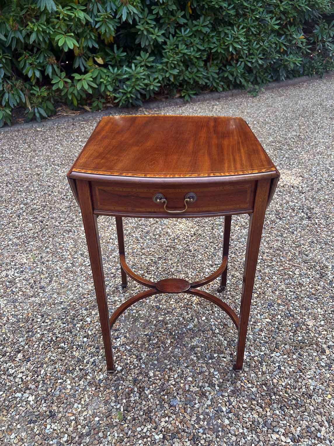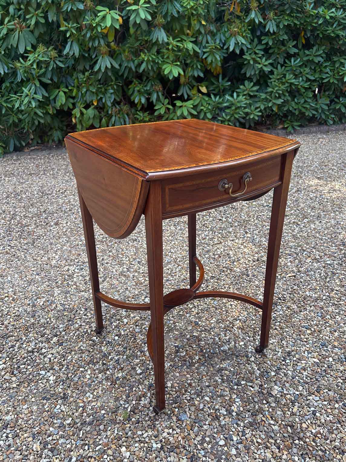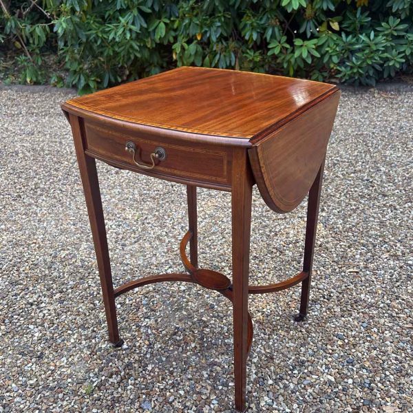 A very good quality 19th Century Mahogany Oval Pembroke Table, with inlaid satinwood crossbandings on top, a single mahogany lined drawer with a brass swan neck handle. Standing on elegant square tapered legs supports united by ‘X’ stretcher with brass castors to base.