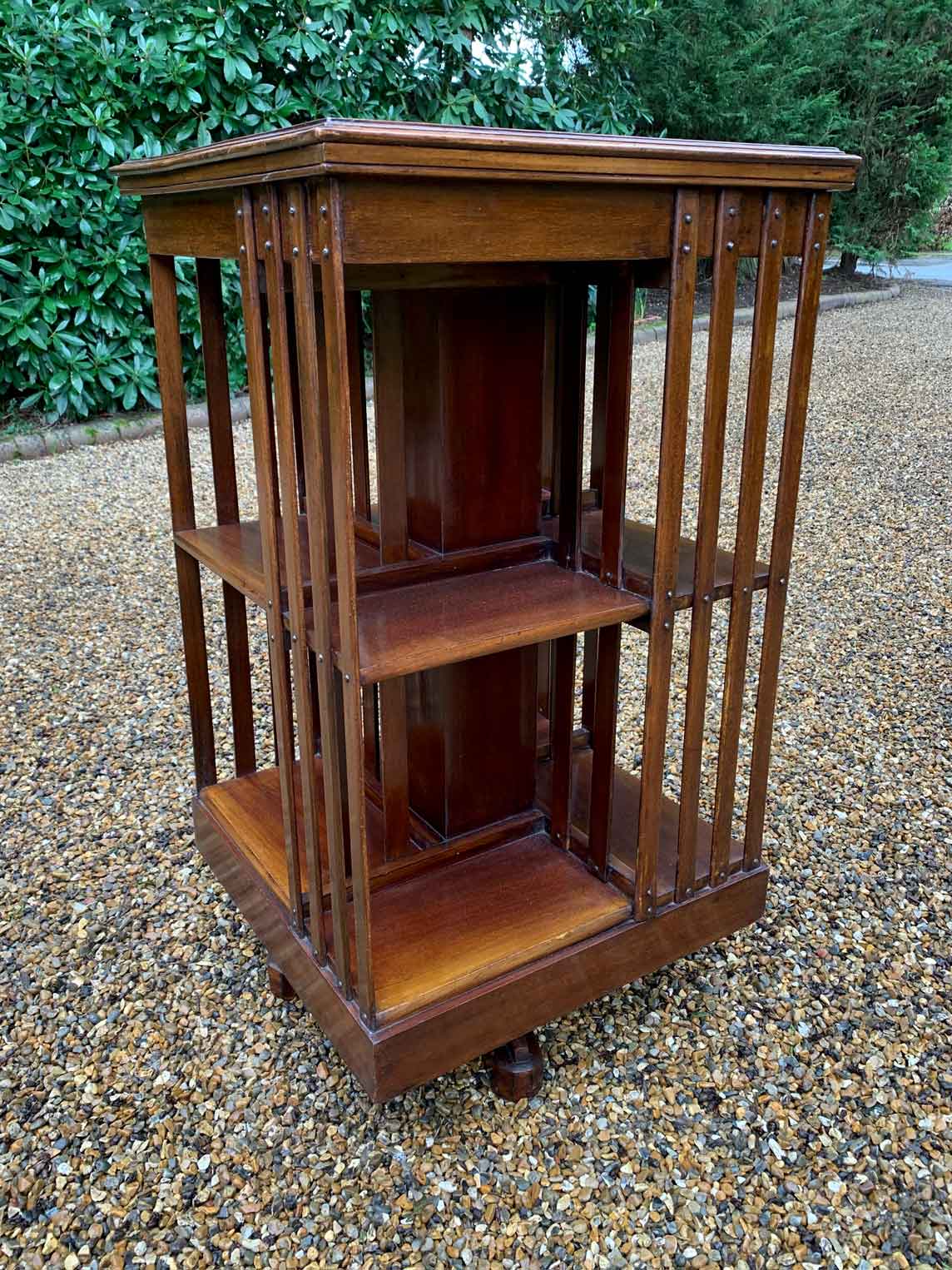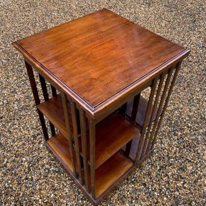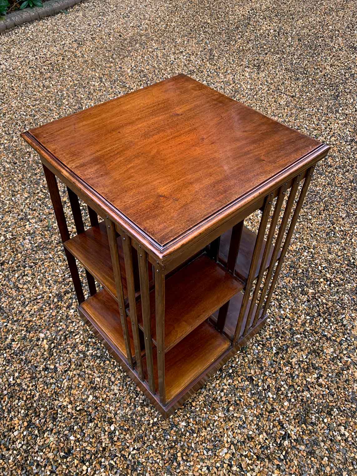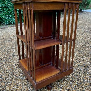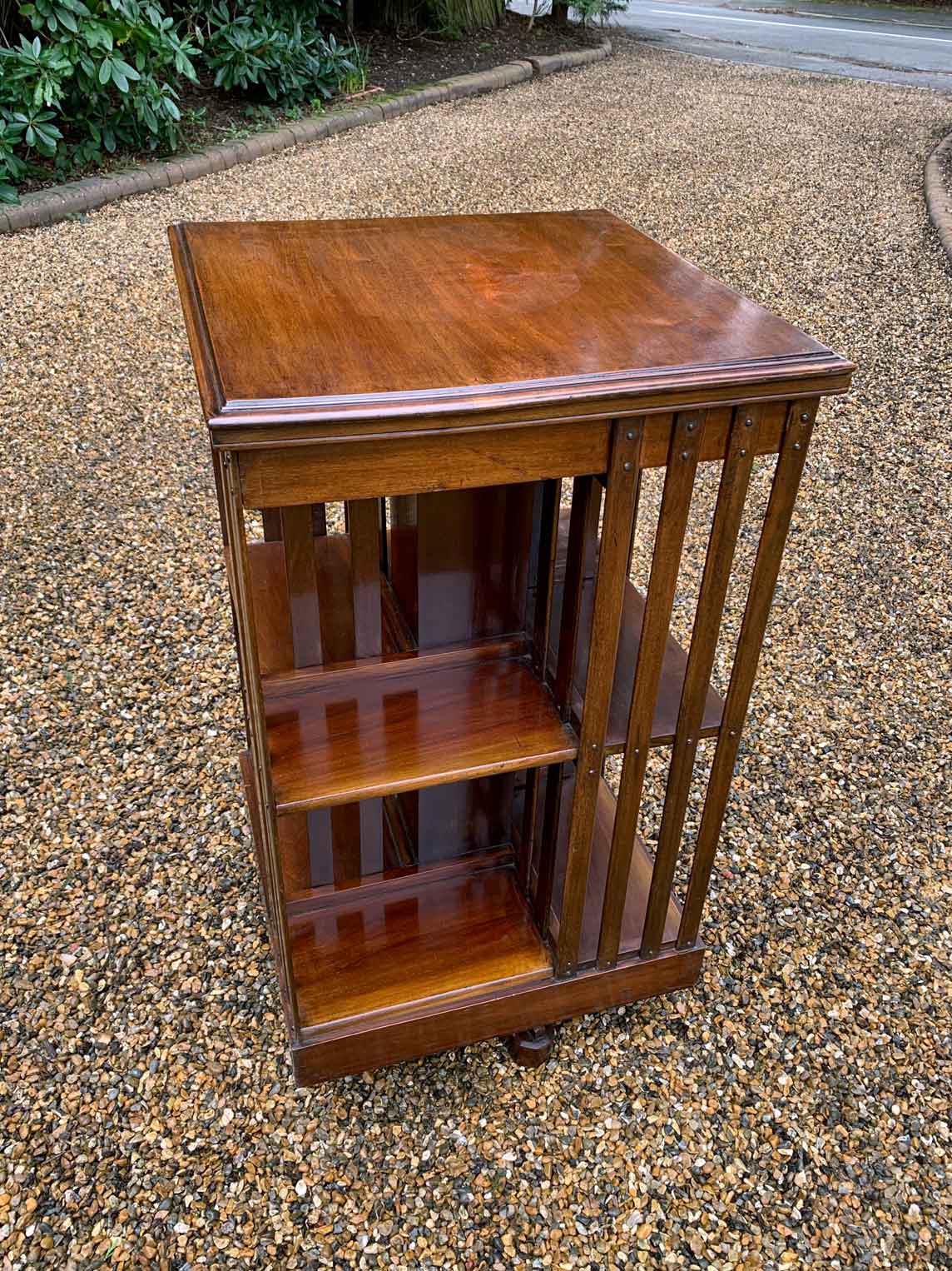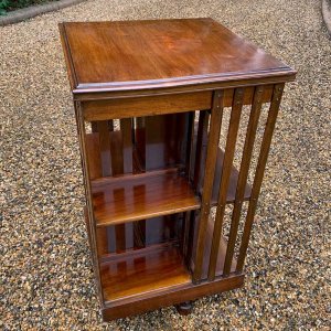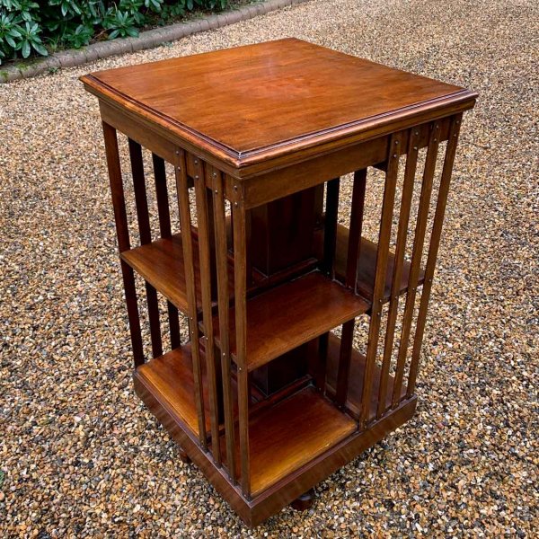19th Century Victorian Mahogany Revolving Bookcase has two tiers of book storage and four vertical mahogany slats to each side and the revolving platform base.