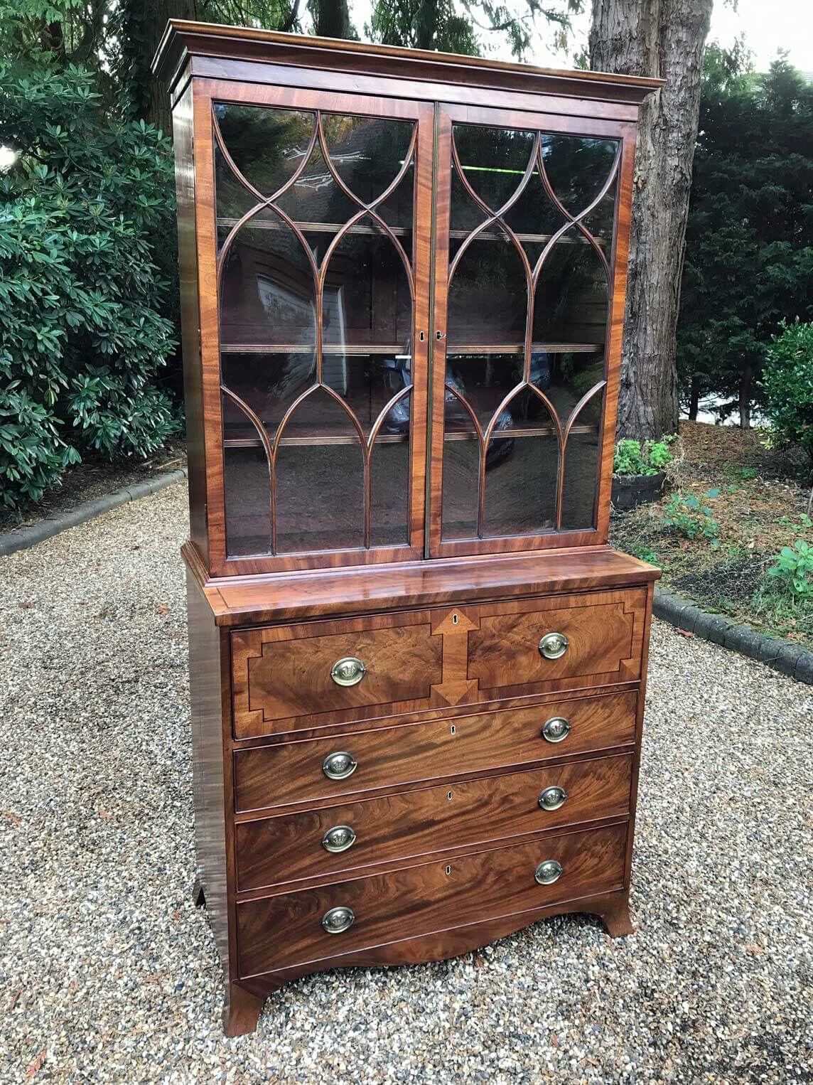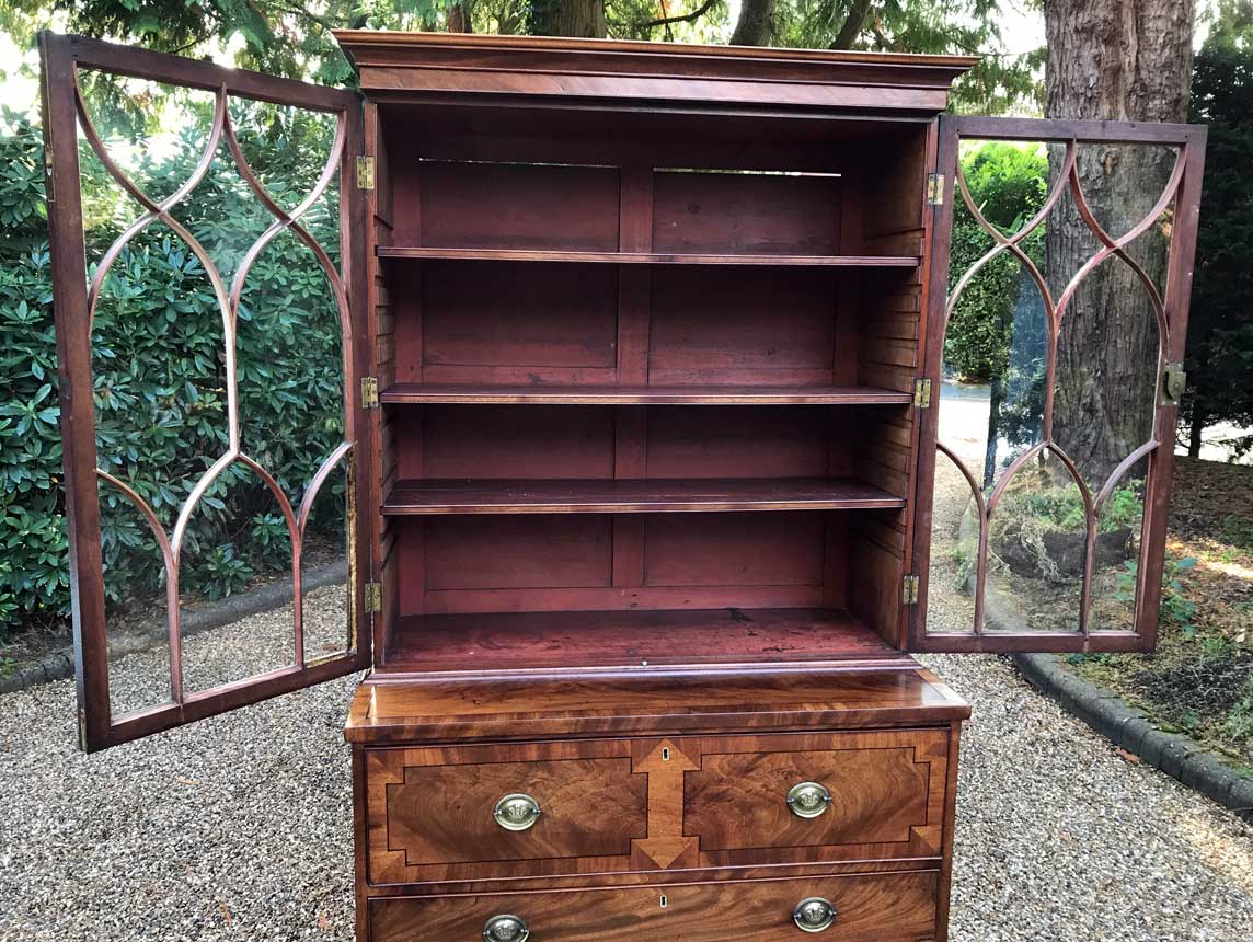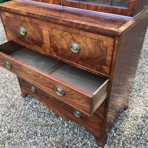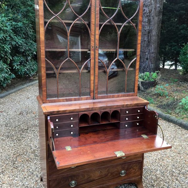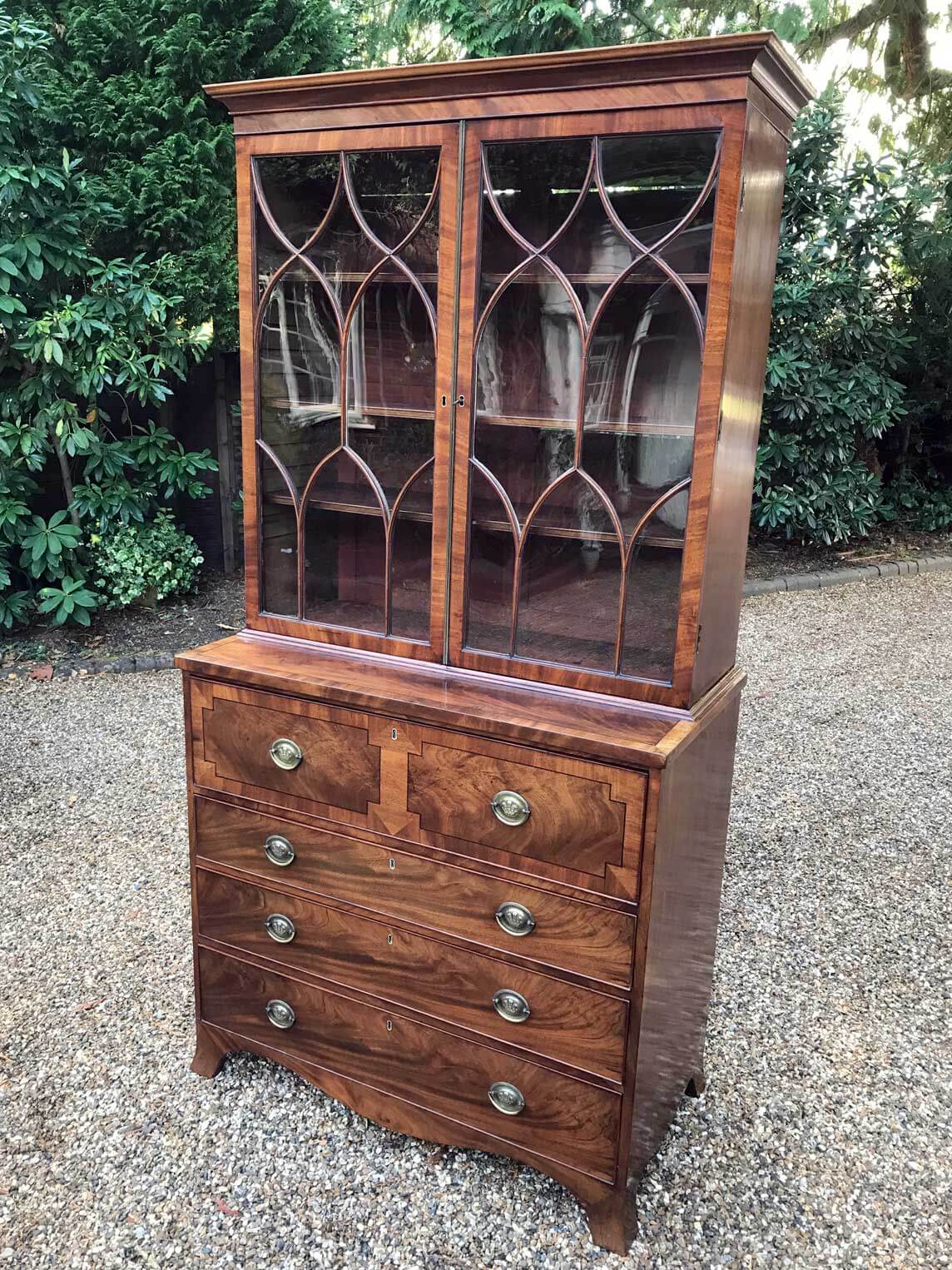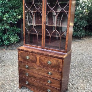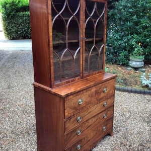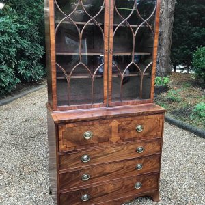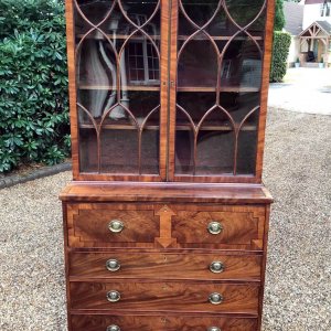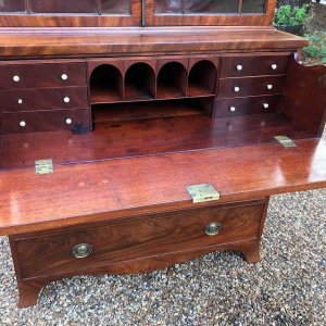 A high quality Georgian Mahogany Secretaire Bookcase Chest Of Drawers with two glazed doors over base with original sliding shelves, pull out secretaire drawer enclosing pigeon holes and drawers, over three long graduated drawers with brass handles with solid oak lined drawers on original splayed feet.