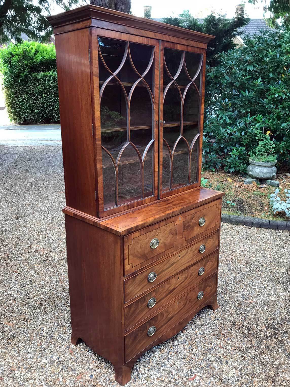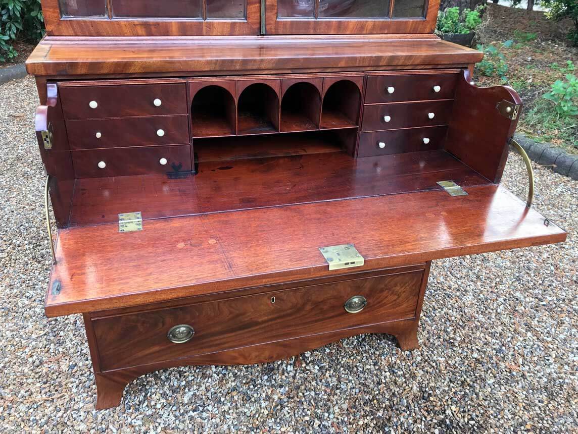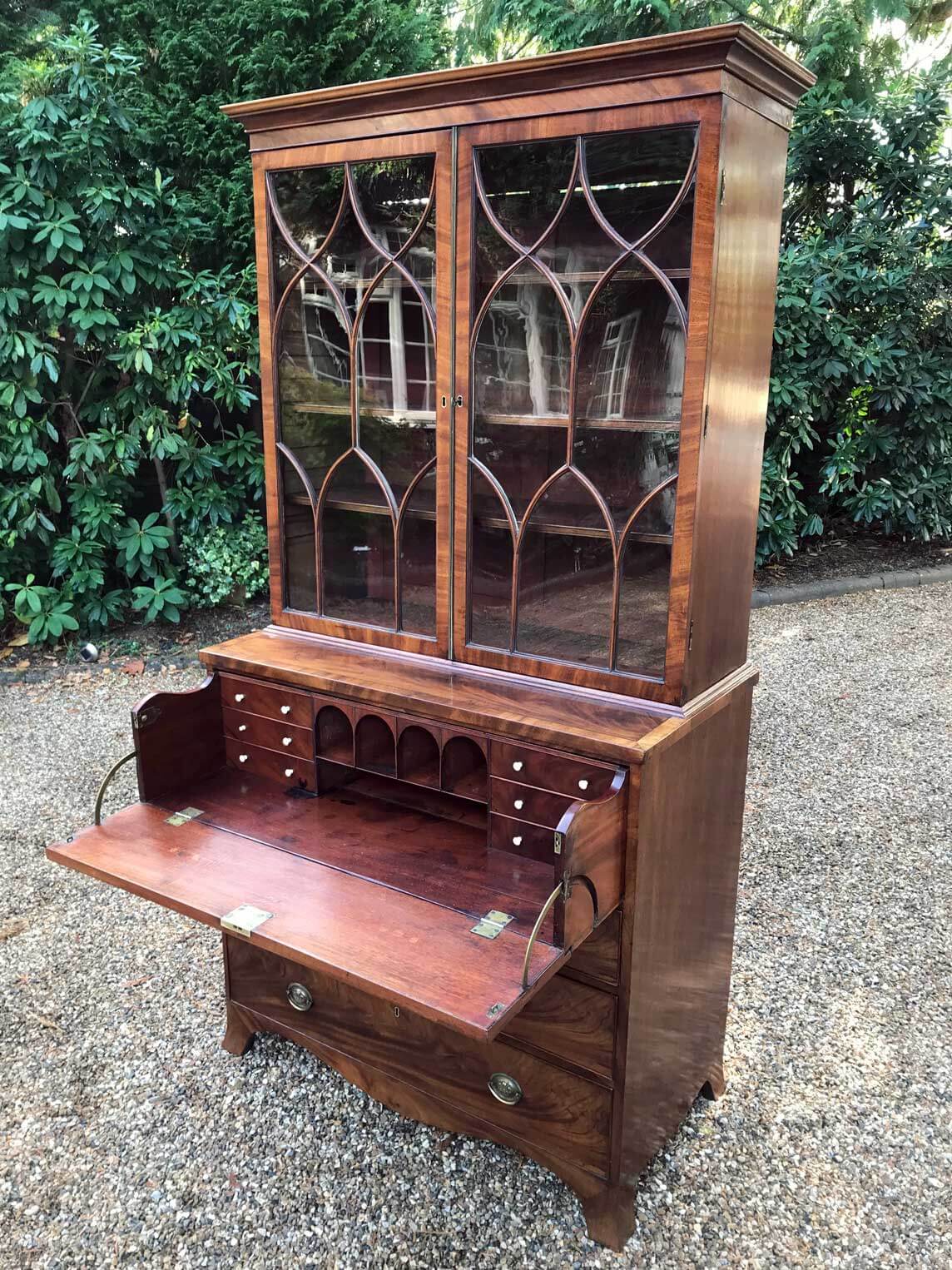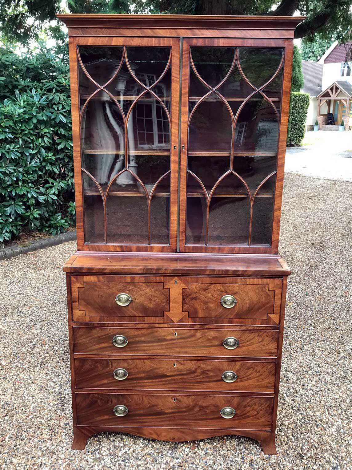 A high quality Georgian Mahogany Secretaire Bookcase Chest Of Drawers with two glazed doors over base with original sliding shelves, pull out secretaire drawer enclosing pigeon holes and drawers, over three long graduated drawers with brass handles with solid oak lined drawers on original splayed feet.