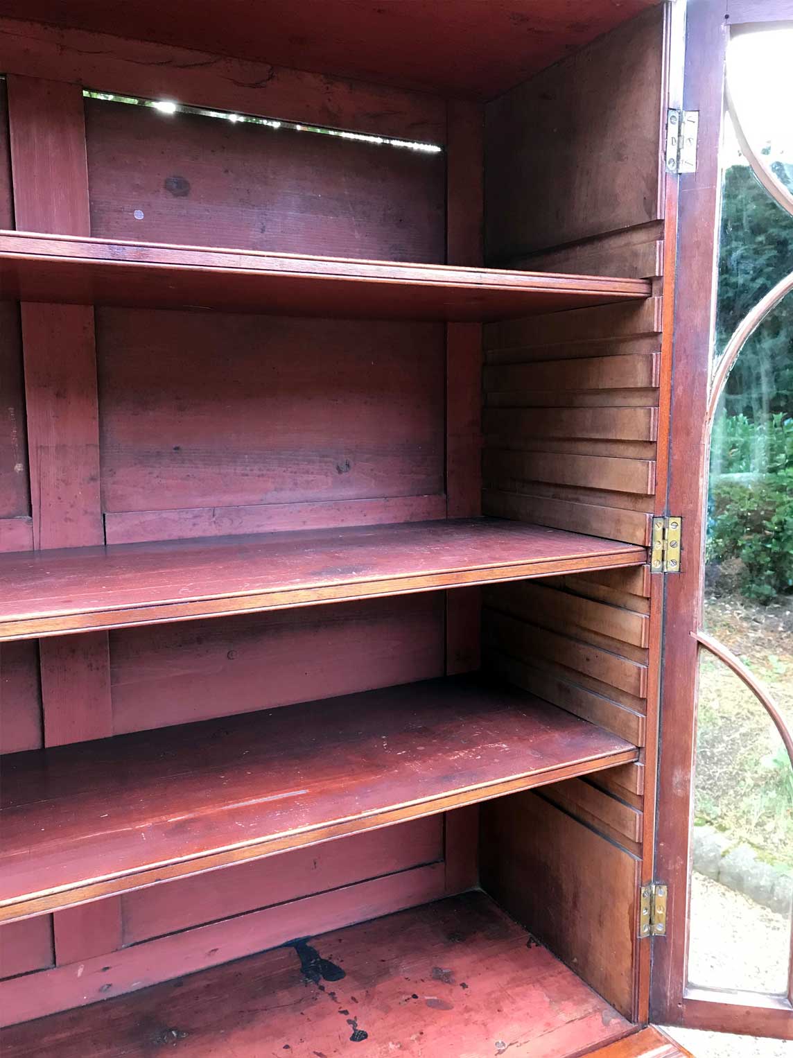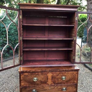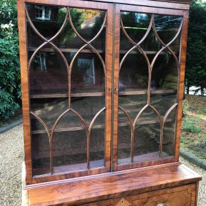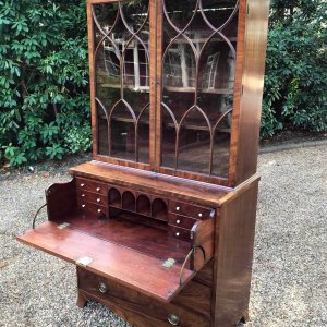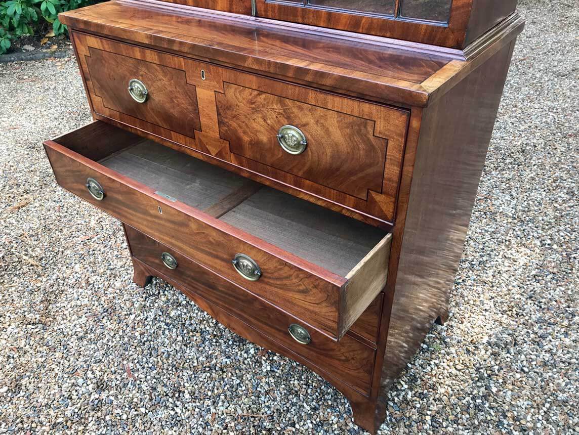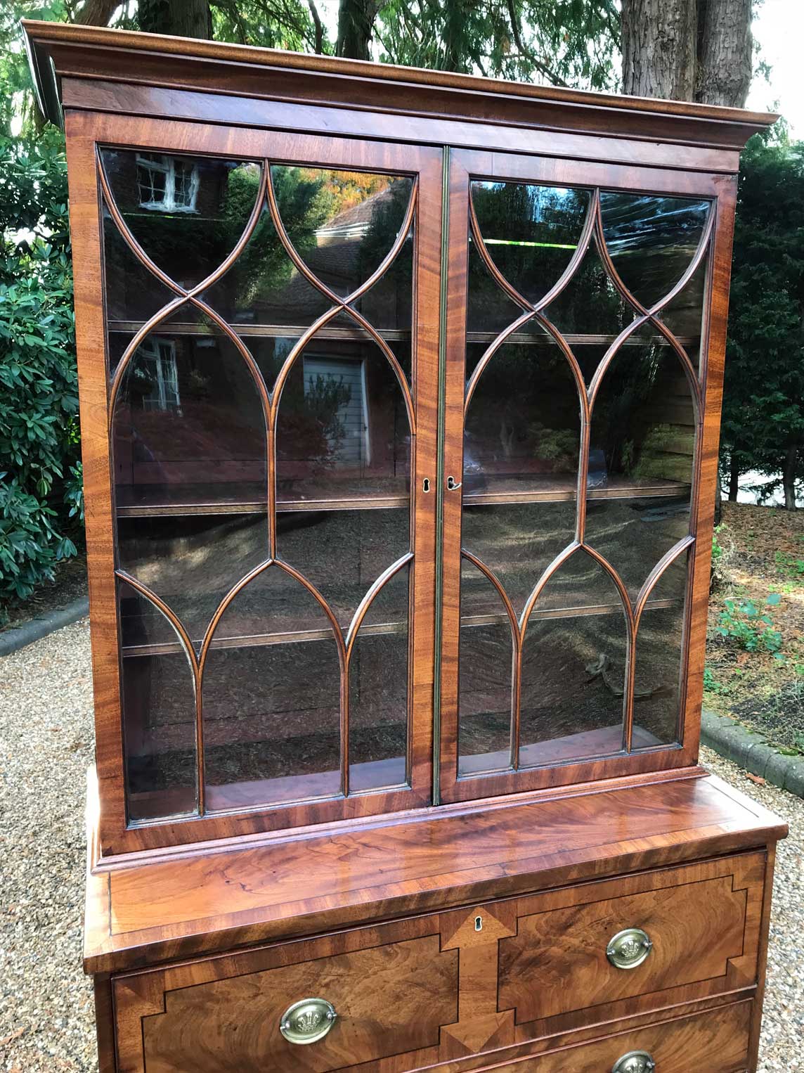 A high quality Georgian Mahogany Secretaire Bookcase Chest Of Drawers with two glazed doors over base with original sliding shelves, pull out secretaire drawer enclosing pigeon holes and drawers, over three long graduated drawers with brass handles with solid oak lined drawers on original splayed feet.