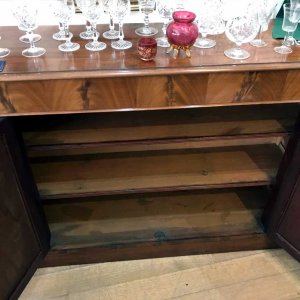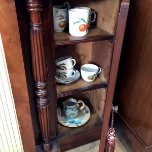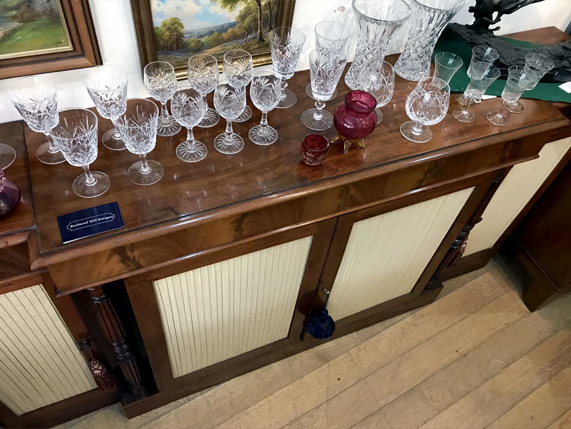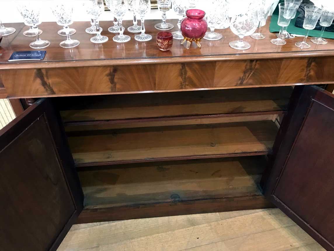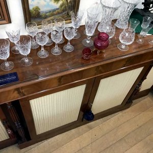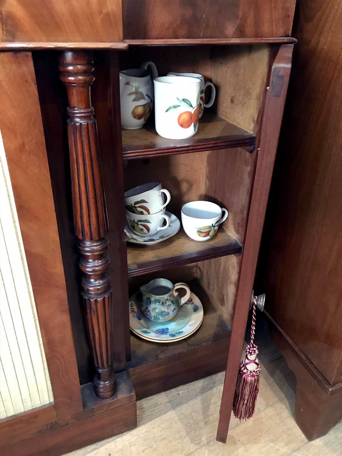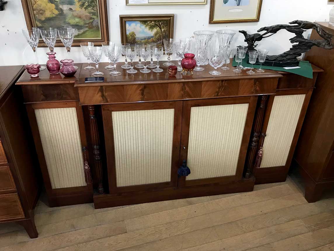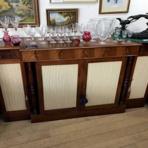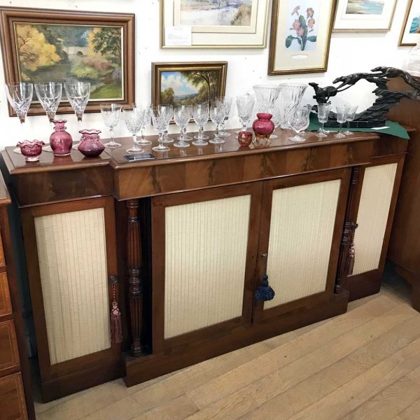 Regency 19th Century Breakfront Side Cabinet with reeded turned columns and four silk lined cupboards on a plinth base.