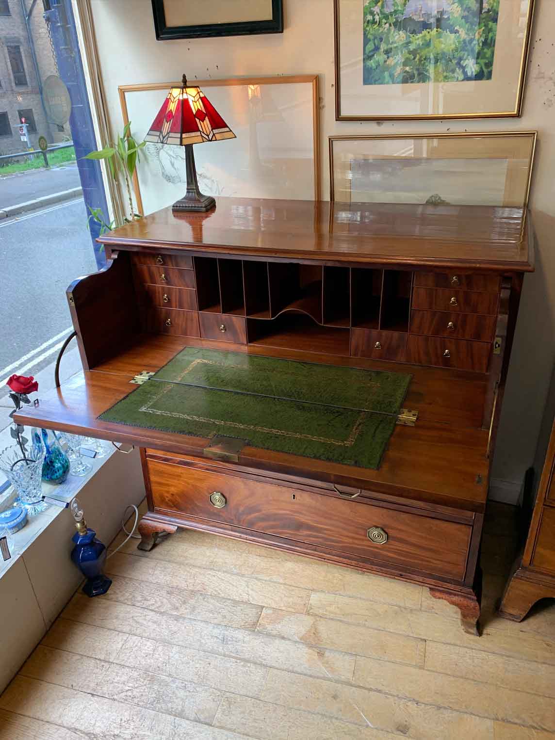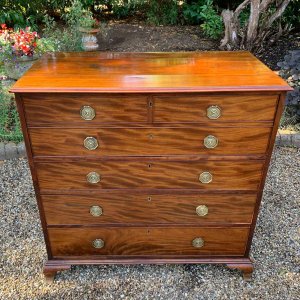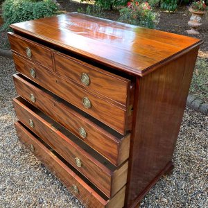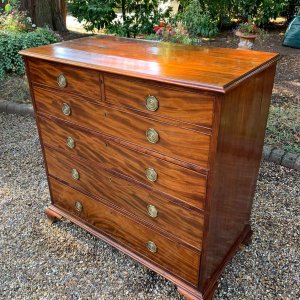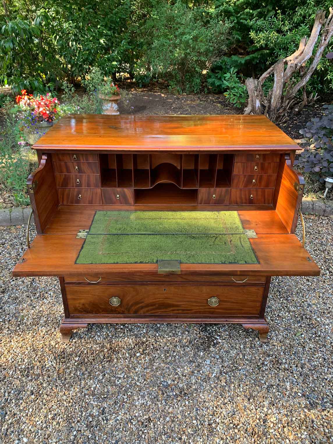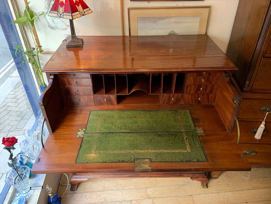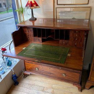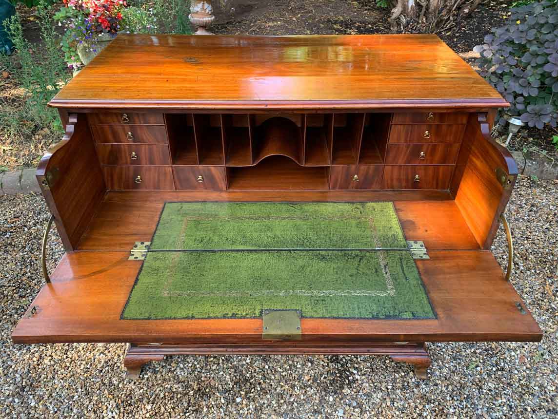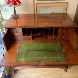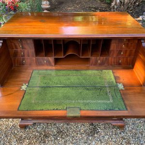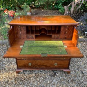 The Secretaire has the fitted desk drawer over three long drawers and solid brass ring handles, with figured mahogany throughout. The interior has a green leather writing surface with ten strung drawers and eight pigeon holes. The chest stands on four ogee shaped feet and has a moulded edge to the top.