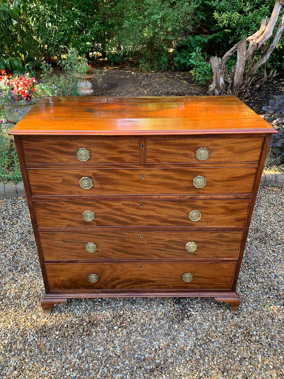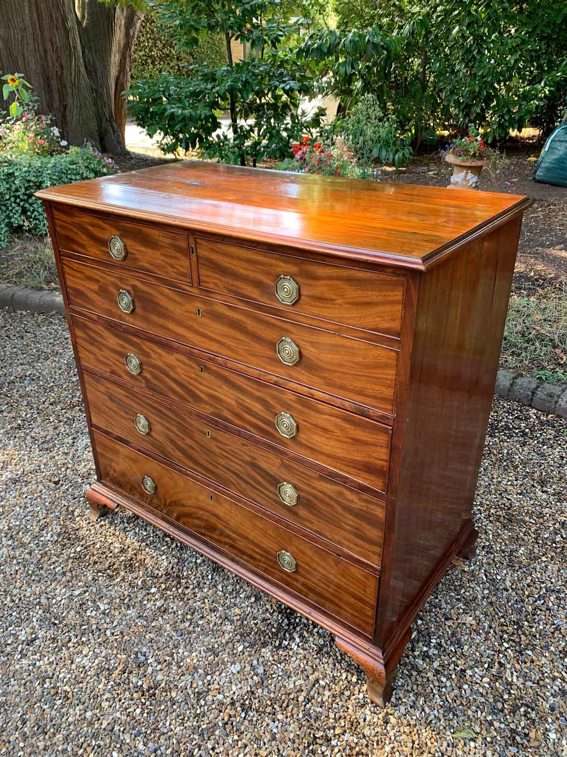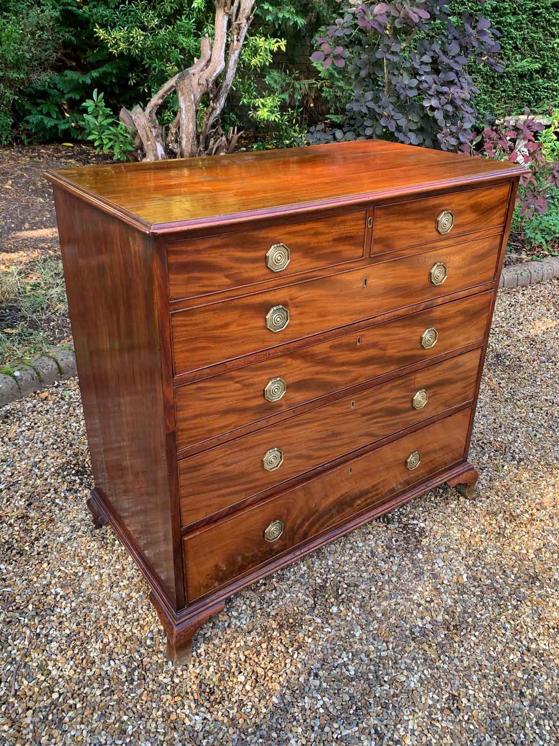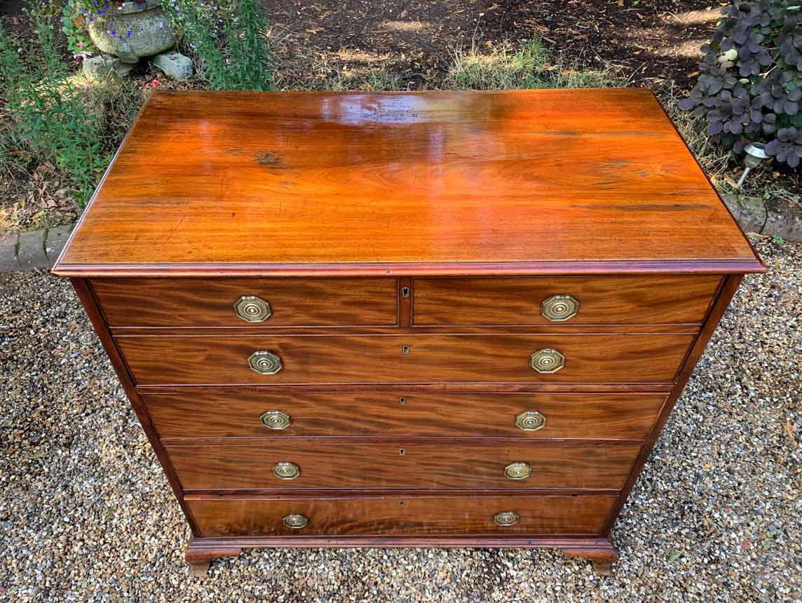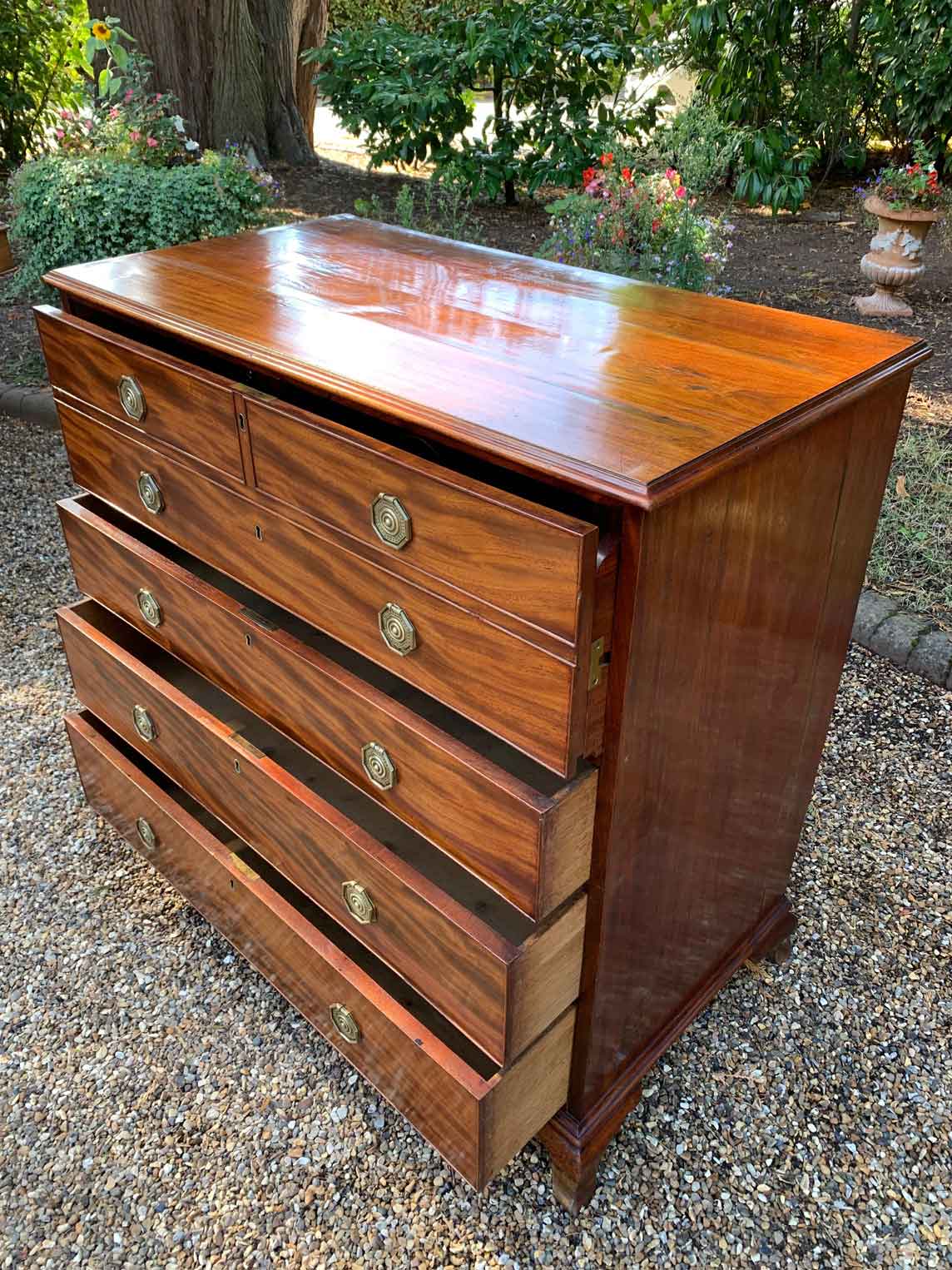 The Secretaire has the fitted desk drawer over three long drawers and solid brass ring handles, with figured mahogany throughout. The interior has a green leather writing surface with ten strung drawers and eight pigeon holes. The chest stands on four ogee shaped feet and has a moulded edge to the top.