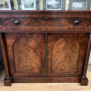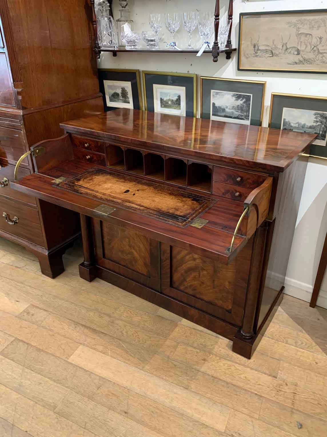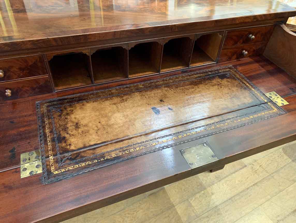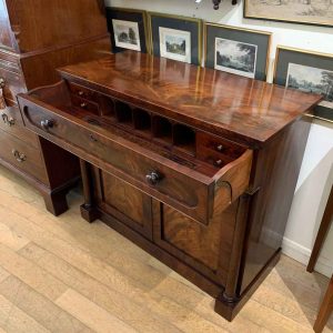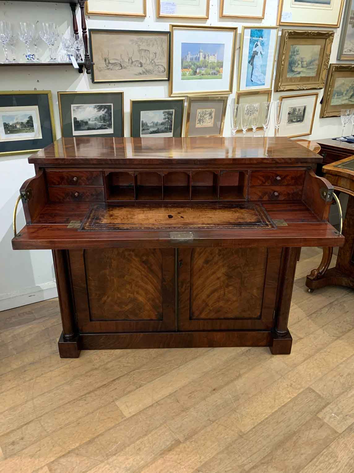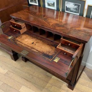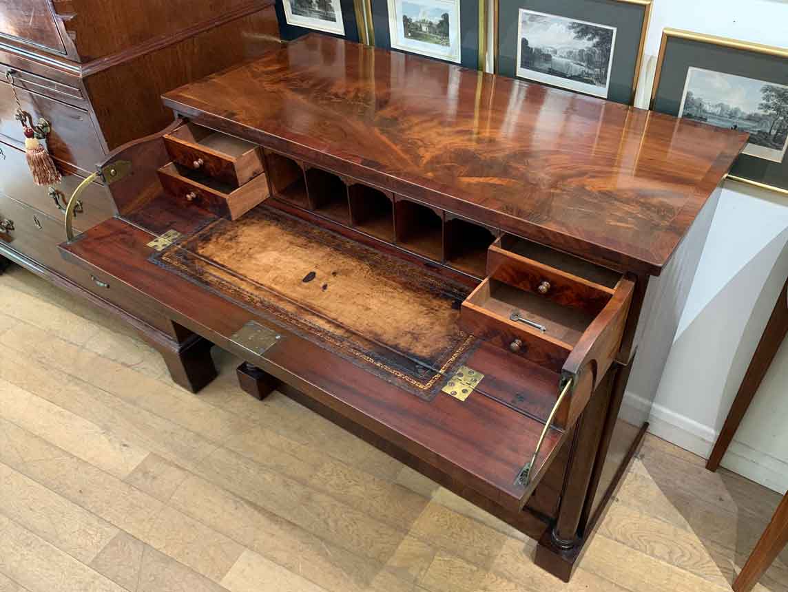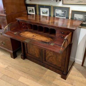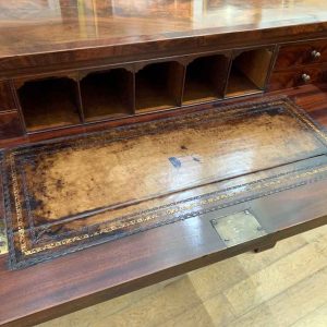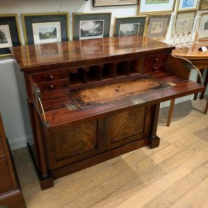 The Secretaire has the a fitted desk drawer over a pair of cupboards, with figured mahogany throughout. The drawer interior has a leathered writing surface with four strung drawers and five pigeon holes. The secretaire has two turned columns either side of the shaped cupboard doors – enclosing an inside shelf. Stands on plinth base. With key.