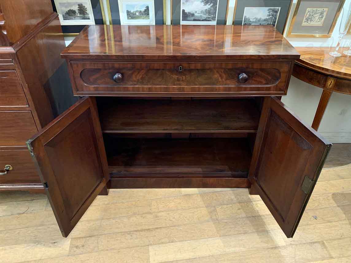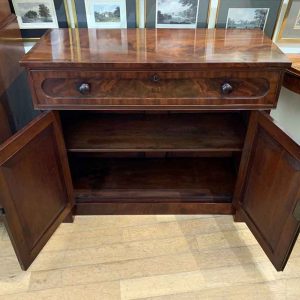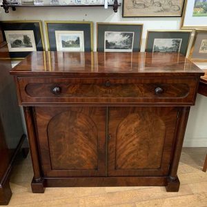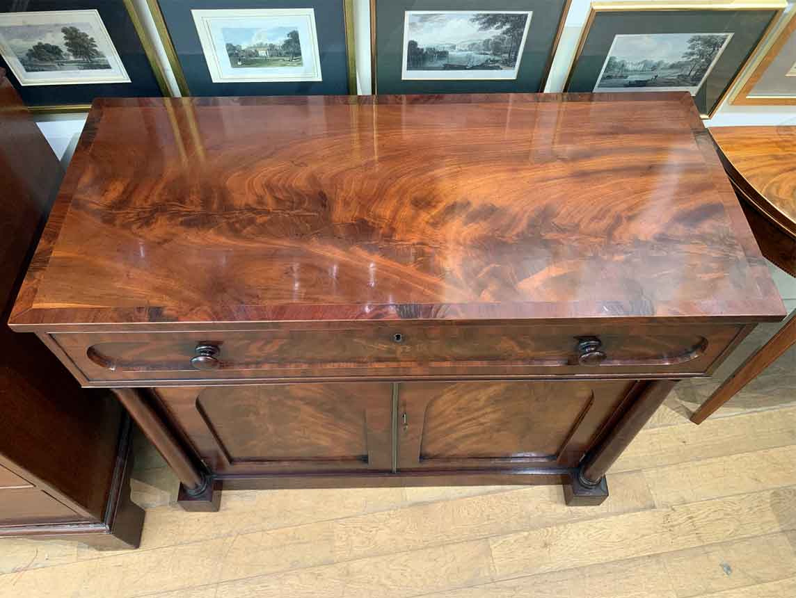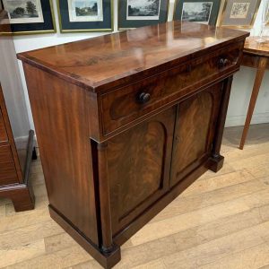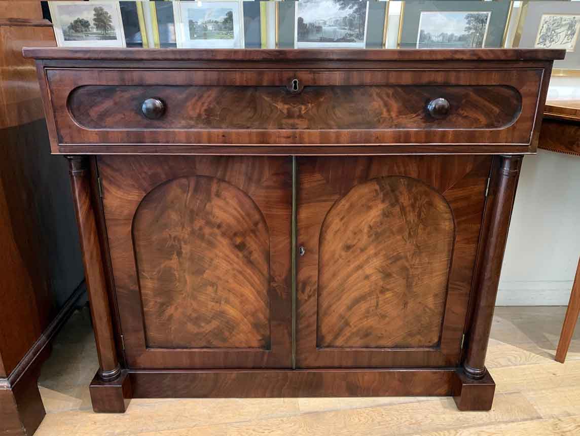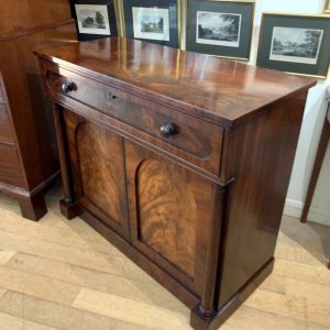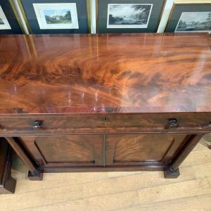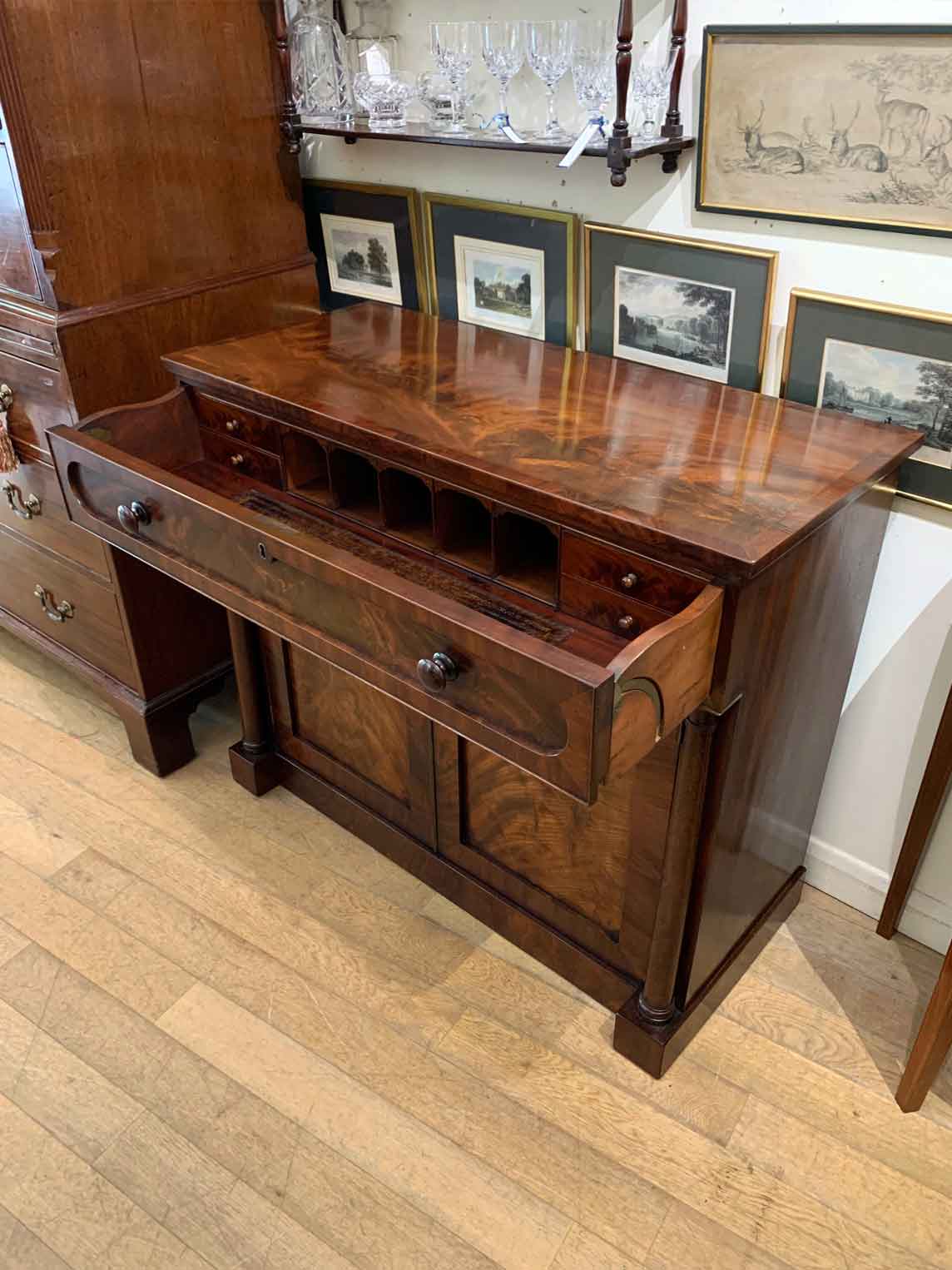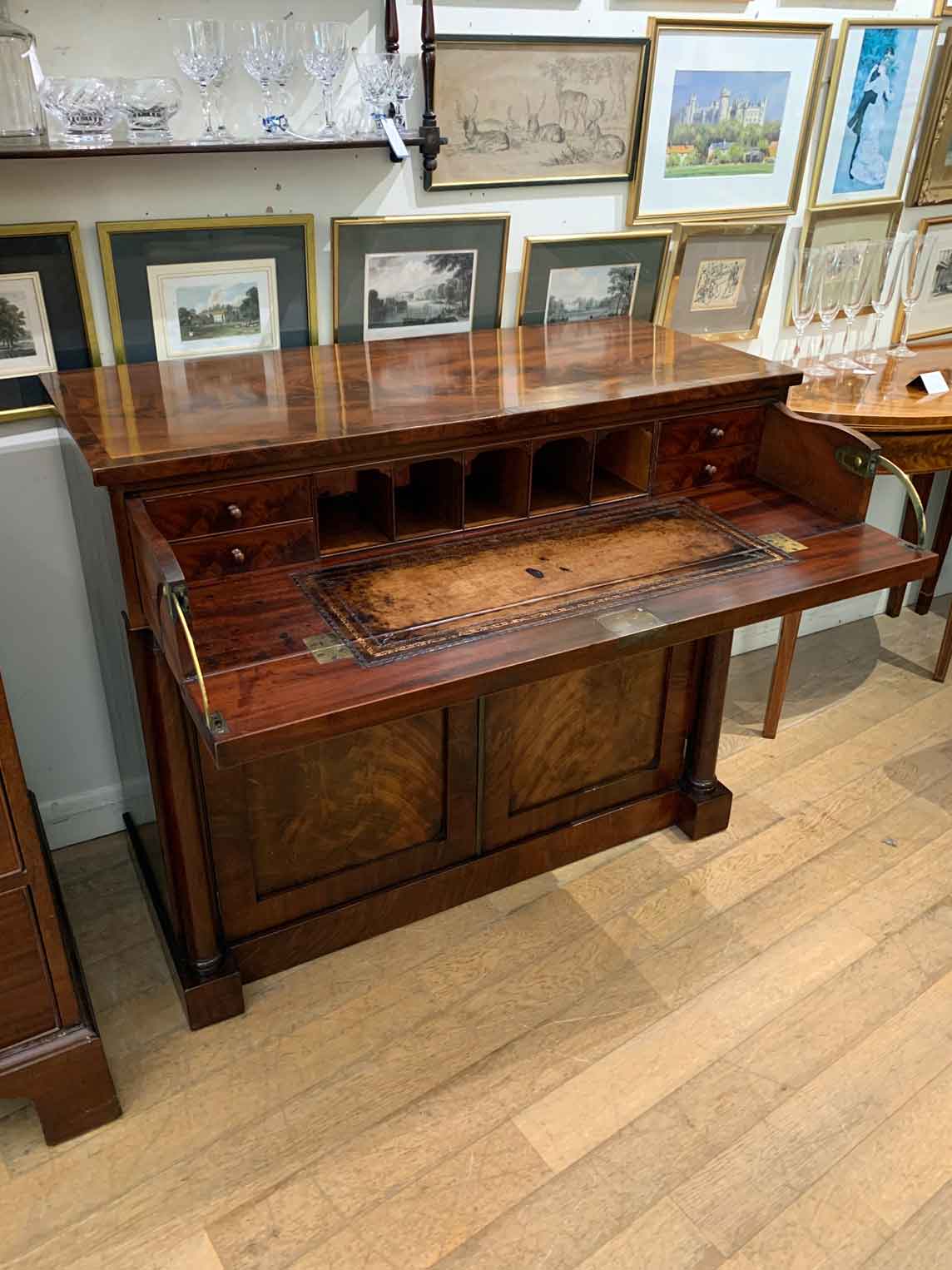 The Secretaire has the a fitted desk drawer over a pair of cupboards, with figured mahogany throughout. The drawer interior has a leathered writing surface with four strung drawers and five pigeon holes. The secretaire has two turned columns either side of the shaped cupboard doors – enclosing an inside shelf. Stands on plinth base. With key.