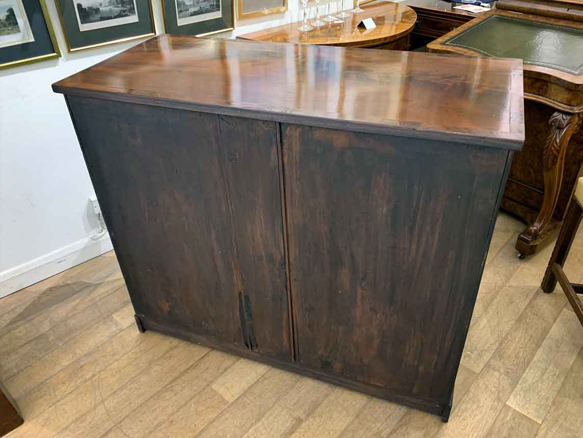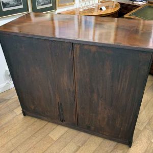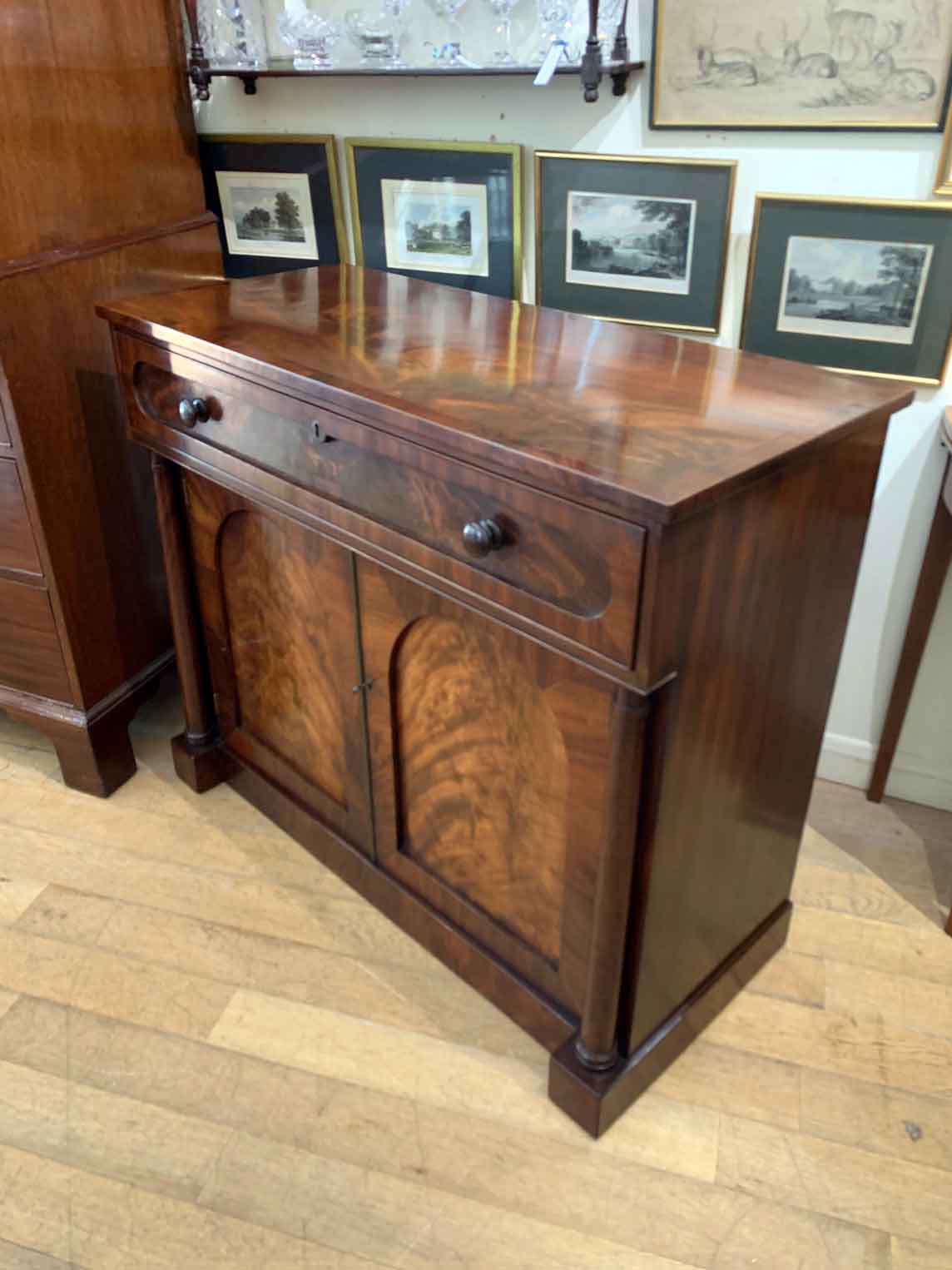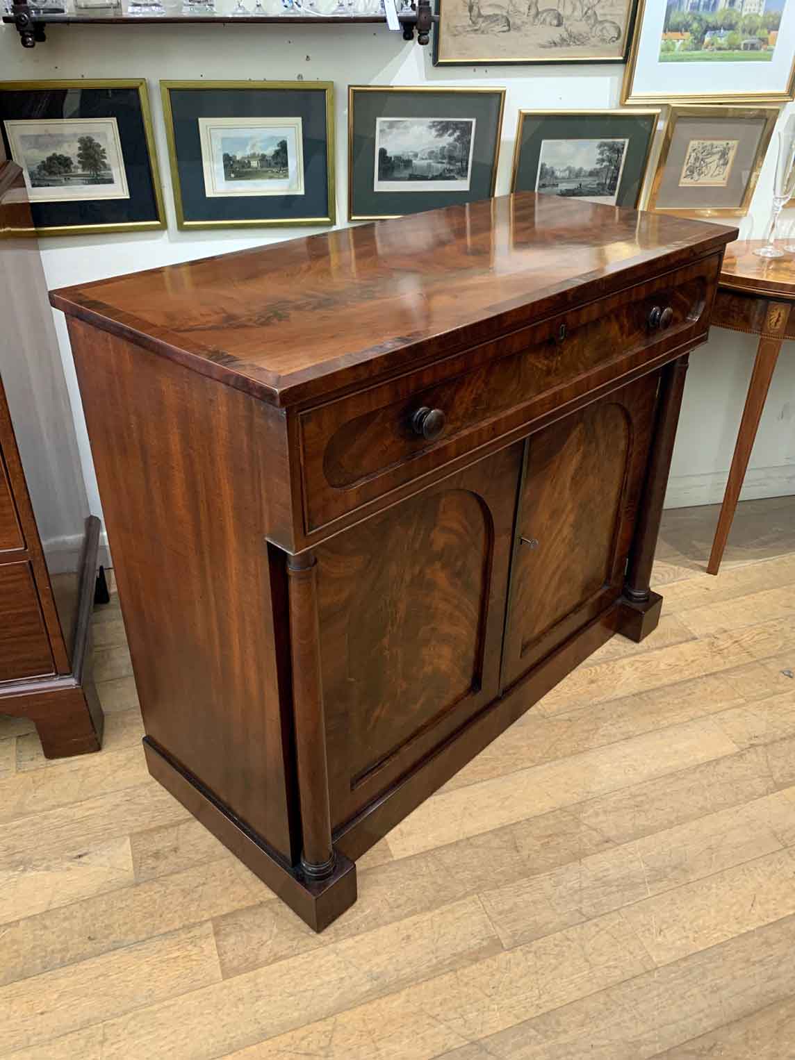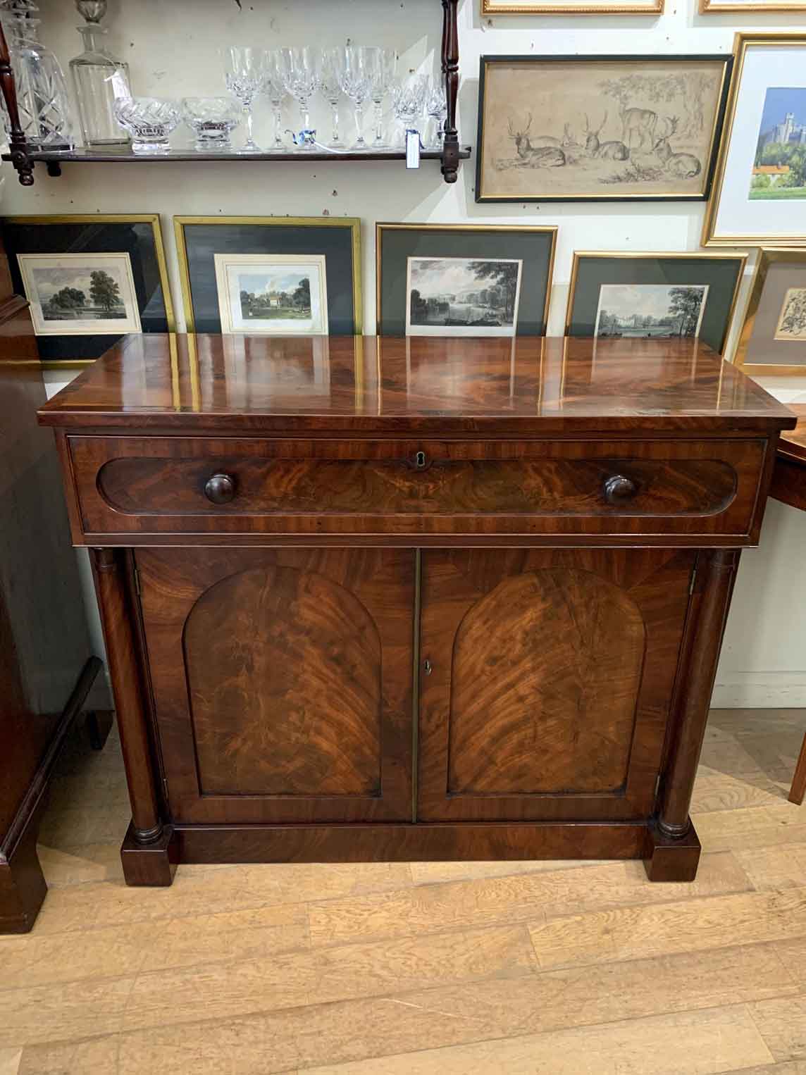 The Secretaire has the a fitted desk drawer over a pair of cupboards, with figured mahogany throughout. The drawer interior has a leathered writing surface with four strung drawers and five pigeon holes. The secretaire has two turned columns either side of the shaped cupboard doors – enclosing an inside shelf. Stands on plinth base. With key.