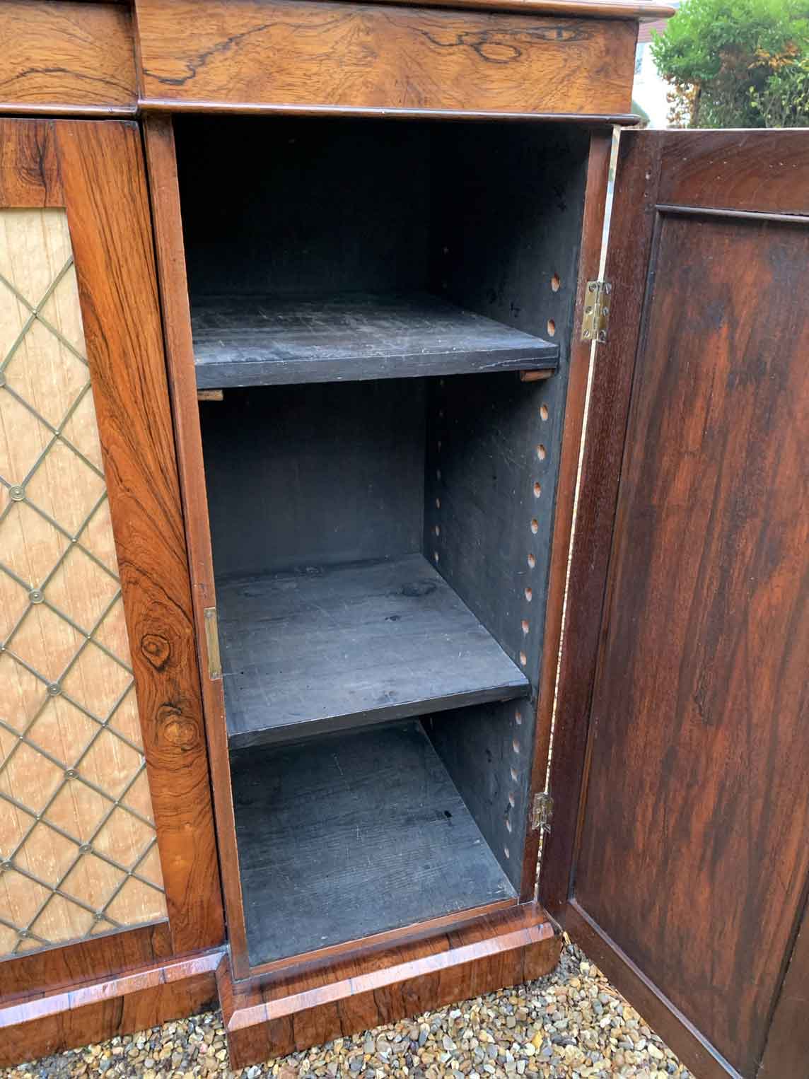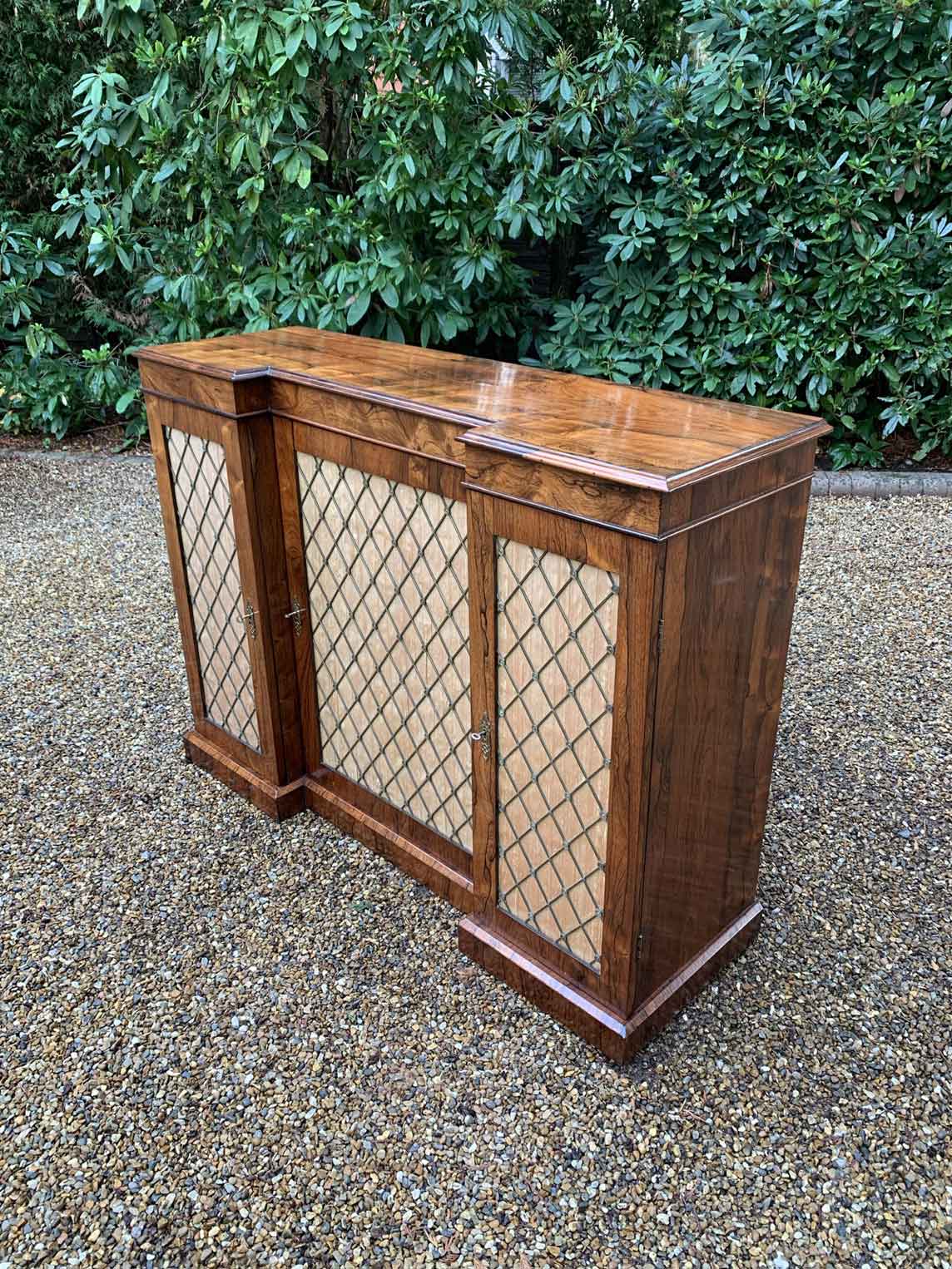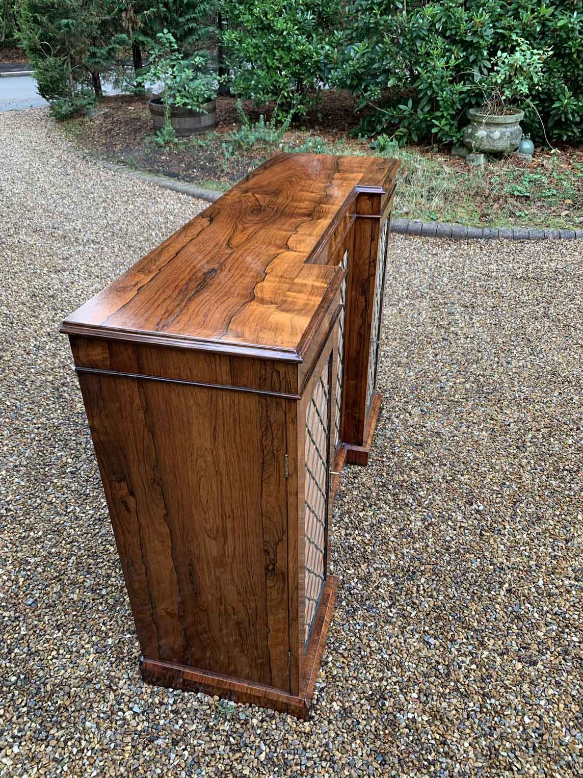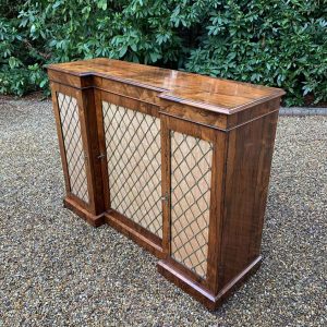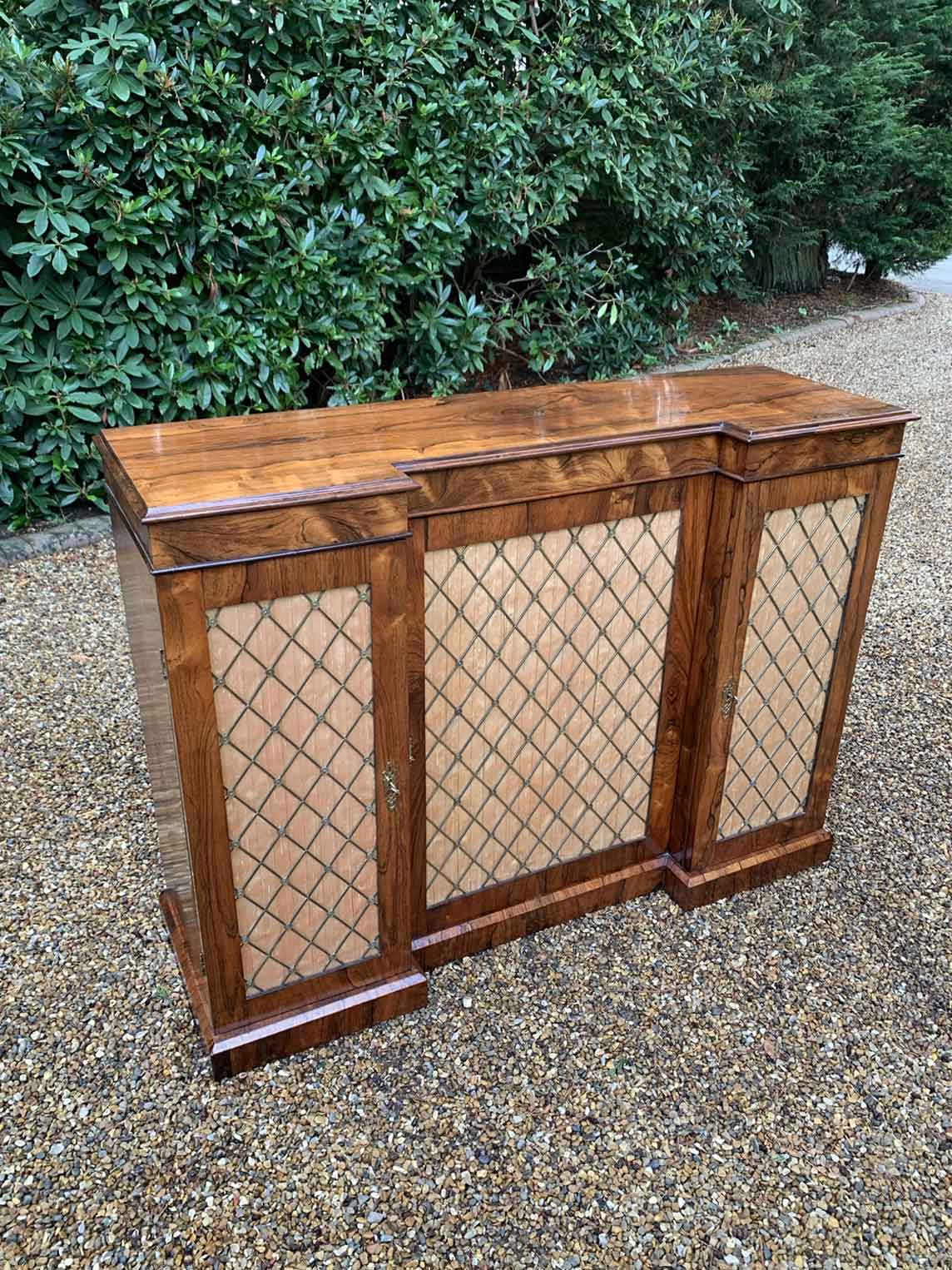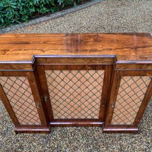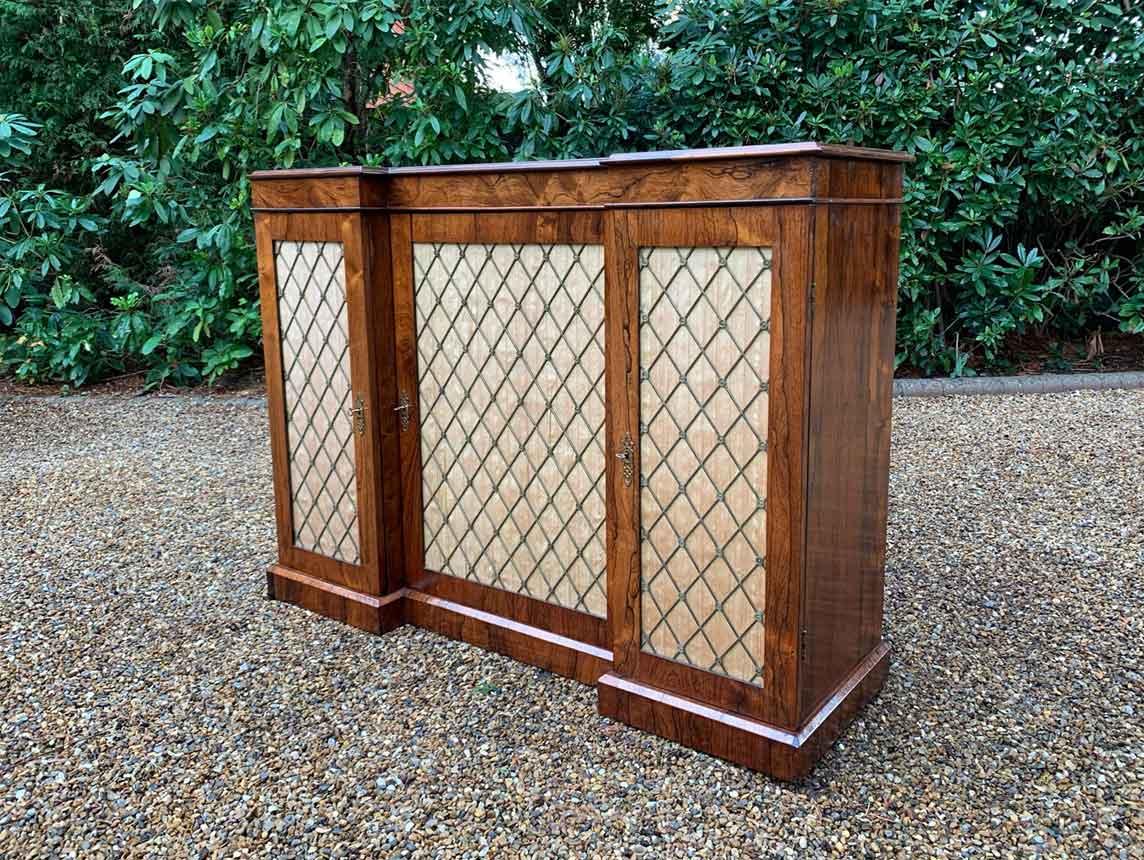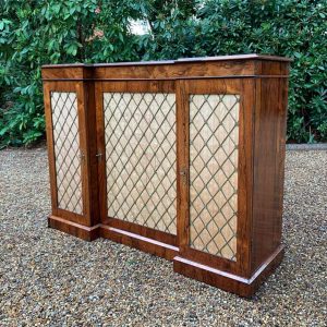 A very high quality original 19th Century Regency Rosewood Inverted Breakfront Side Cabinet fitted with three doors inset with gilt metal trellis panels, silk lined cupboards with adjustable shelves on a plinth base. With working keys.