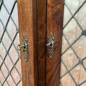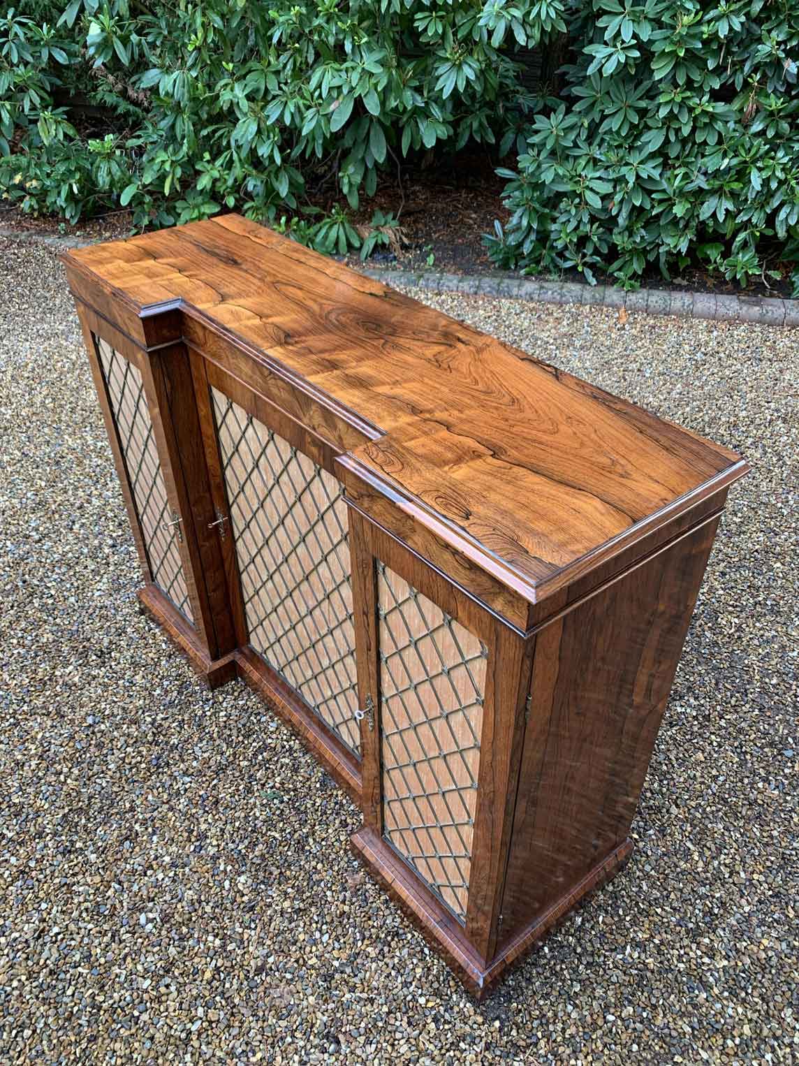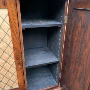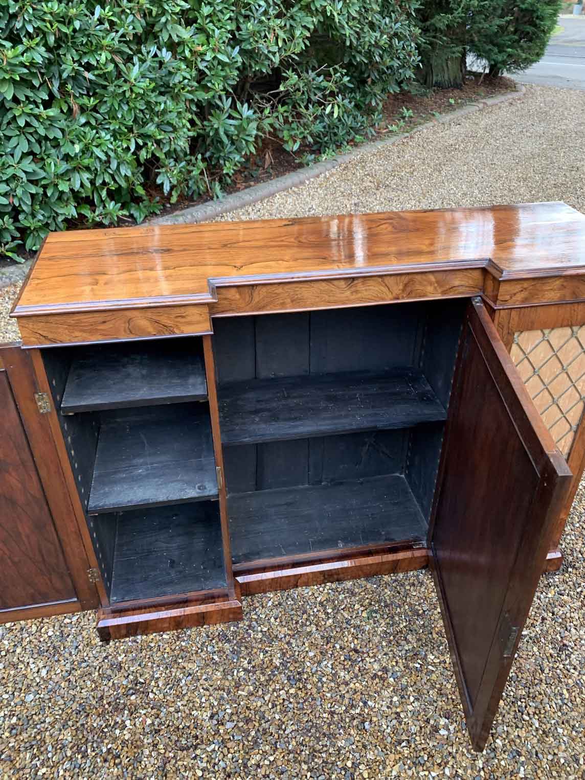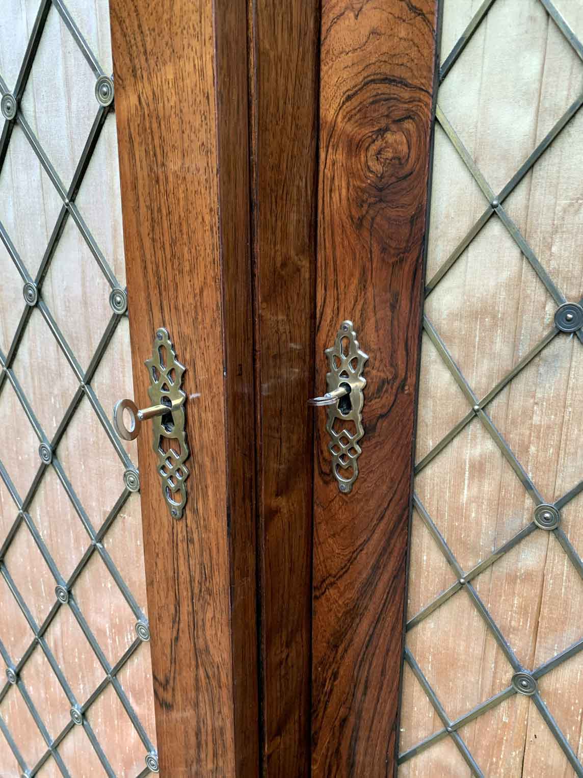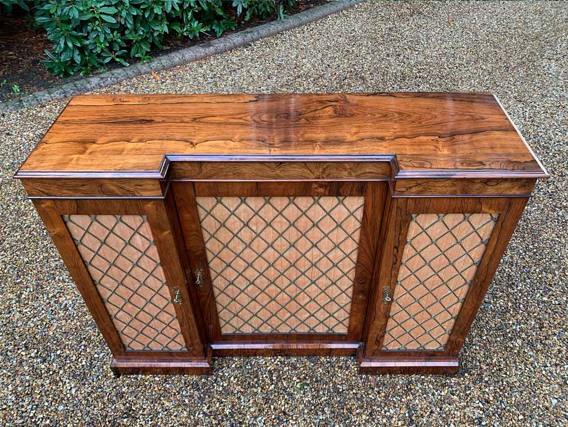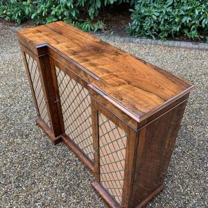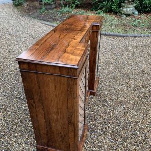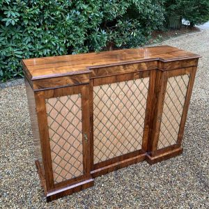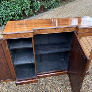 A very high quality original 19th Century Regency Rosewood Inverted Breakfront Side Cabinet fitted with three doors inset with gilt metal trellis panels, silk lined cupboards with adjustable shelves on a plinth base. With working keys.