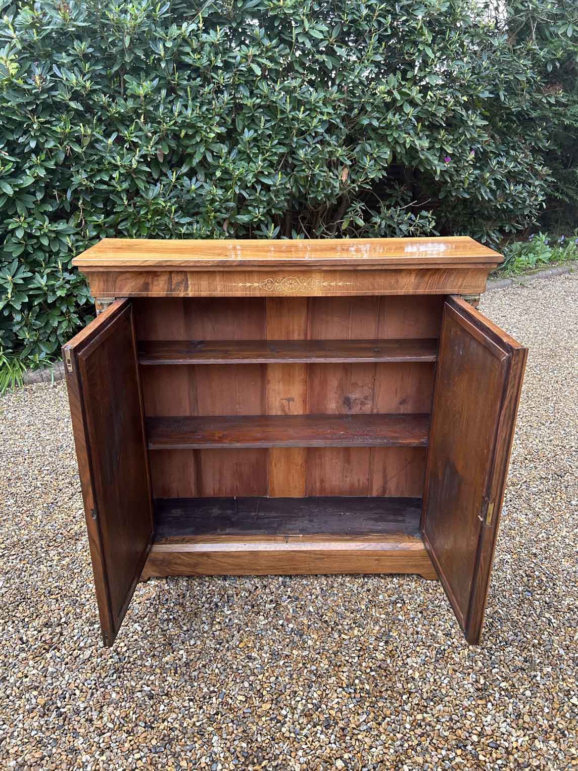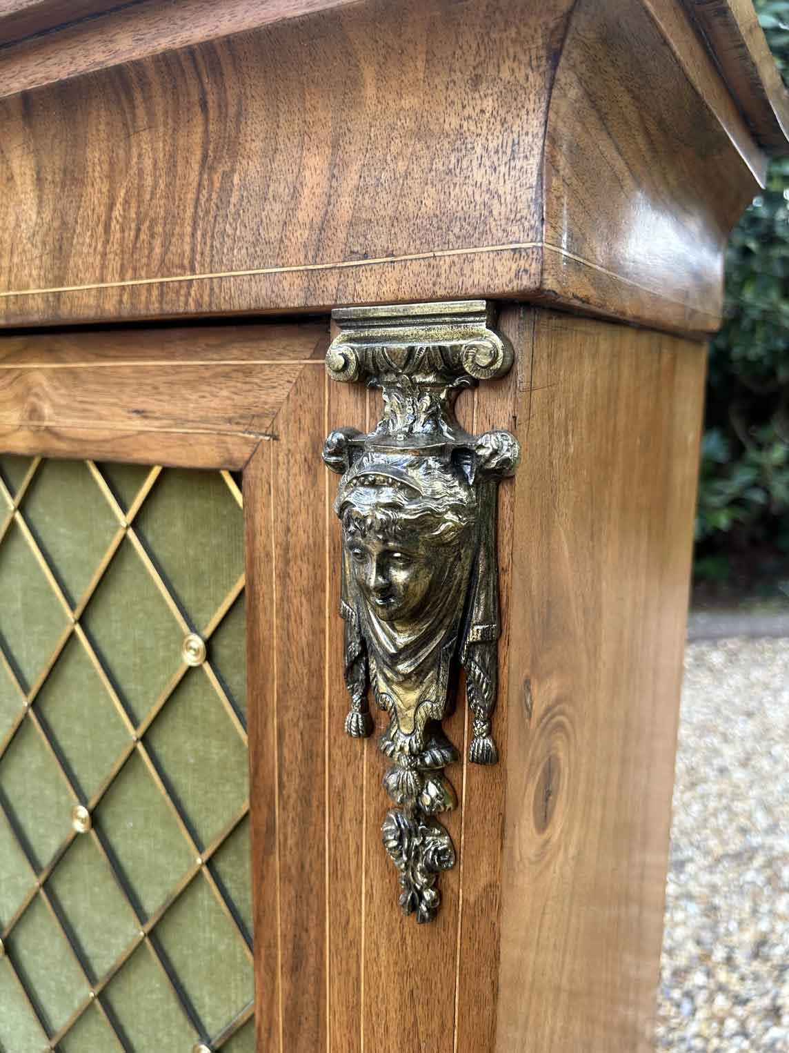 A good quality 19th Century Victorian Figured Walnut Inlaid Side Cabinet/Credenza fitted with two doors, gilt metal mounts / trellis panels, two fitted shelves on a plinth base. With working key.