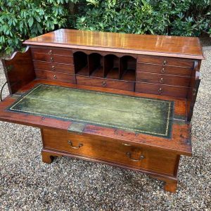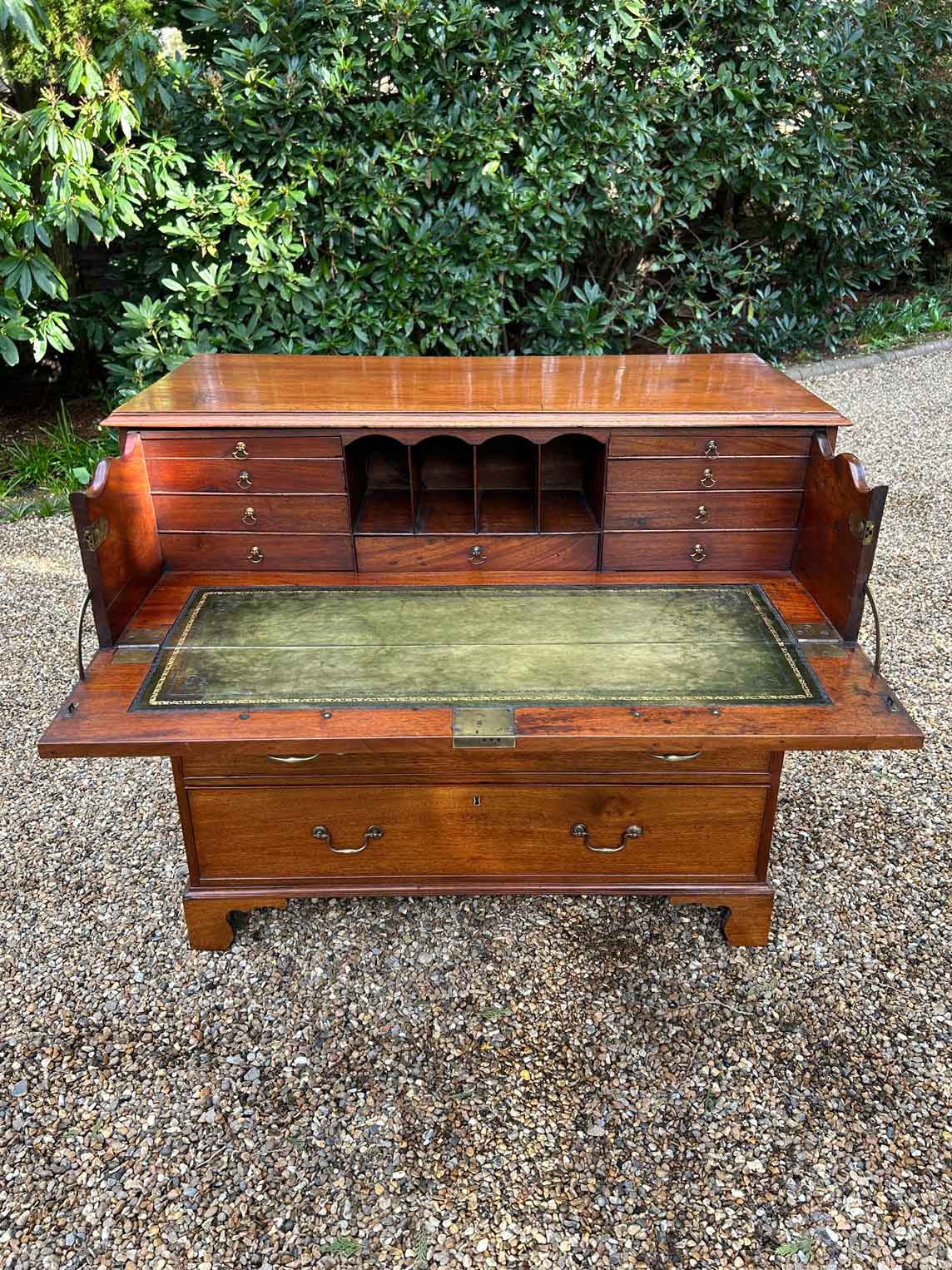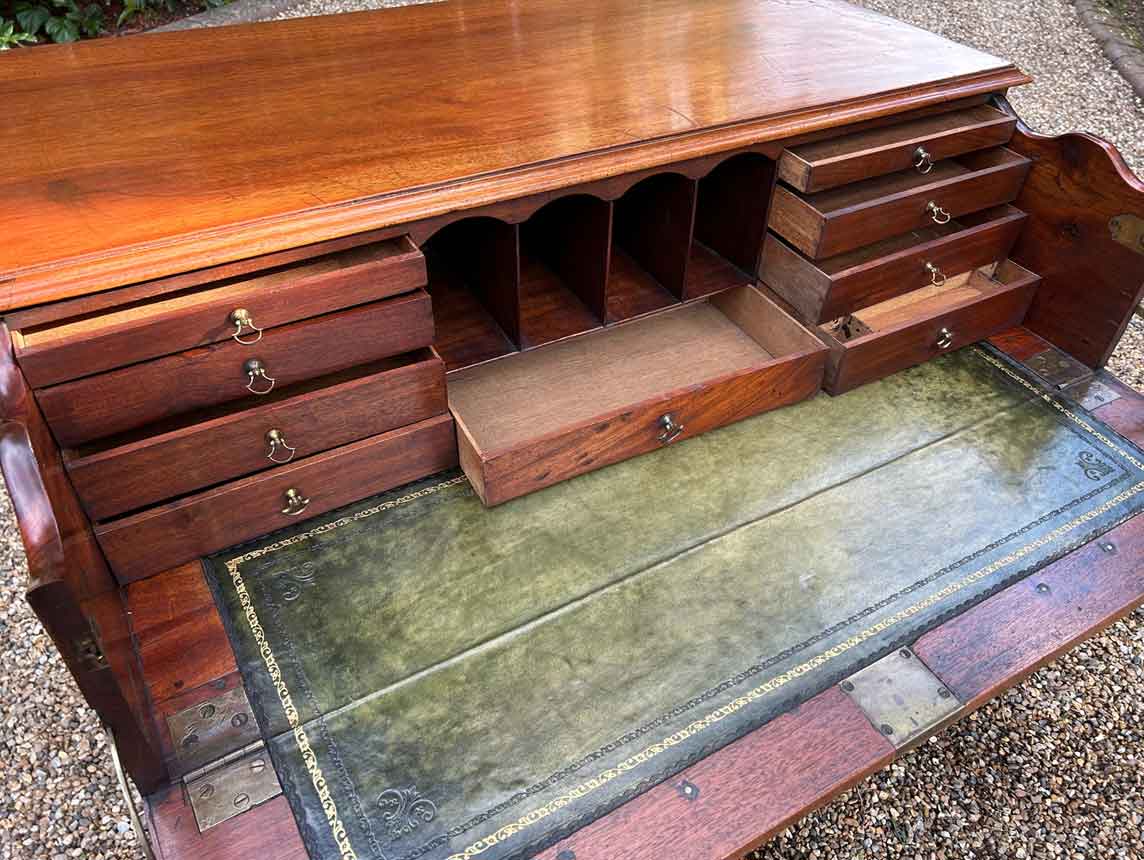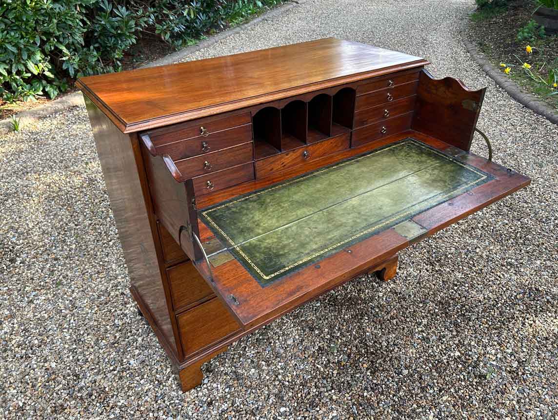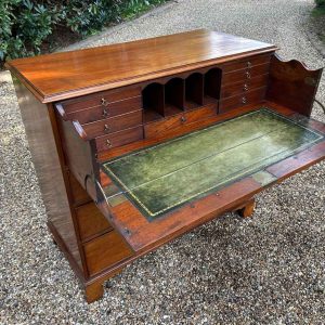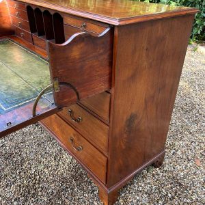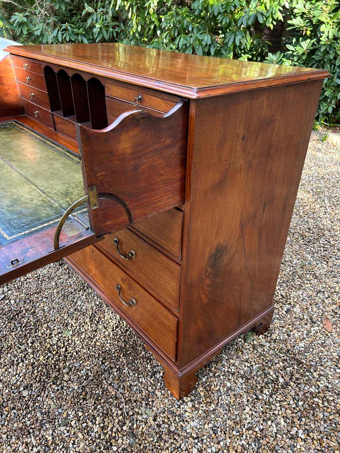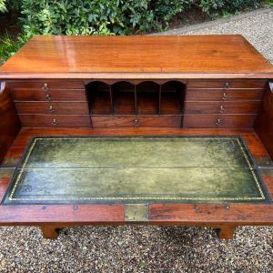 The 18th Century Secretaire has a fitted desk drawer over three long drawers with brass swan neck handles. The fitted desk drawer interior has a green leathered writing surface with 9 strung drawers and 4 pigeon holes. Stands on four bracket feet.