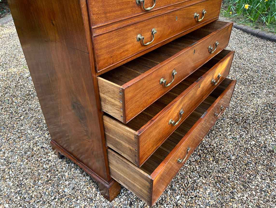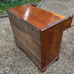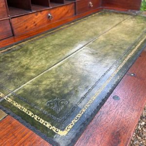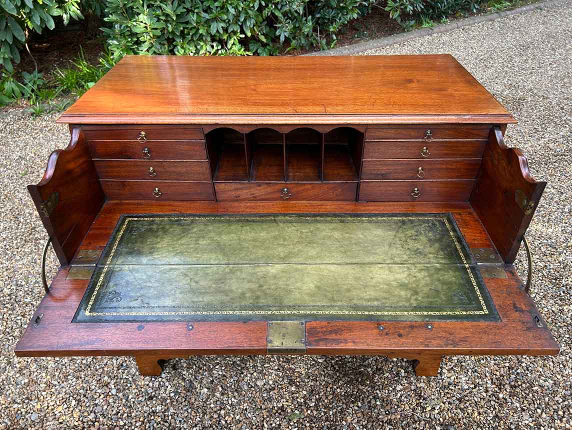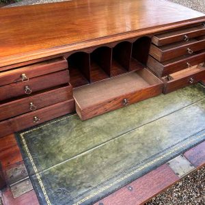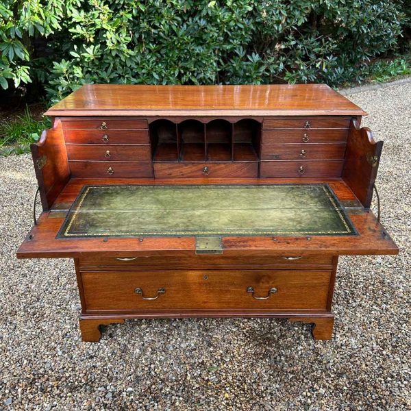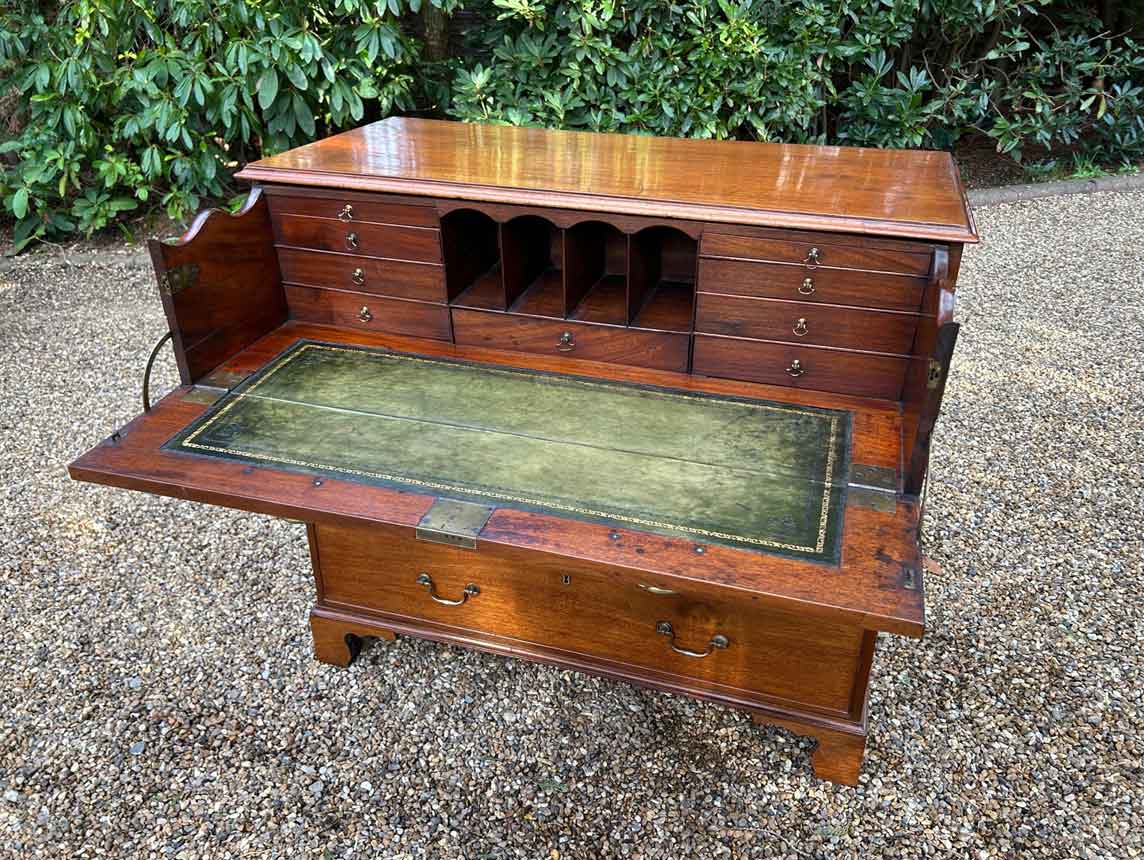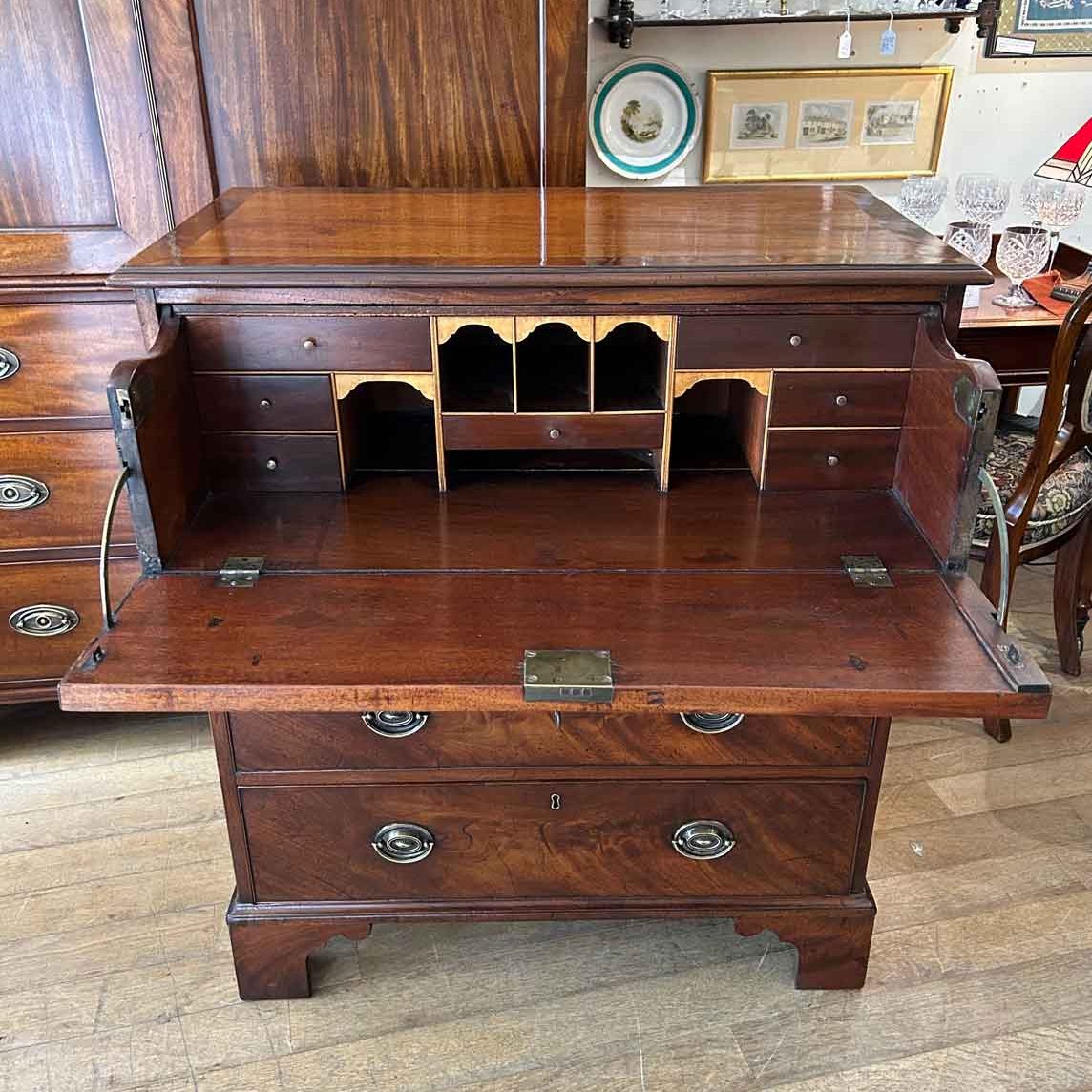 The 18th Century Secretaire has a fitted desk drawer over three long drawers with brass swan neck handles. The fitted desk drawer interior has a green leathered writing surface with 9 strung drawers and 4 pigeon holes. Stands on four bracket feet.