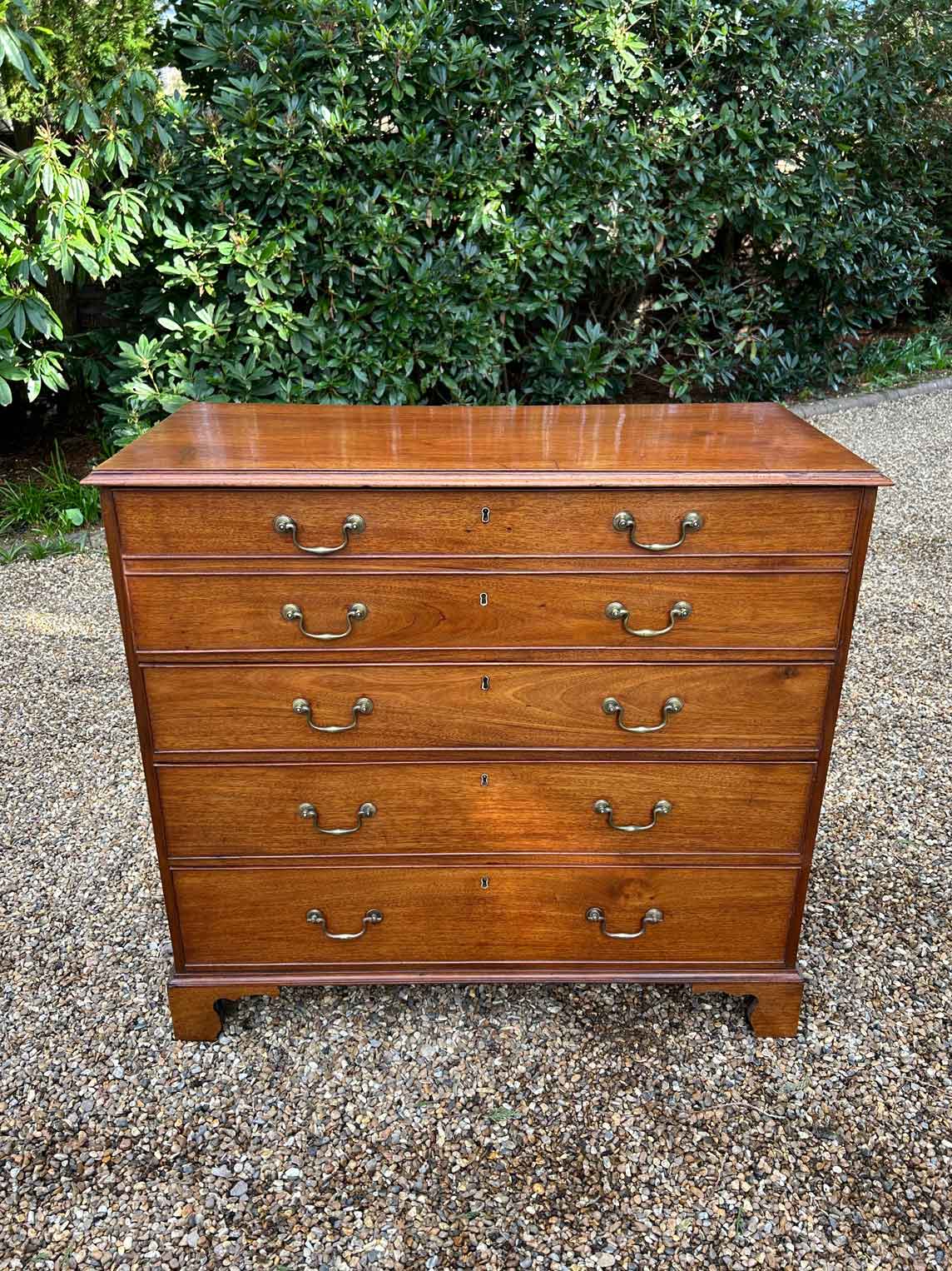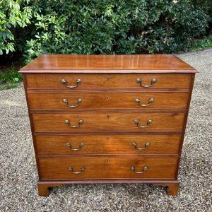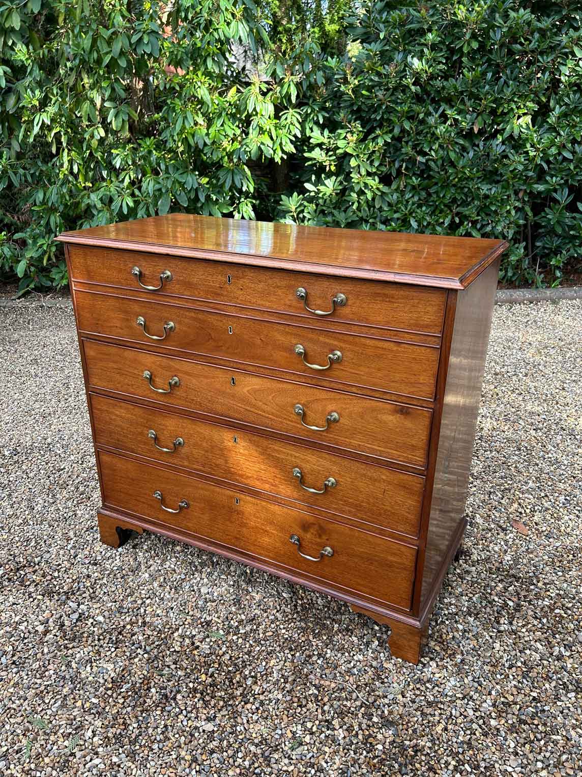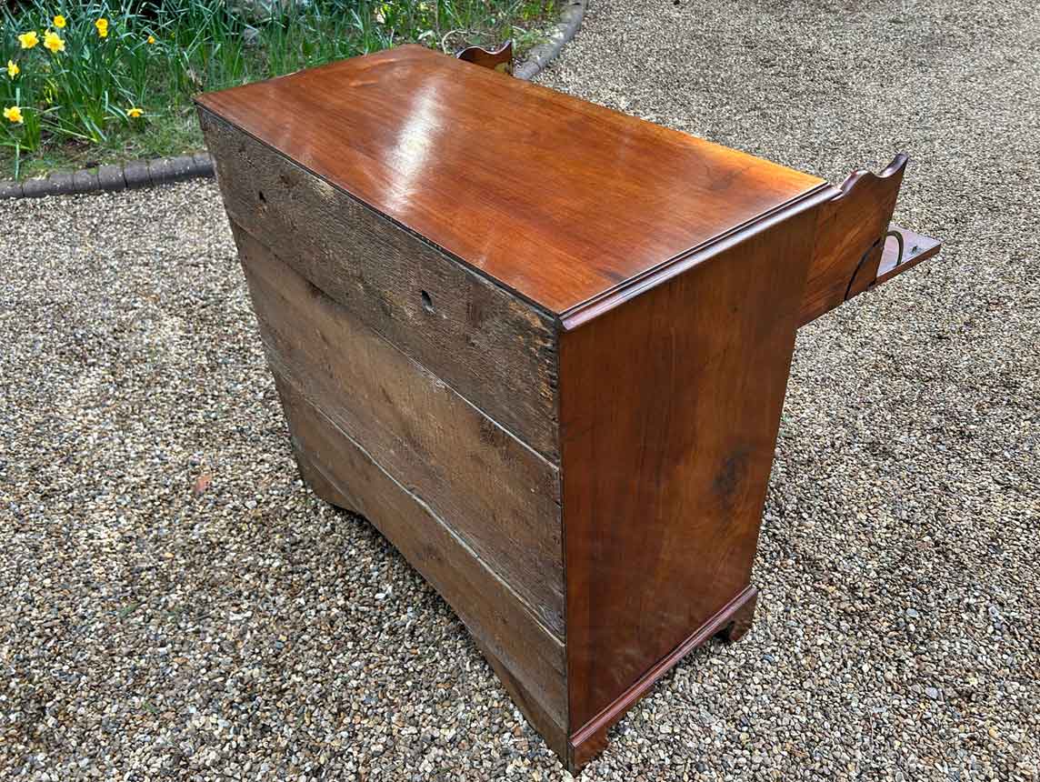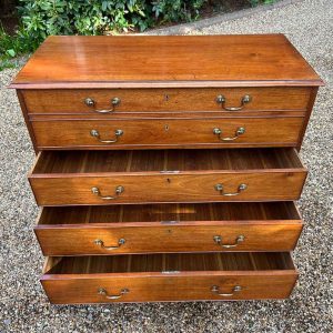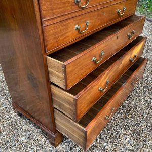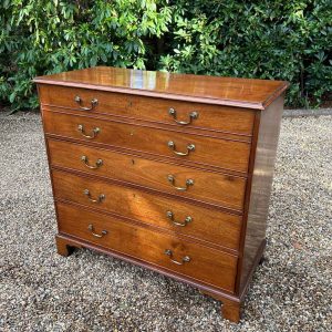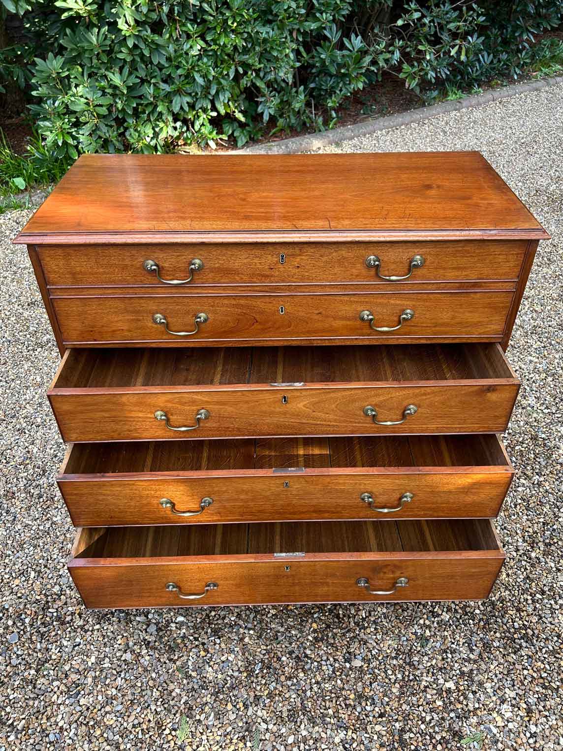 The 18th Century Secretaire has a fitted desk drawer over three long drawers with brass swan neck handles. The fitted desk drawer interior has a green leathered writing surface with 9 strung drawers and 4 pigeon holes. Stands on four bracket feet.