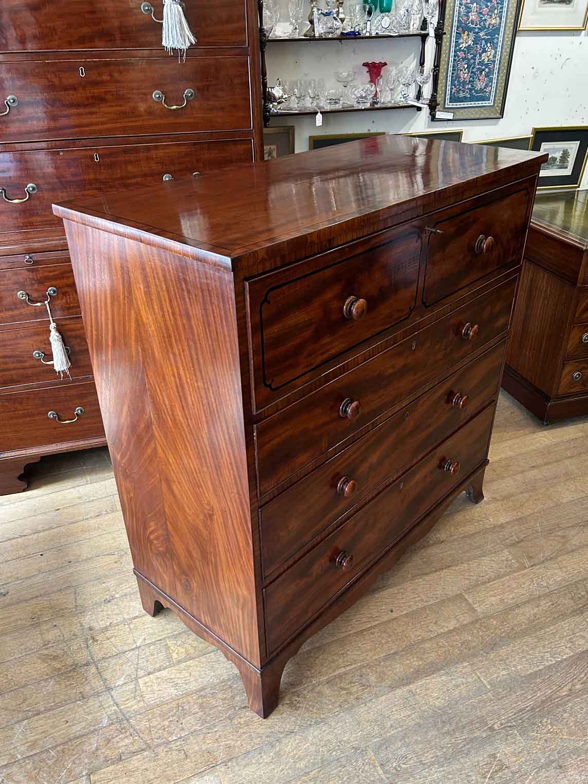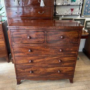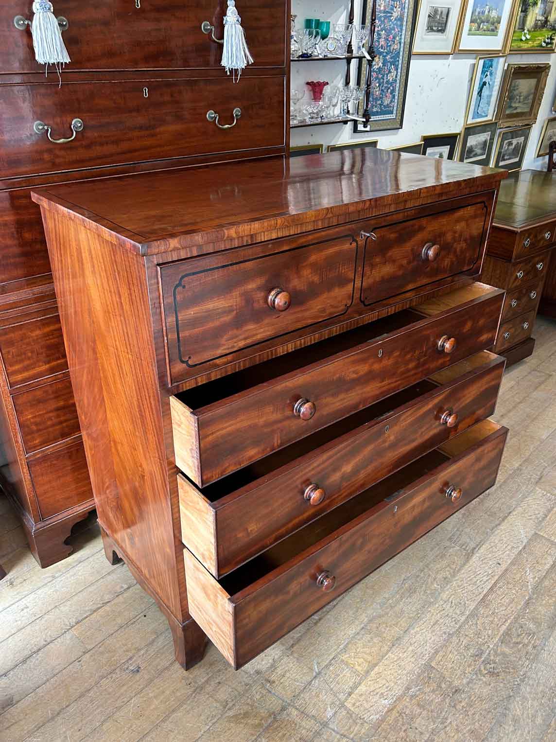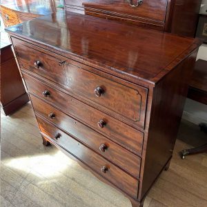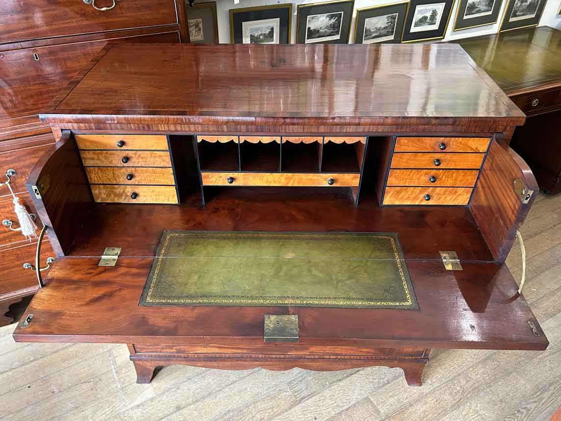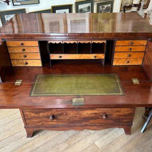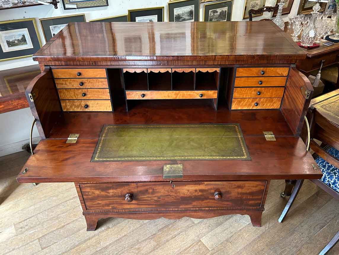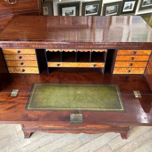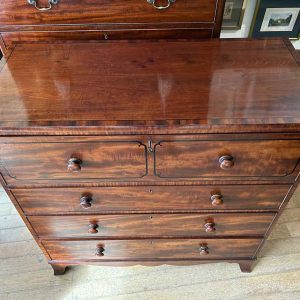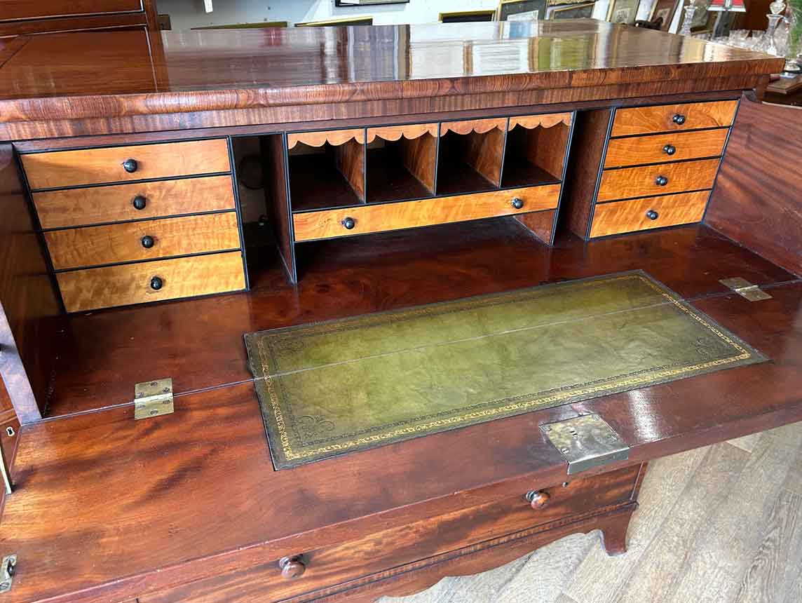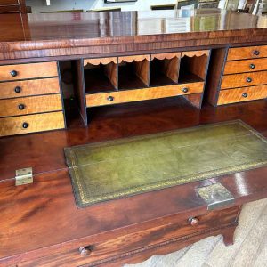 The Secretaire has the a fitted desk drawer over three long drawers with turned bun handles, with figured mahogany and ebony banding throughout. The fitted desk drawer interior has a green leathered writing surface with 9 strung satinwood drawers and 7 pigeon holes. Stands on four splayed shaped feet.