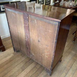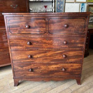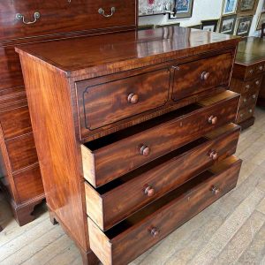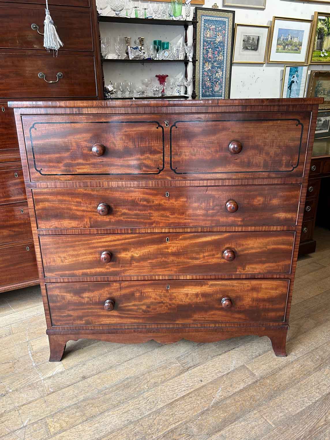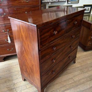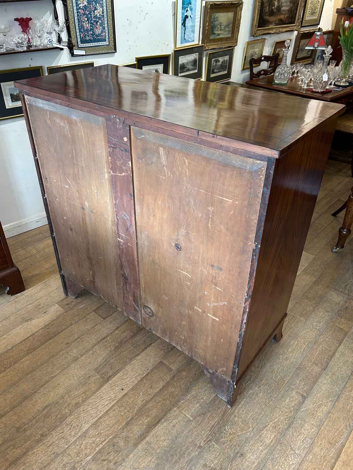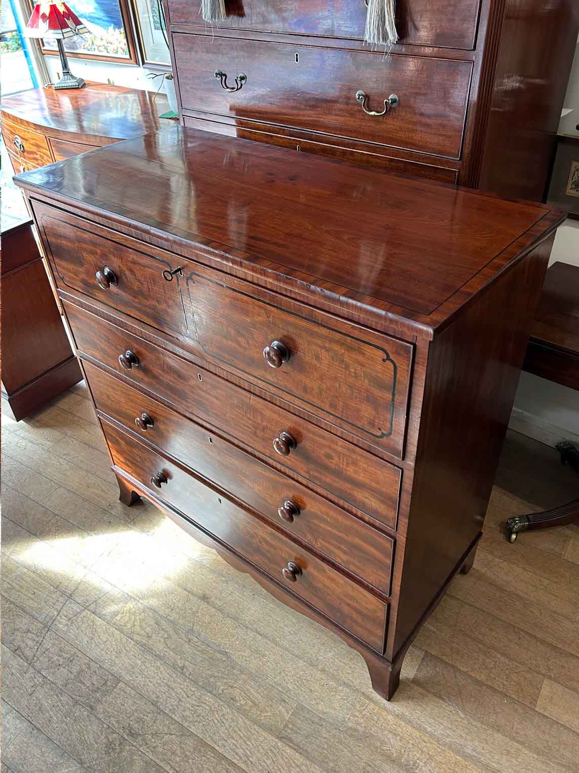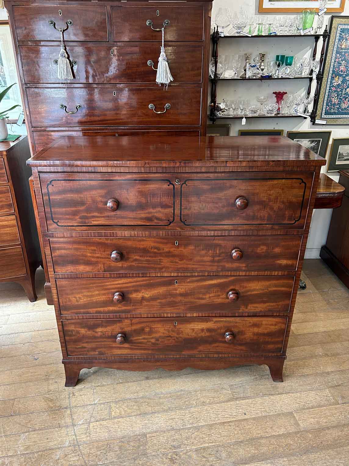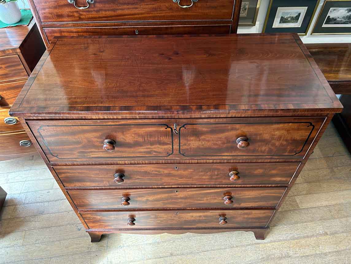 The Secretaire has the a fitted desk drawer over three long drawers with turned bun handles, with figured mahogany and ebony banding throughout. The fitted desk drawer interior has a green leathered writing surface with 9 strung satinwood drawers and 7 pigeon holes. Stands on four splayed shaped feet.
