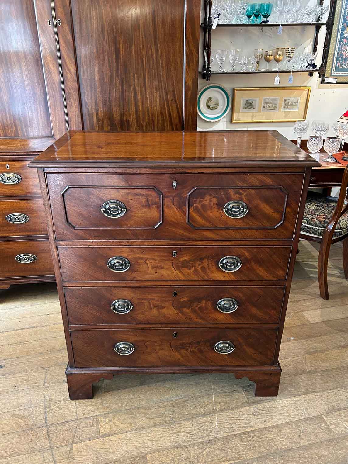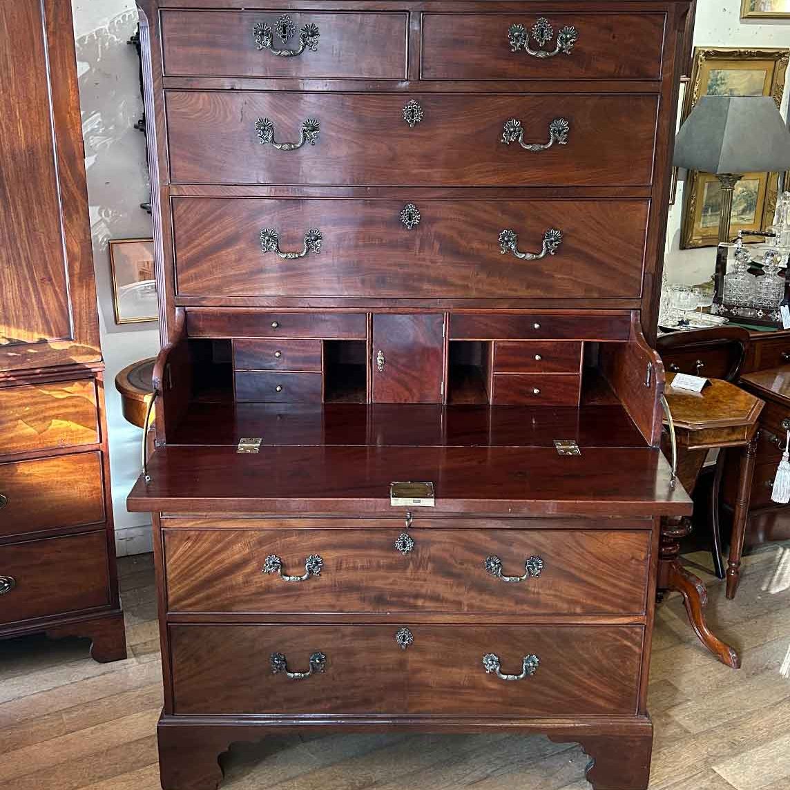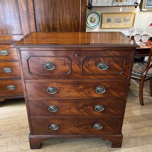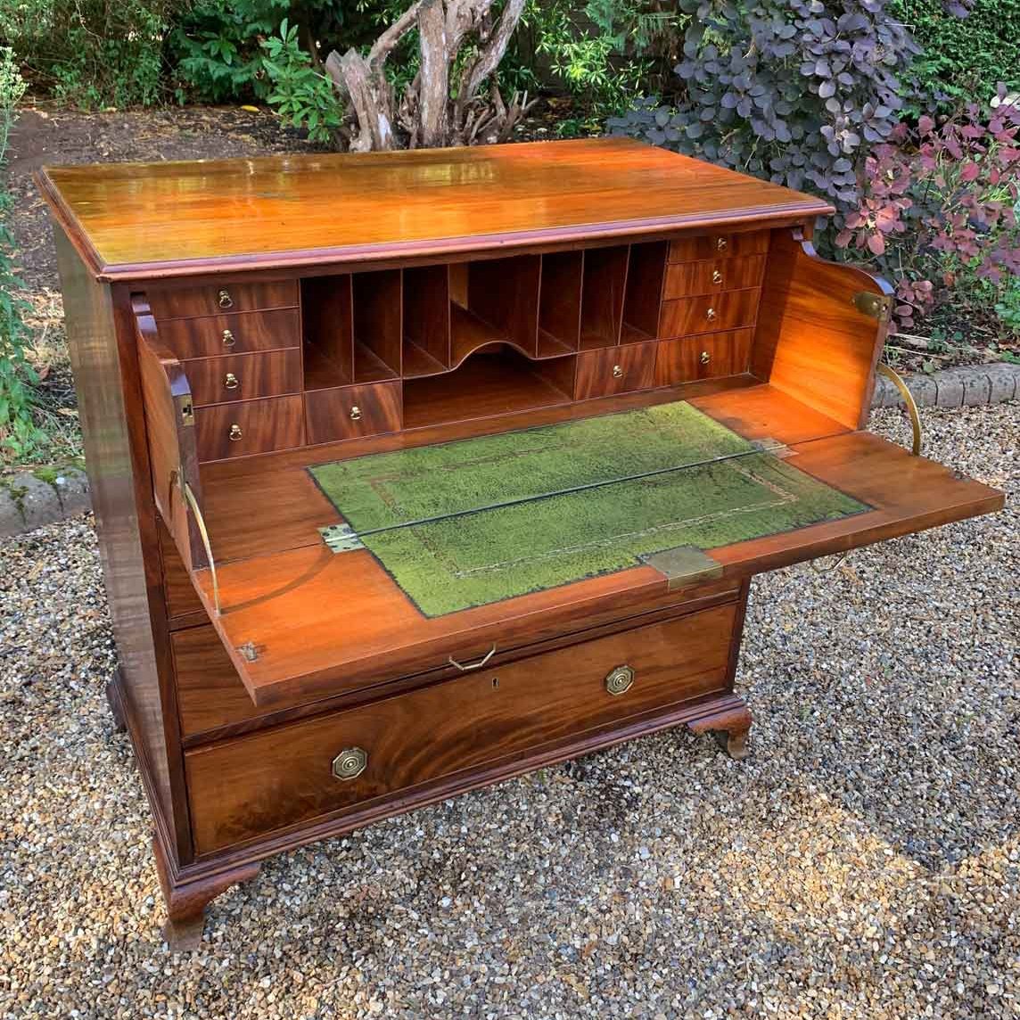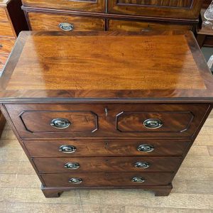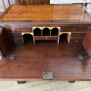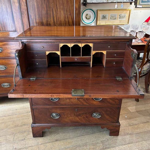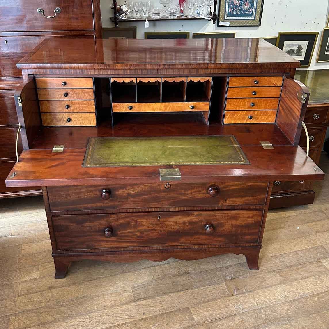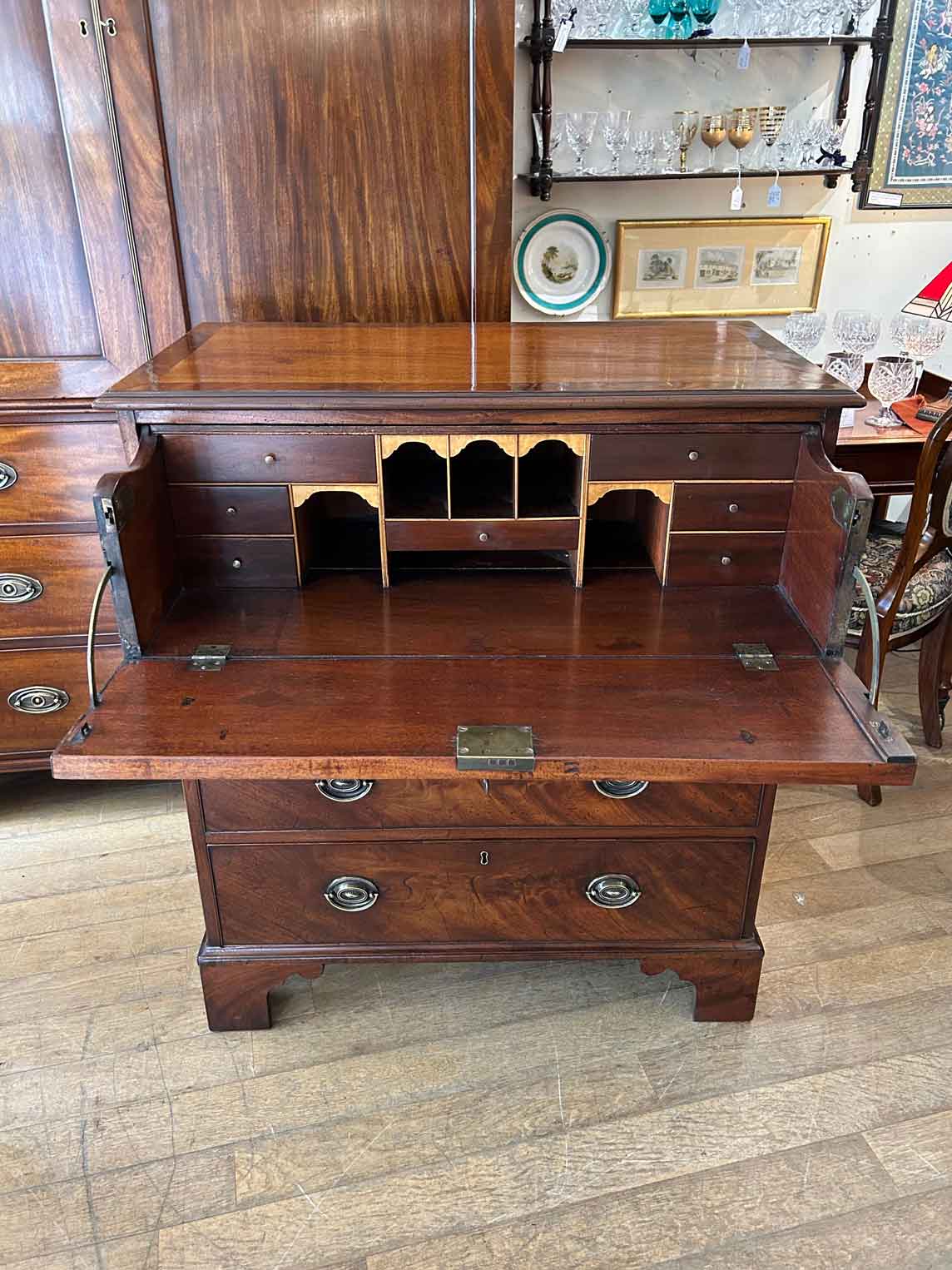 19th Century Georgian Mahogany Secretaire has a fitted desk drawer over three long drawers with brass oval handles. The fitted desk drawer interior has a writing surface with 7 strung drawers and 5 pigeon holes. Stands on four bracket feet.
