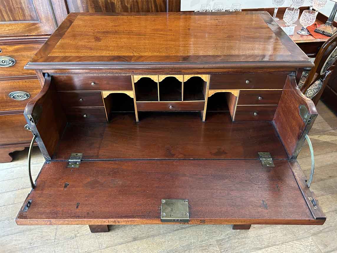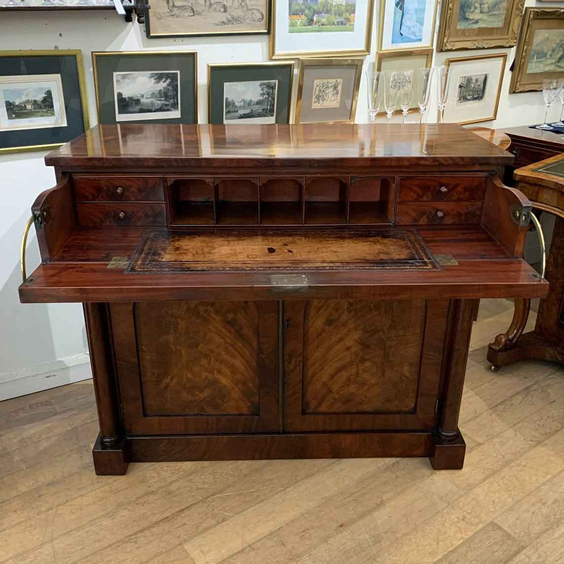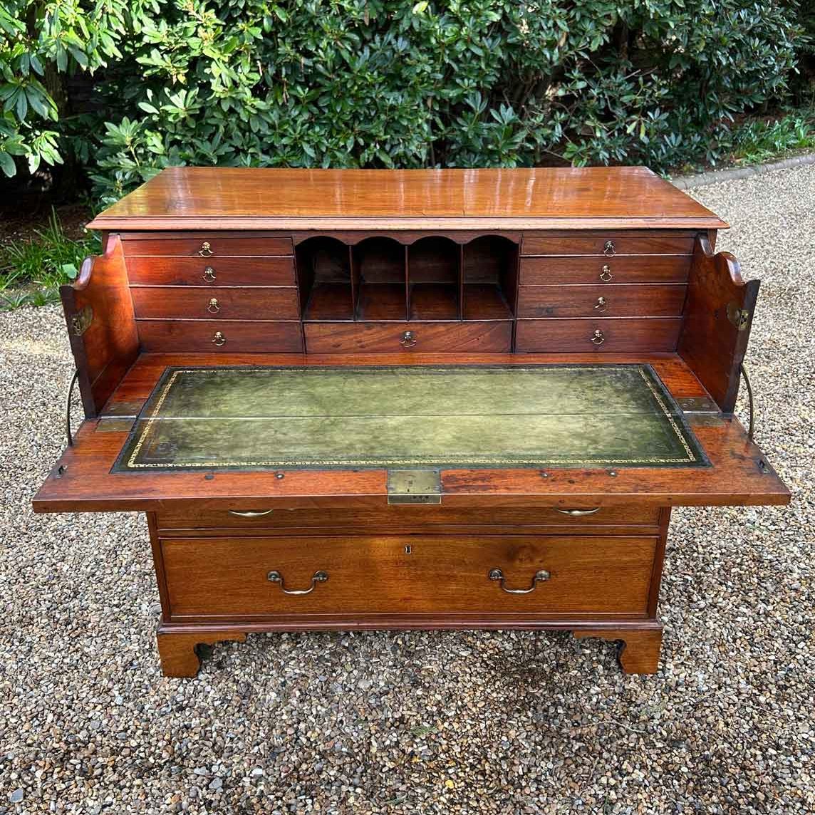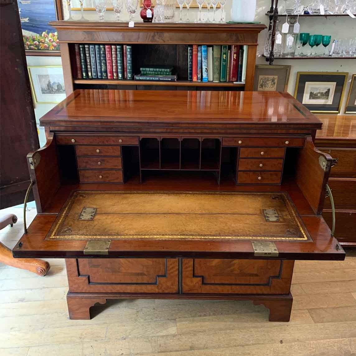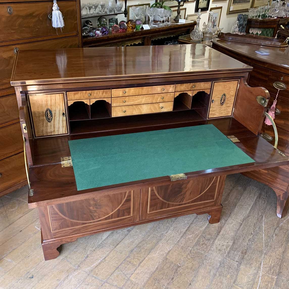 19th Century Georgian Mahogany Secretaire has a fitted desk drawer over three long drawers with brass oval handles. The fitted desk drawer interior has a writing surface with 7 strung drawers and 5 pigeon holes. Stands on four bracket feet.