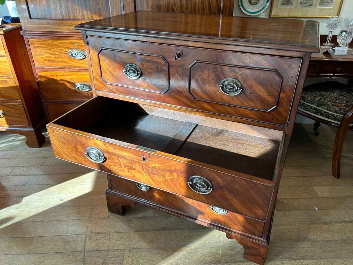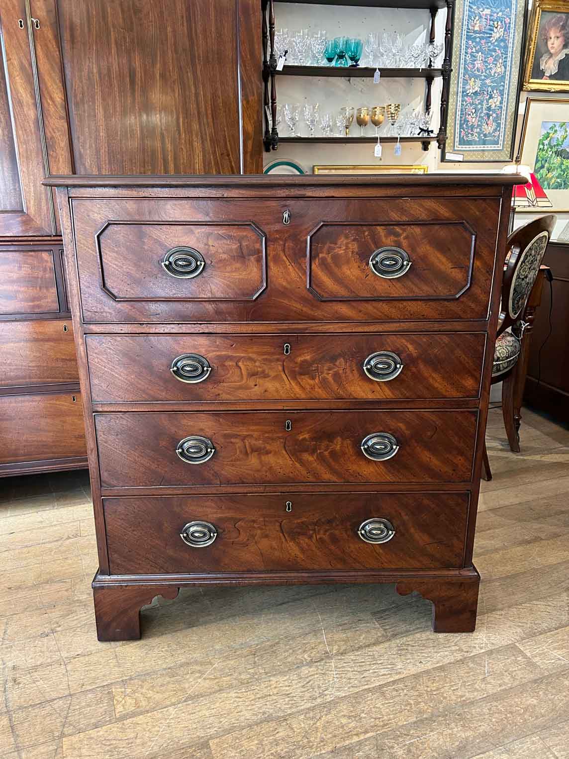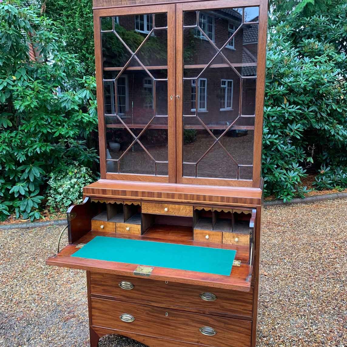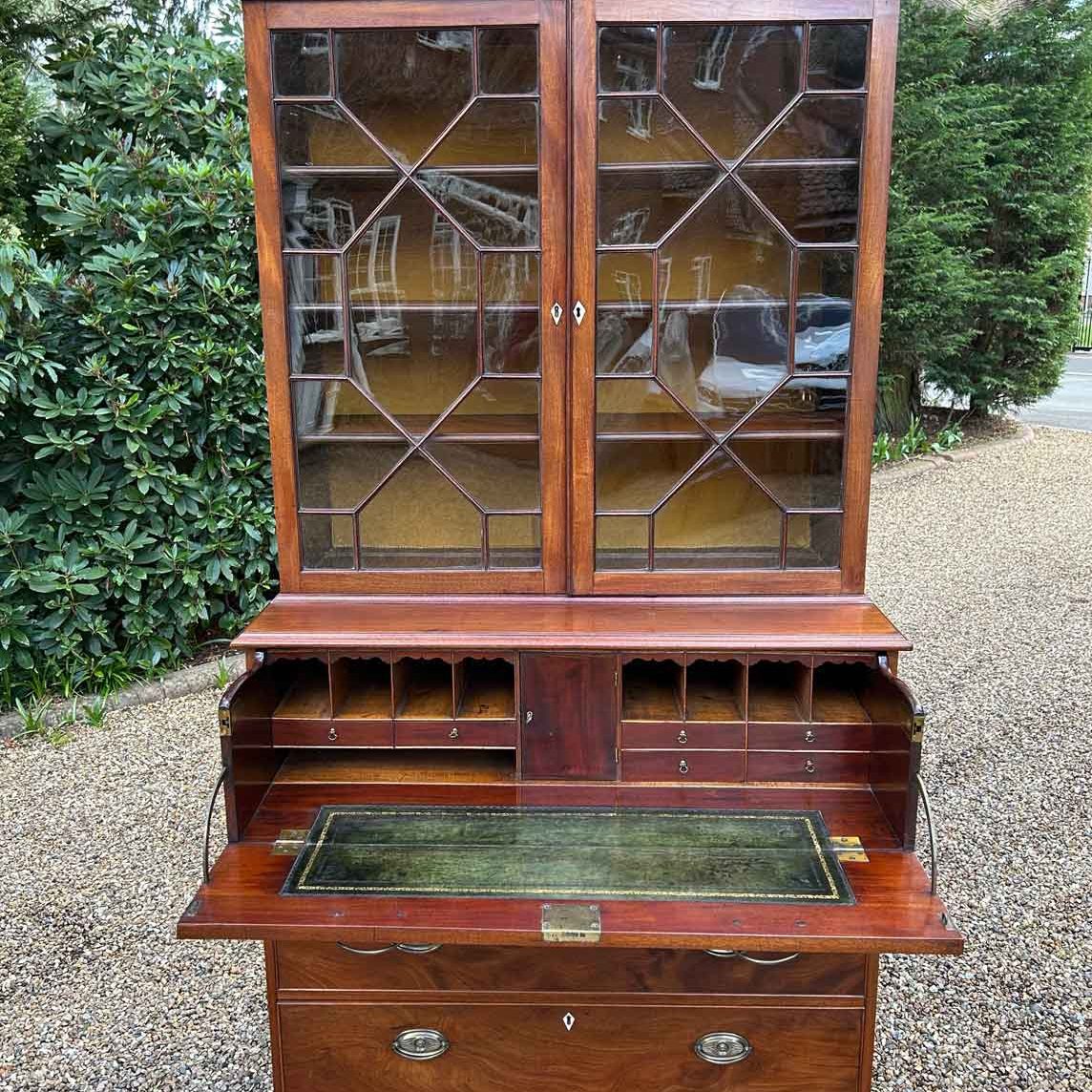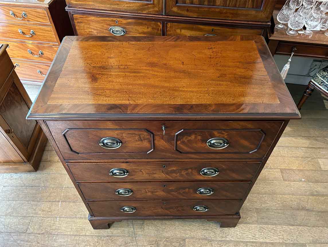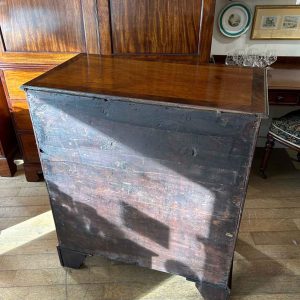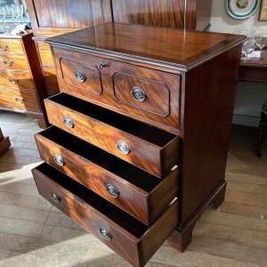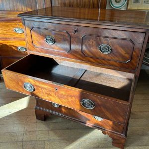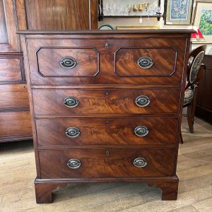 19th Century Georgian Mahogany Secretaire has a fitted desk drawer over three long drawers with brass oval handles. The fitted desk drawer interior has a writing surface with 7 strung drawers and 5 pigeon holes. Stands on four bracket feet.