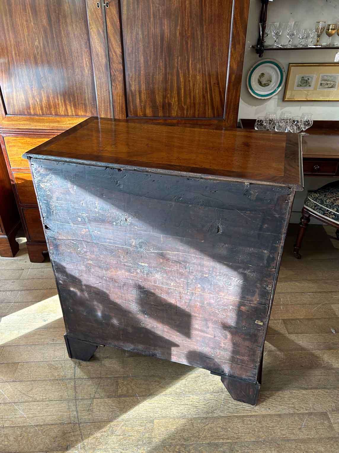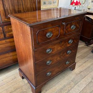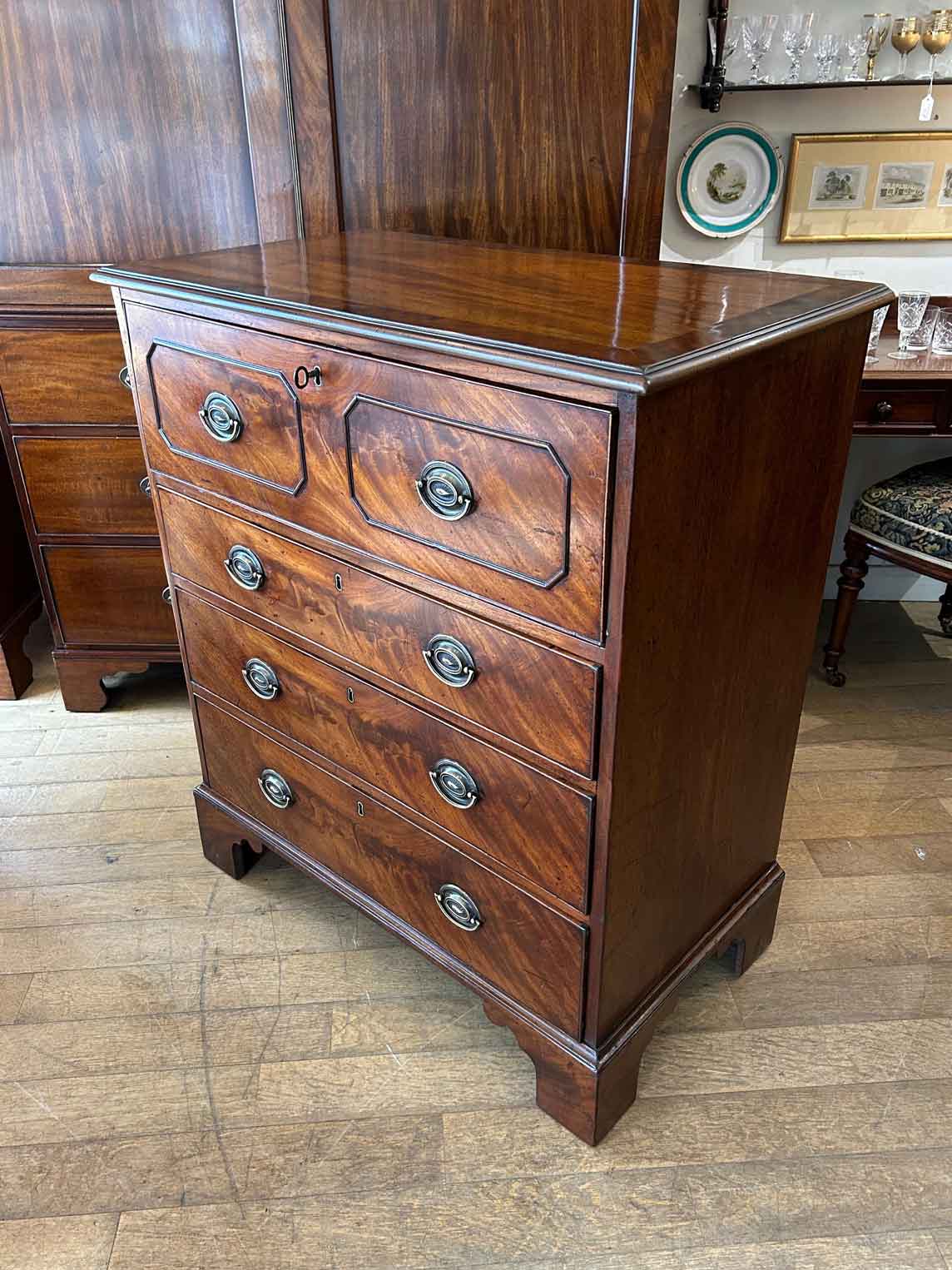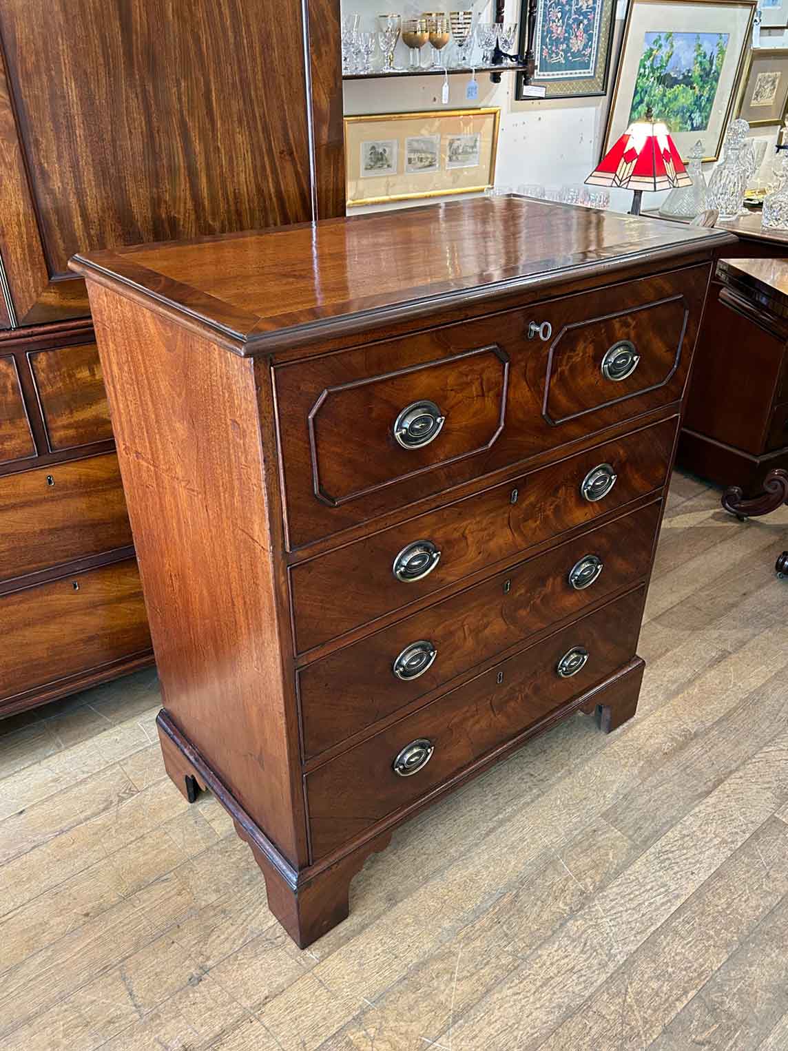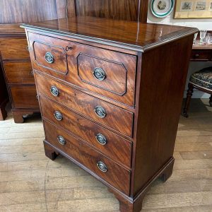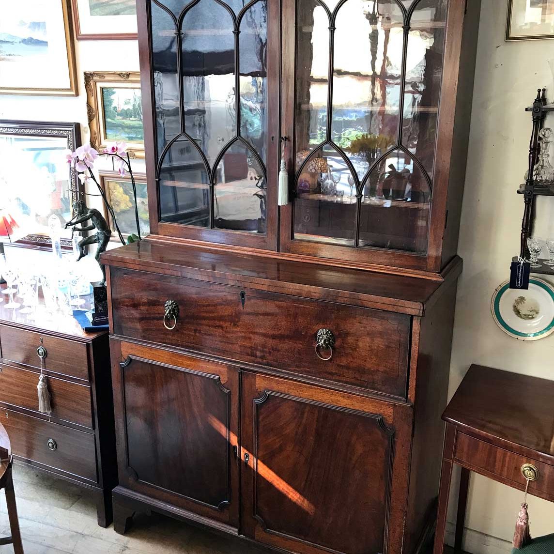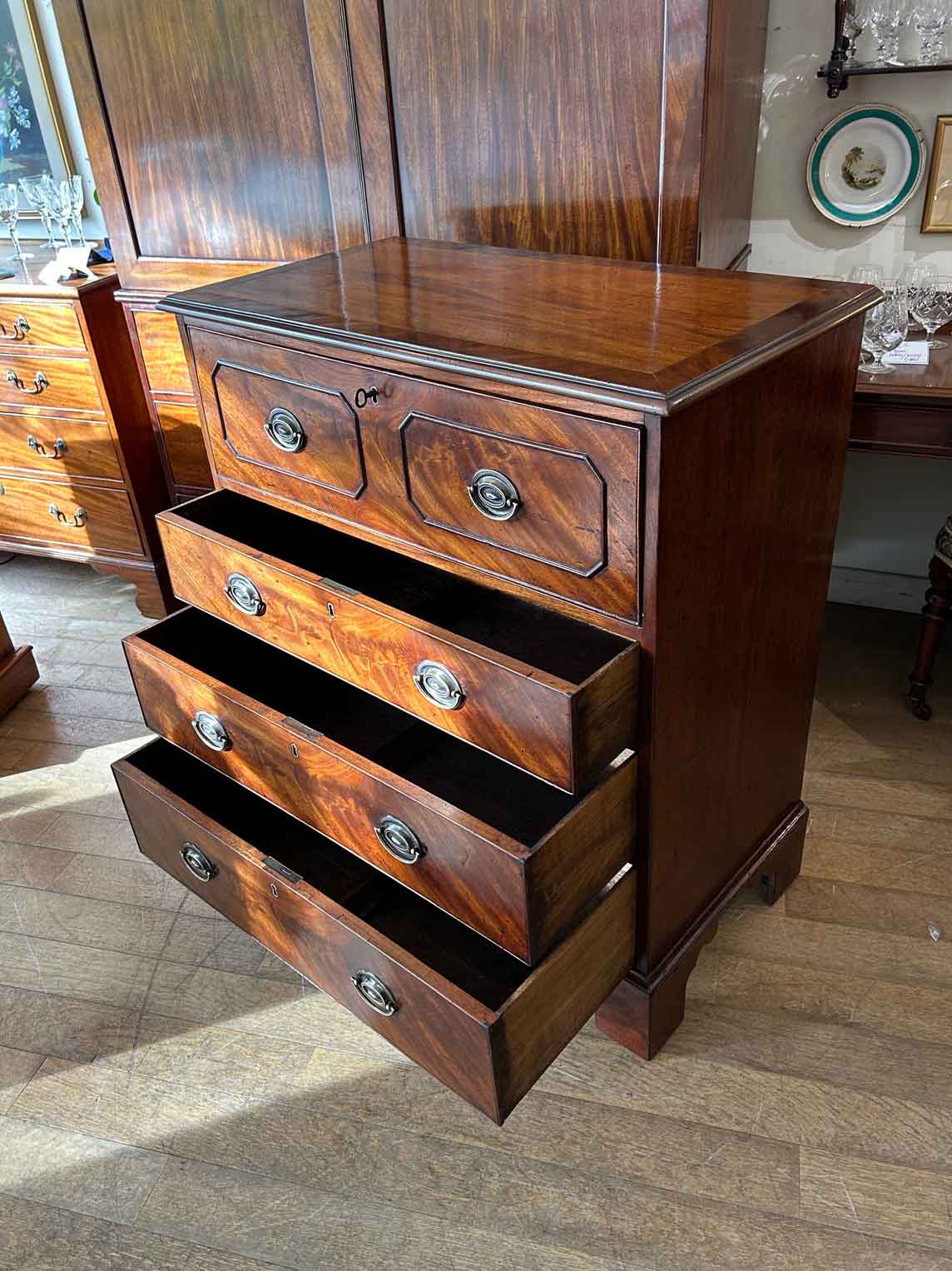 19th Century Georgian Mahogany Secretaire has a fitted desk drawer over three long drawers with brass oval handles. The fitted desk drawer interior has a writing surface with 7 strung drawers and 5 pigeon holes. Stands on four bracket feet.