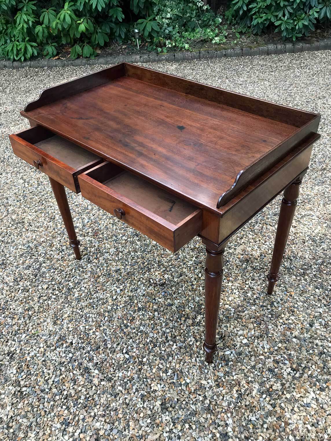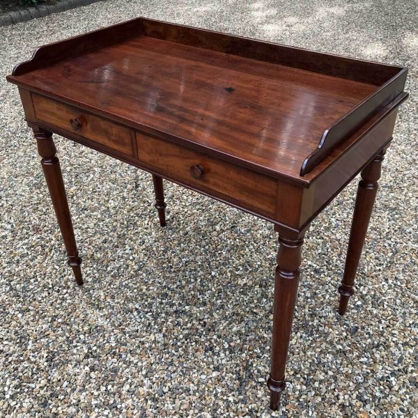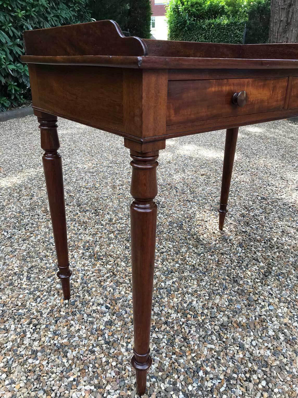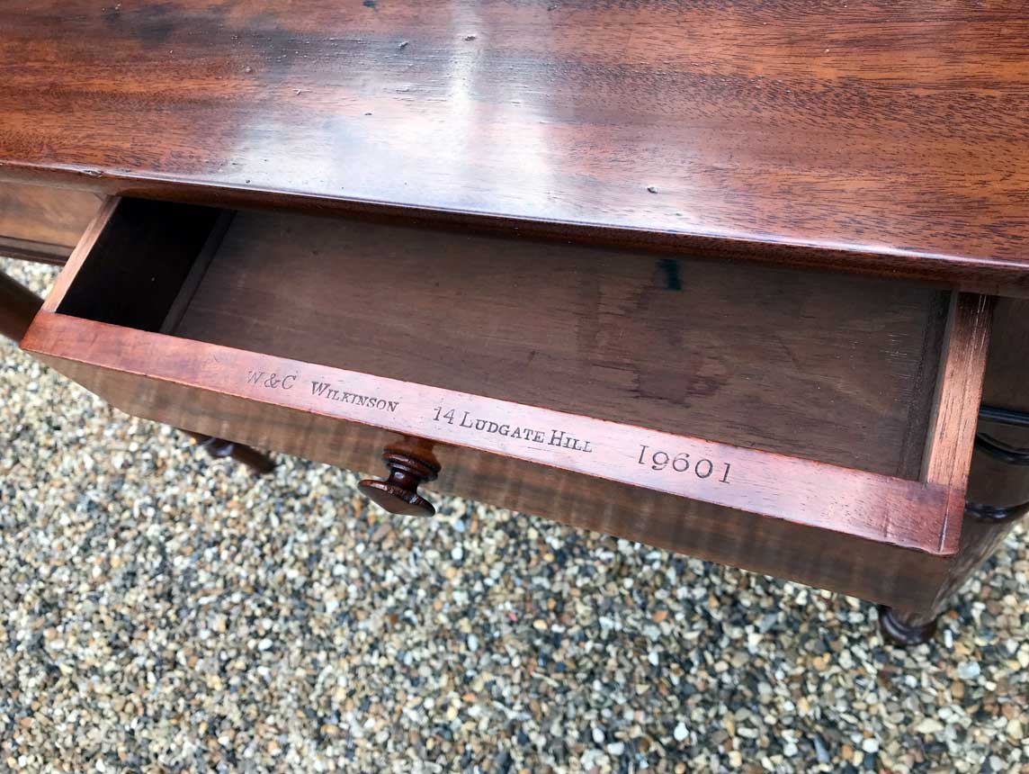 A very high quality 19th Century William IV Mahogany Side Table with makers stamp: Wilkinson & Co of Ludgate Hill – with raised back, two drawers on turned tapering legs.