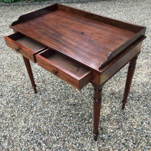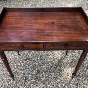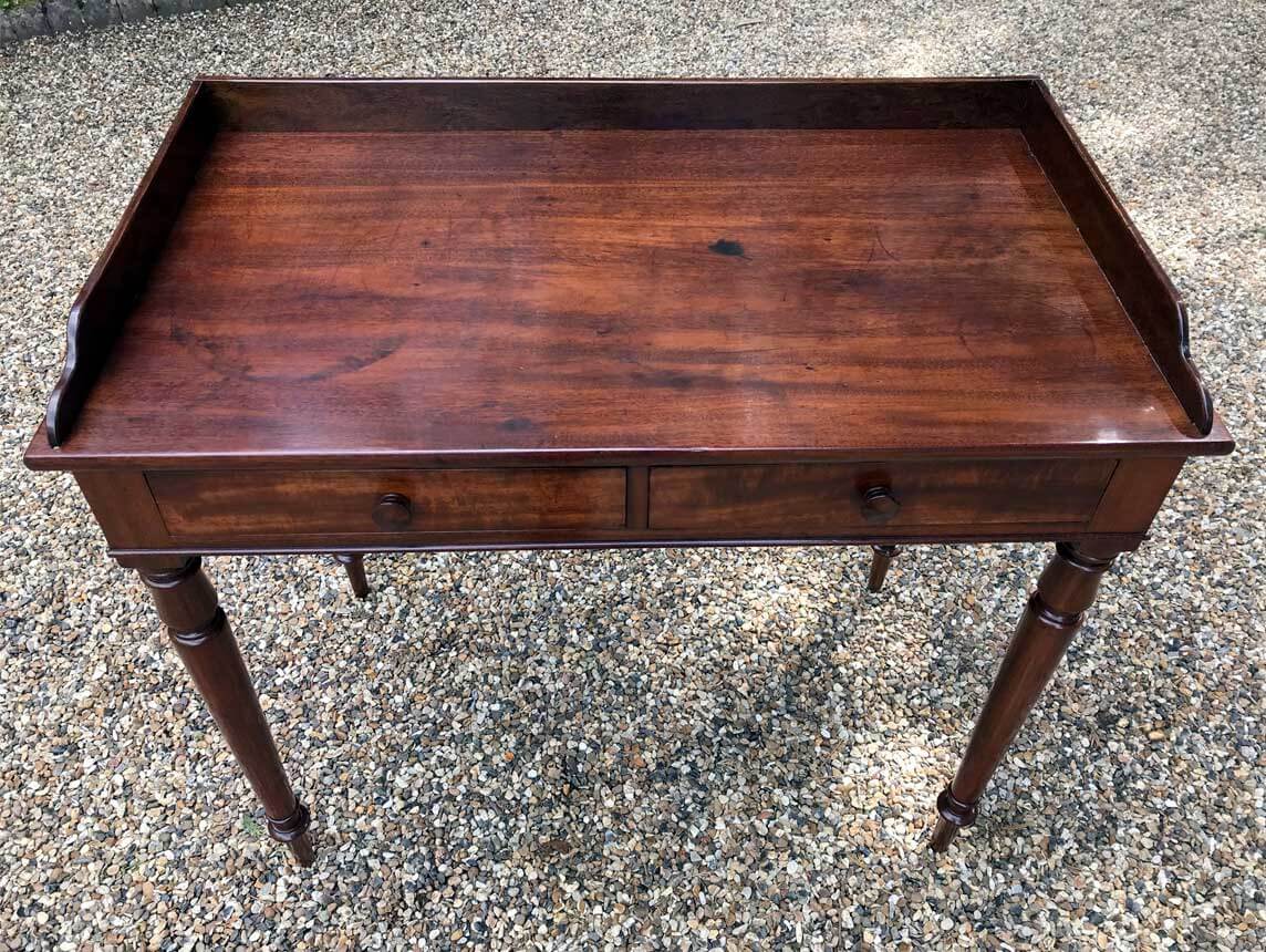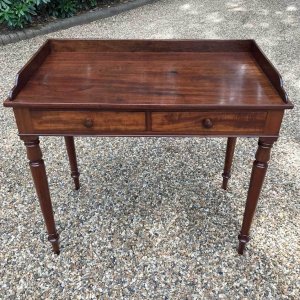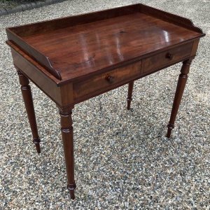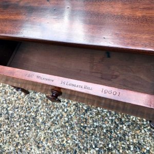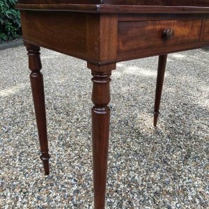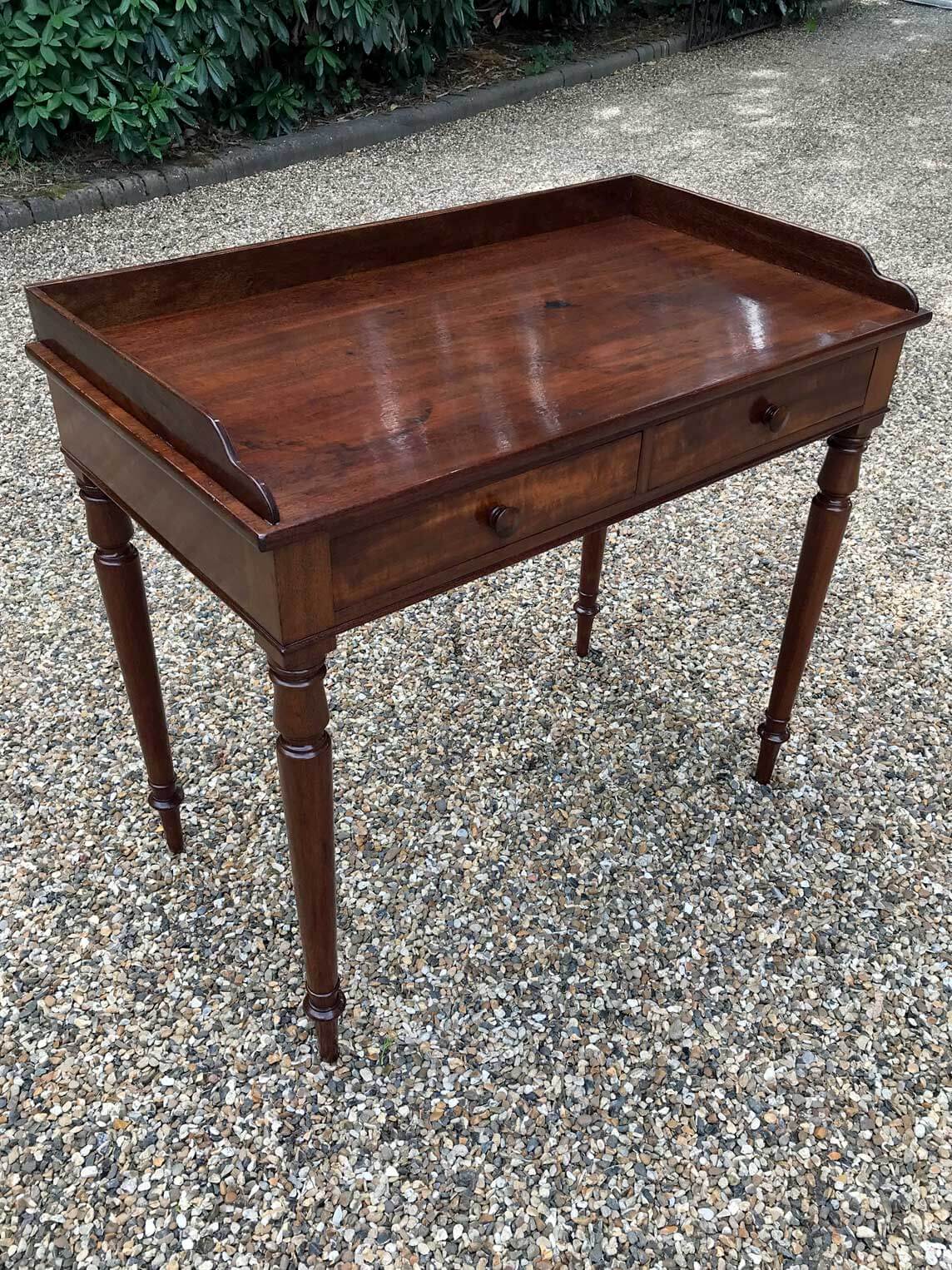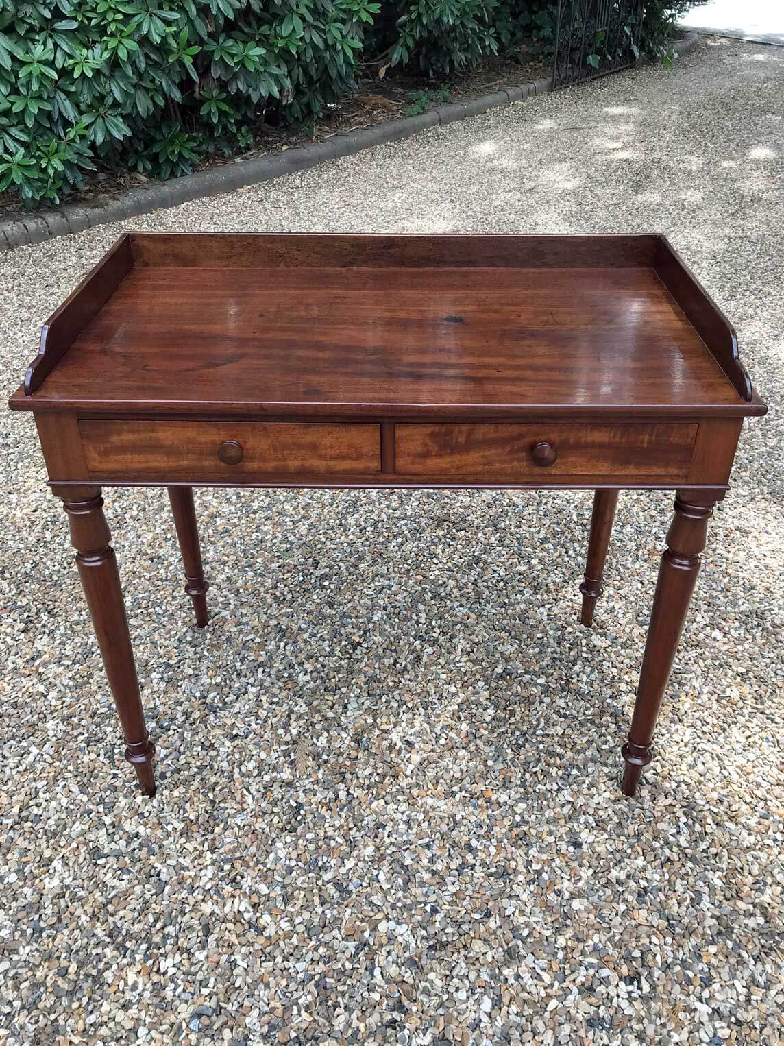 A very high quality 19th Century William IV Mahogany Side Table with makers stamp: Wilkinson & Co of Ludgate Hill – with raised back, two drawers on turned tapering legs.