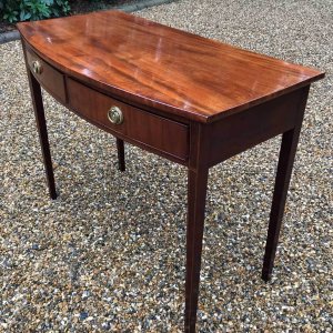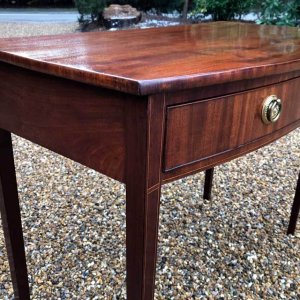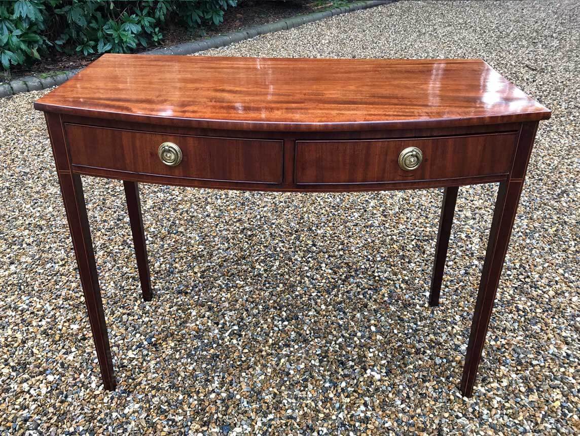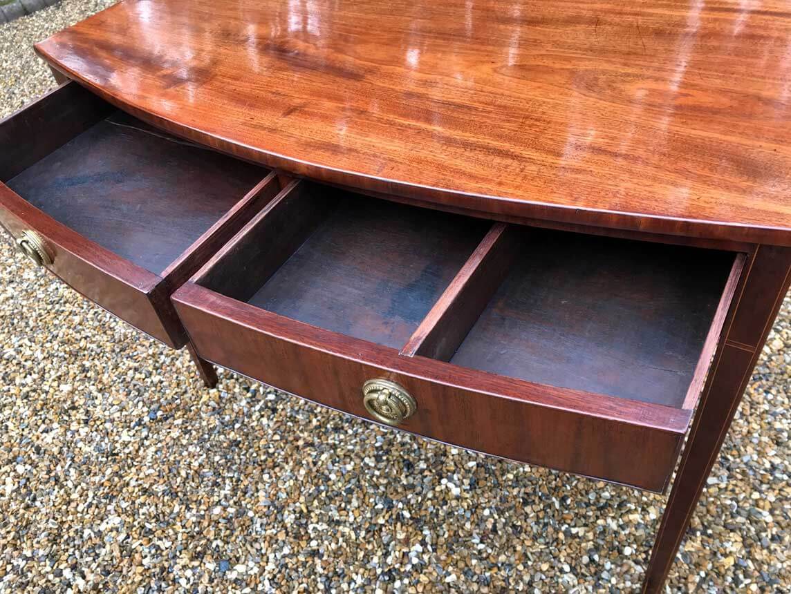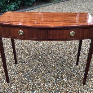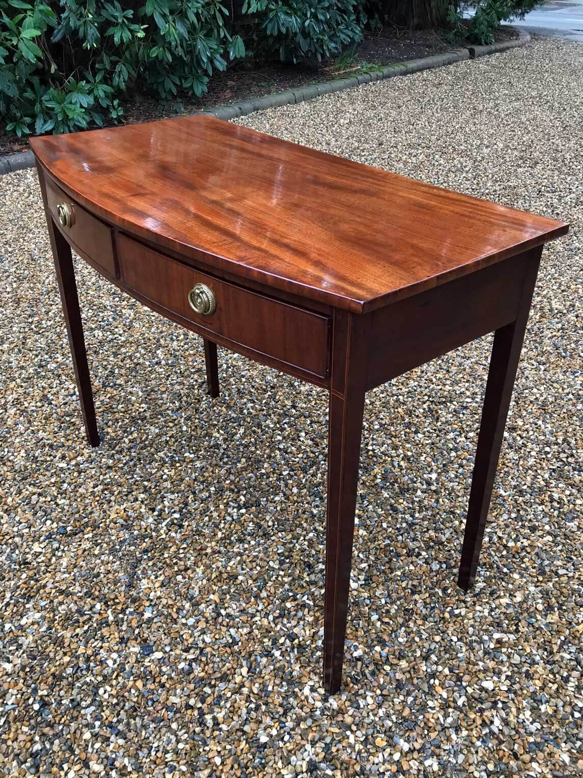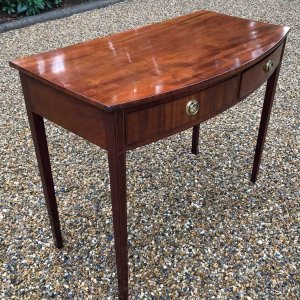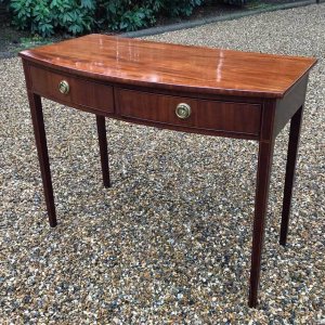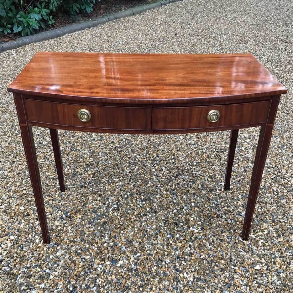 19th Century Regency Mahogany Bow Fronted Side Table, fitted with two mahogany drawers and brass ring handles, on square tapering legs with inlay.