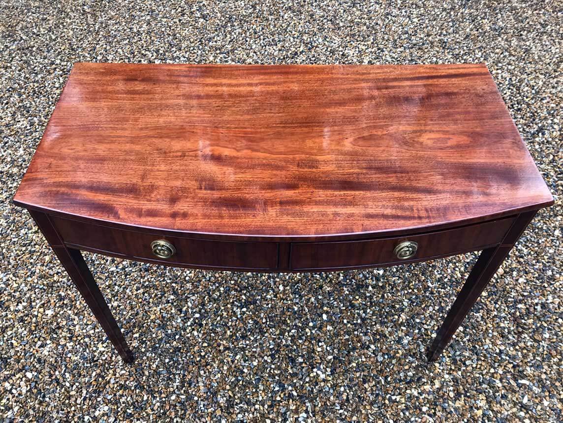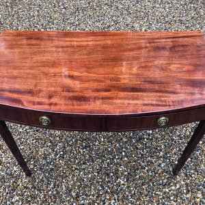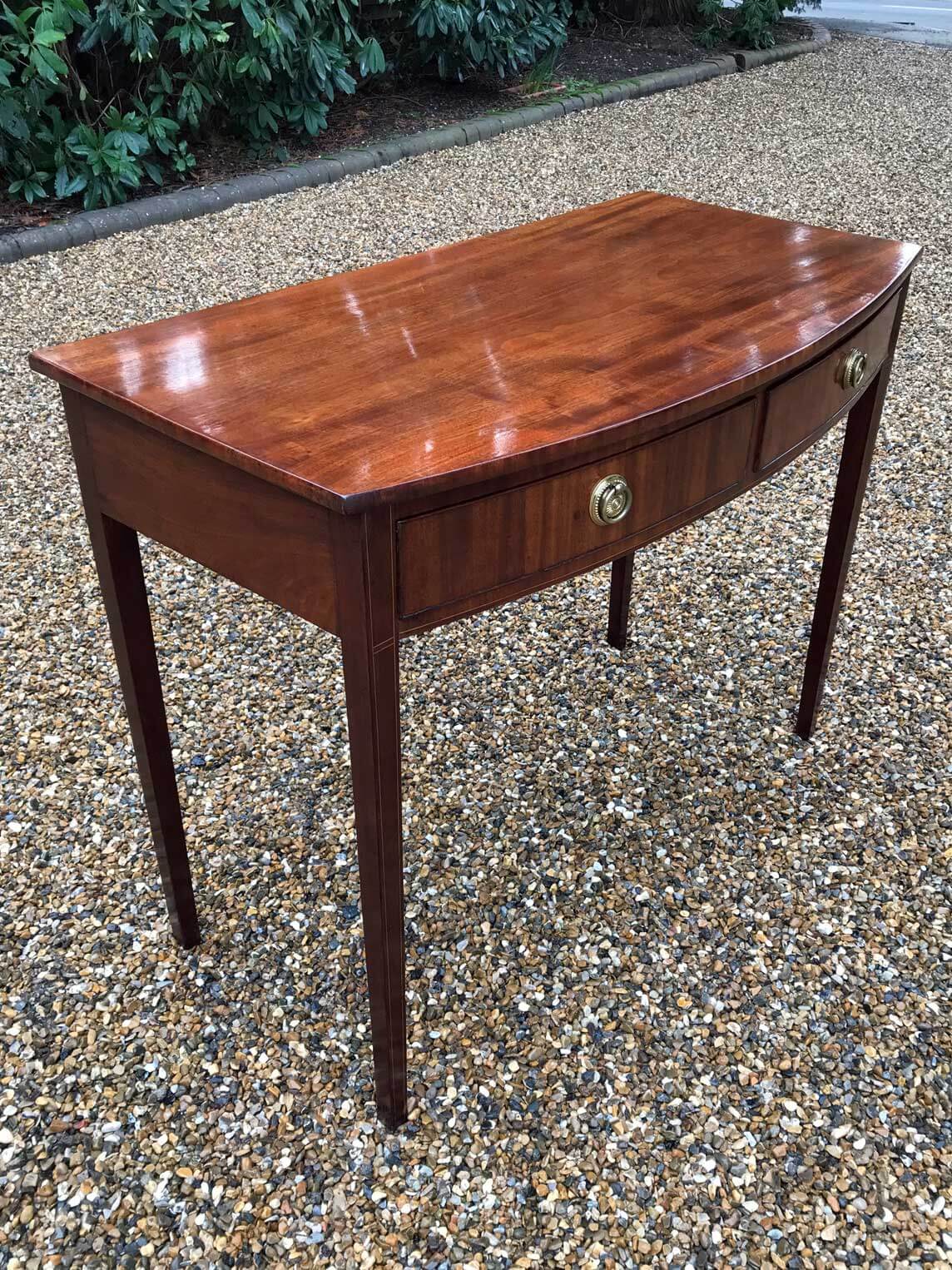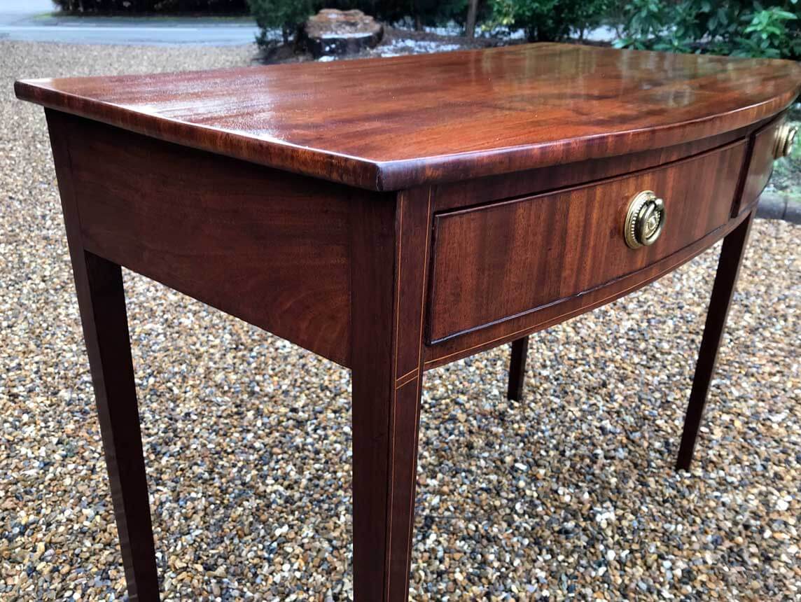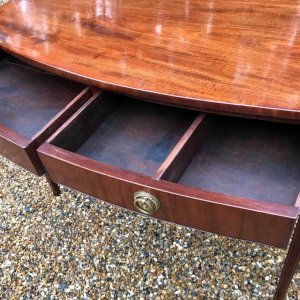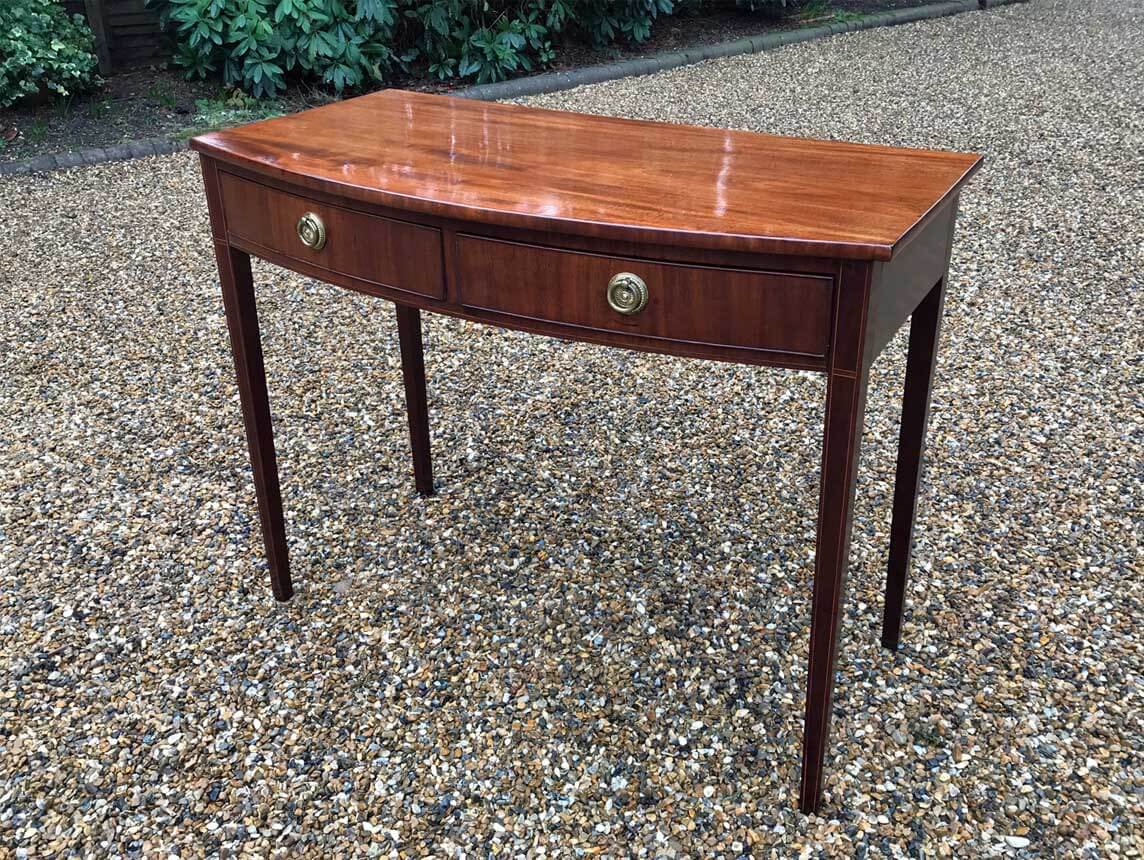 19th Century Regency Mahogany Bow Fronted Side Table, fitted with two mahogany drawers and brass ring handles, on square tapering legs with inlay.