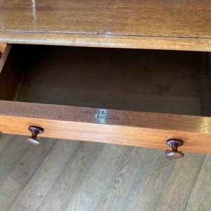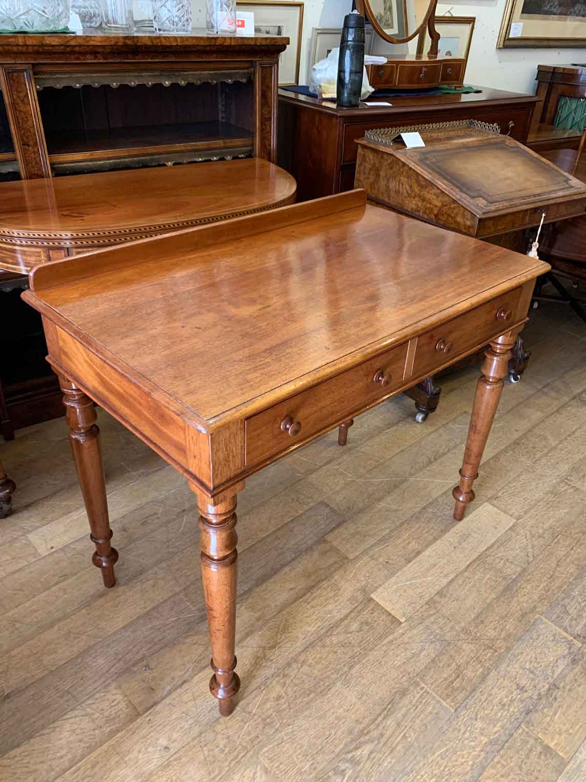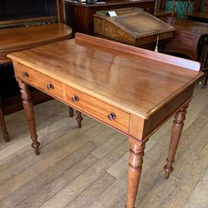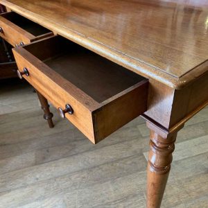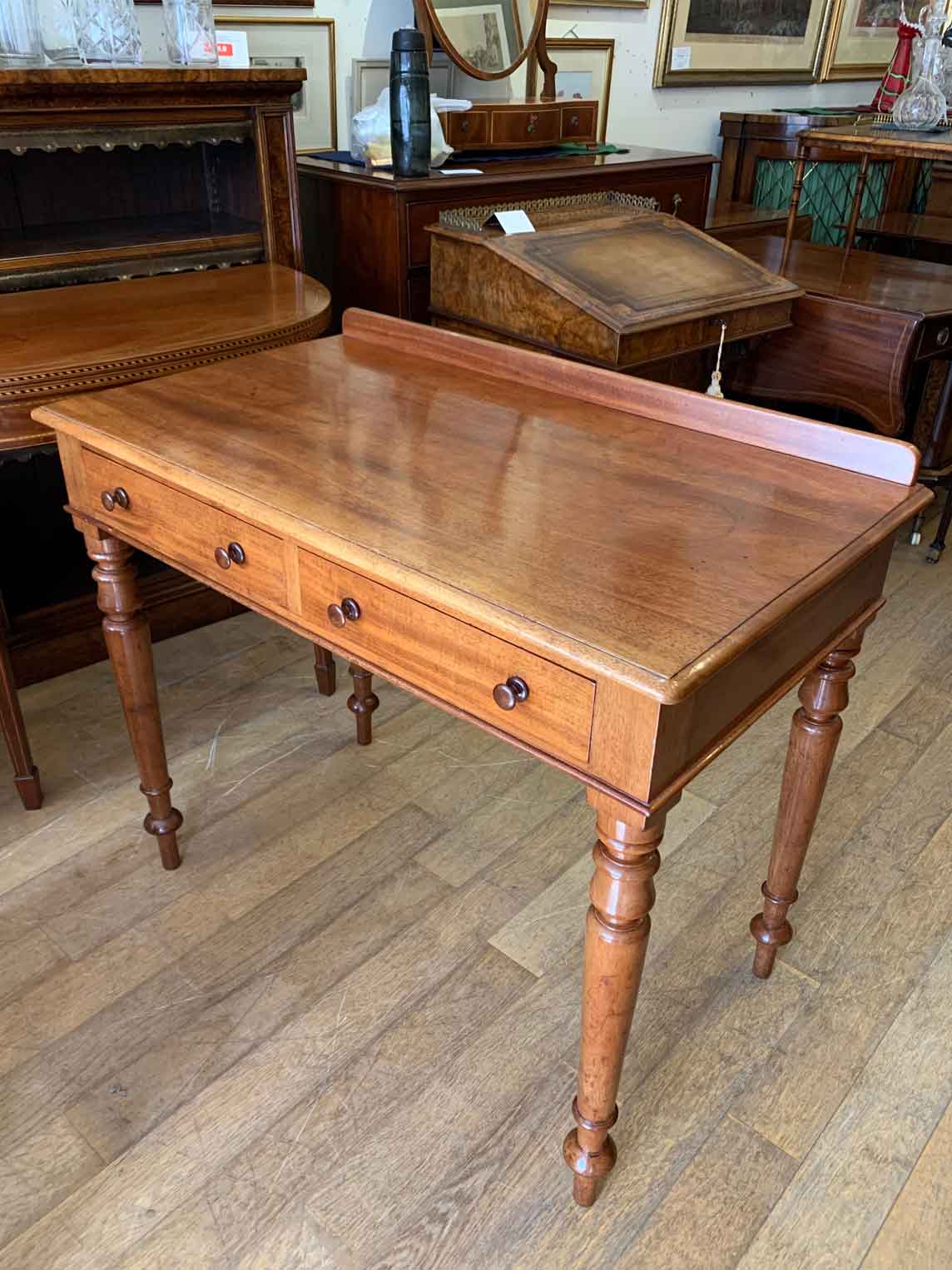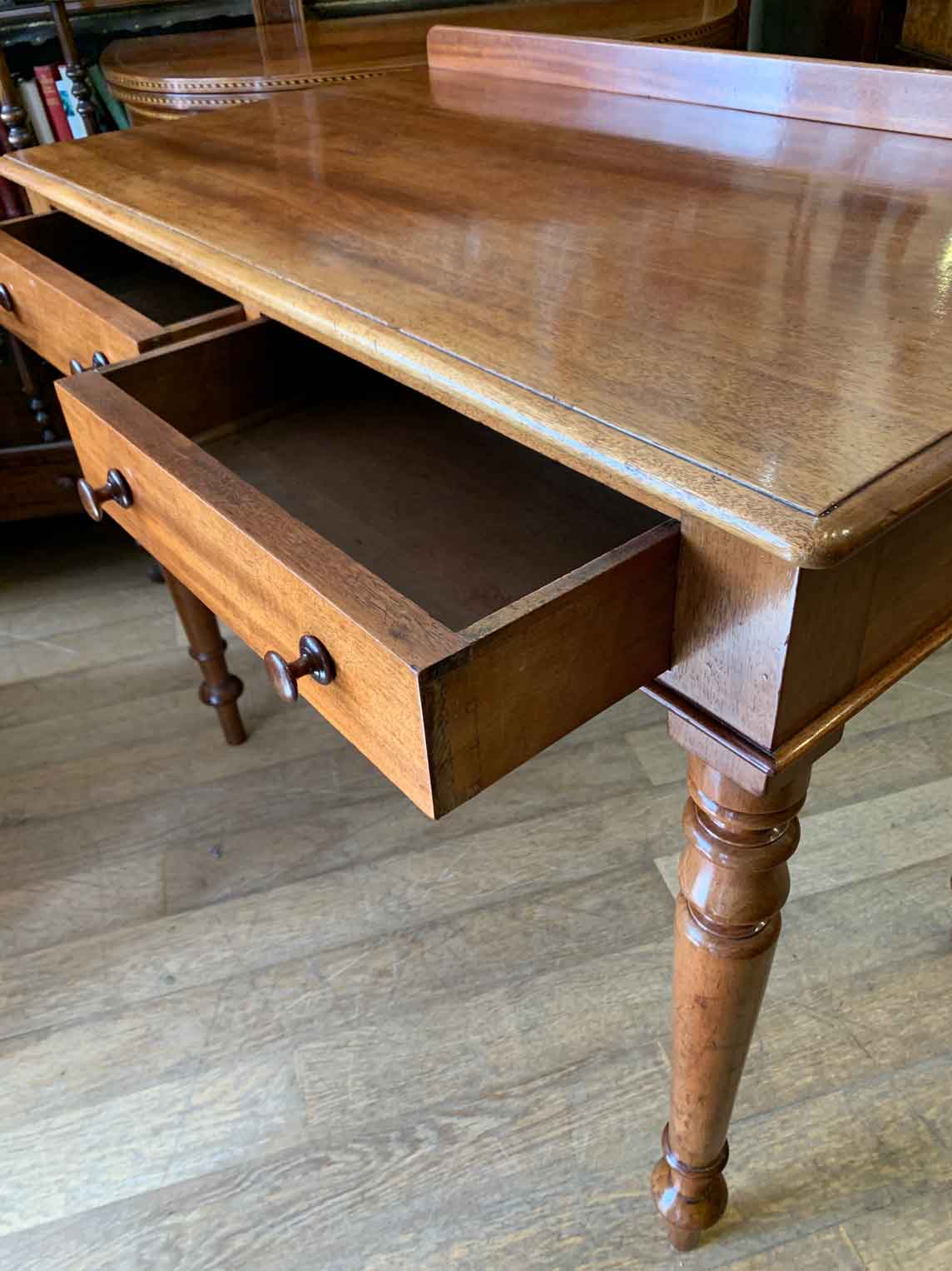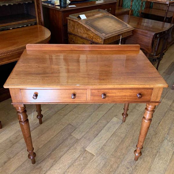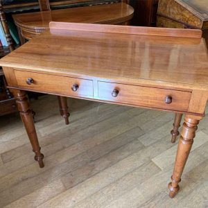 A very high quality 19th Century Victorian Mahogany Side Table with raised back, stamped with Heals & Sons London. Fitted with two mahogany drawers with bun handles on turned legs.