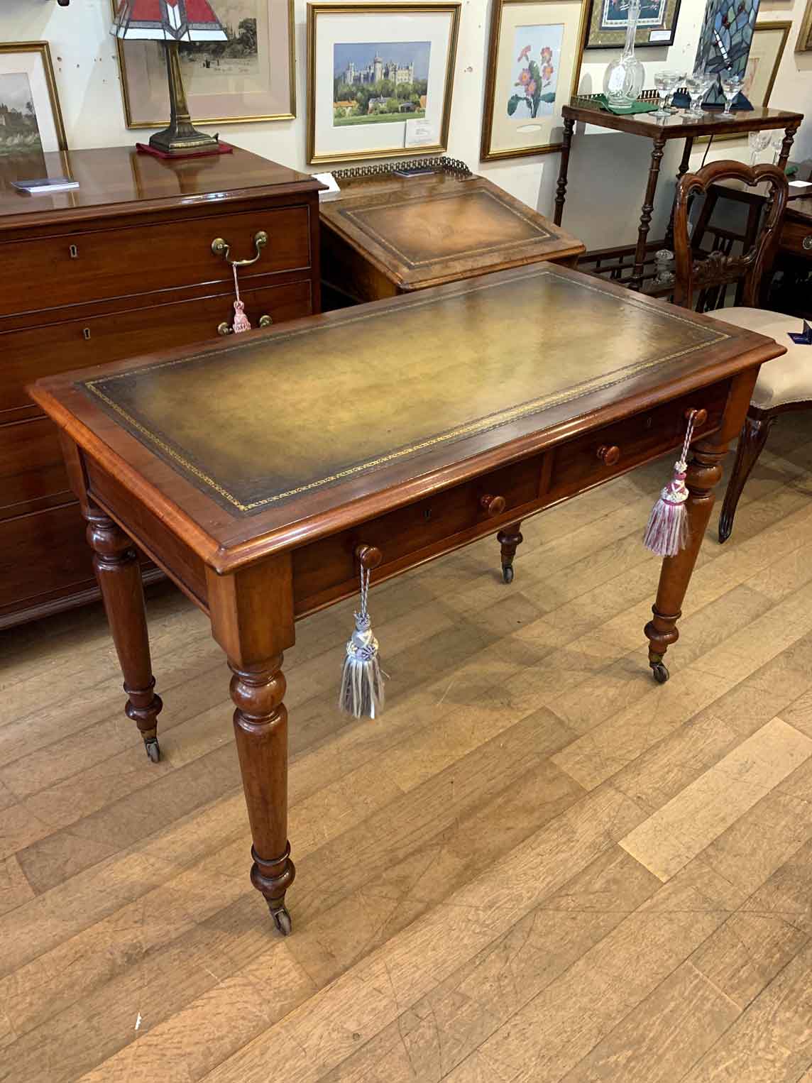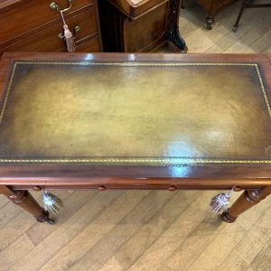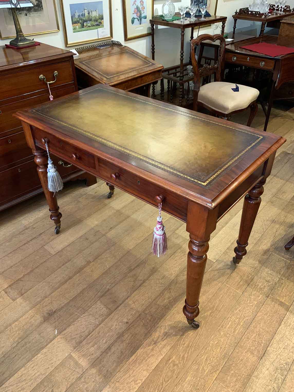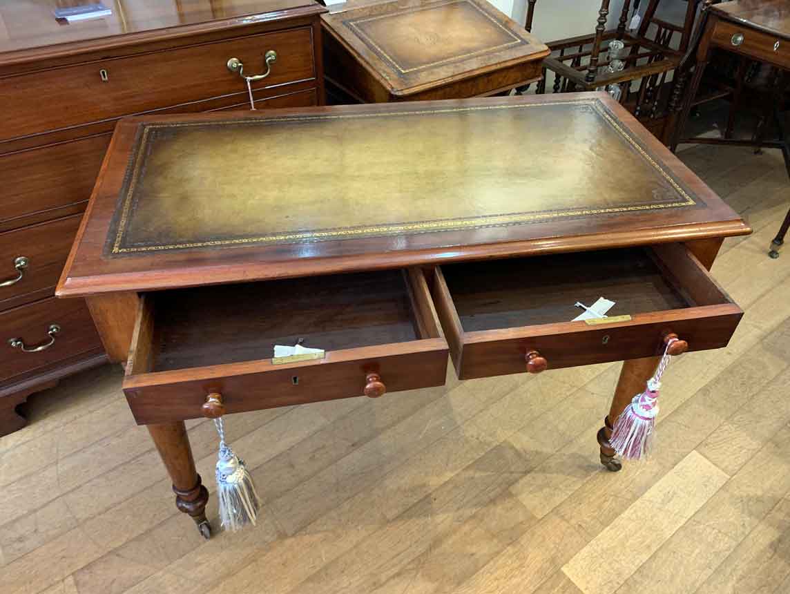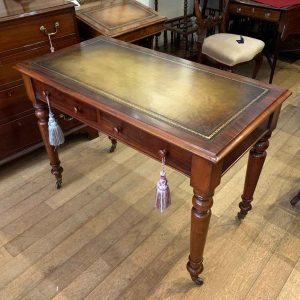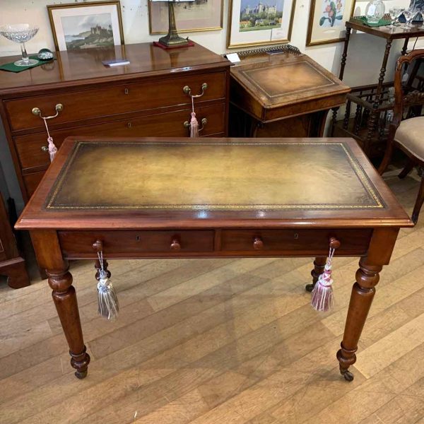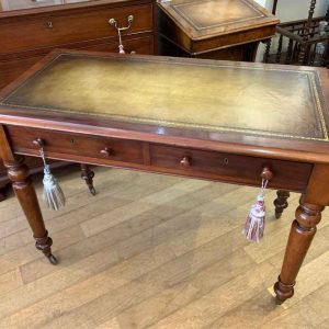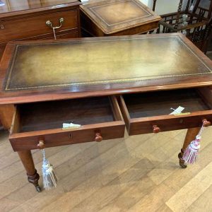19th Century Victorian Mahogany Writing Table with a leather top, mahogany drawers and bun handles with working keys. On turned legs, with brass castors to base.