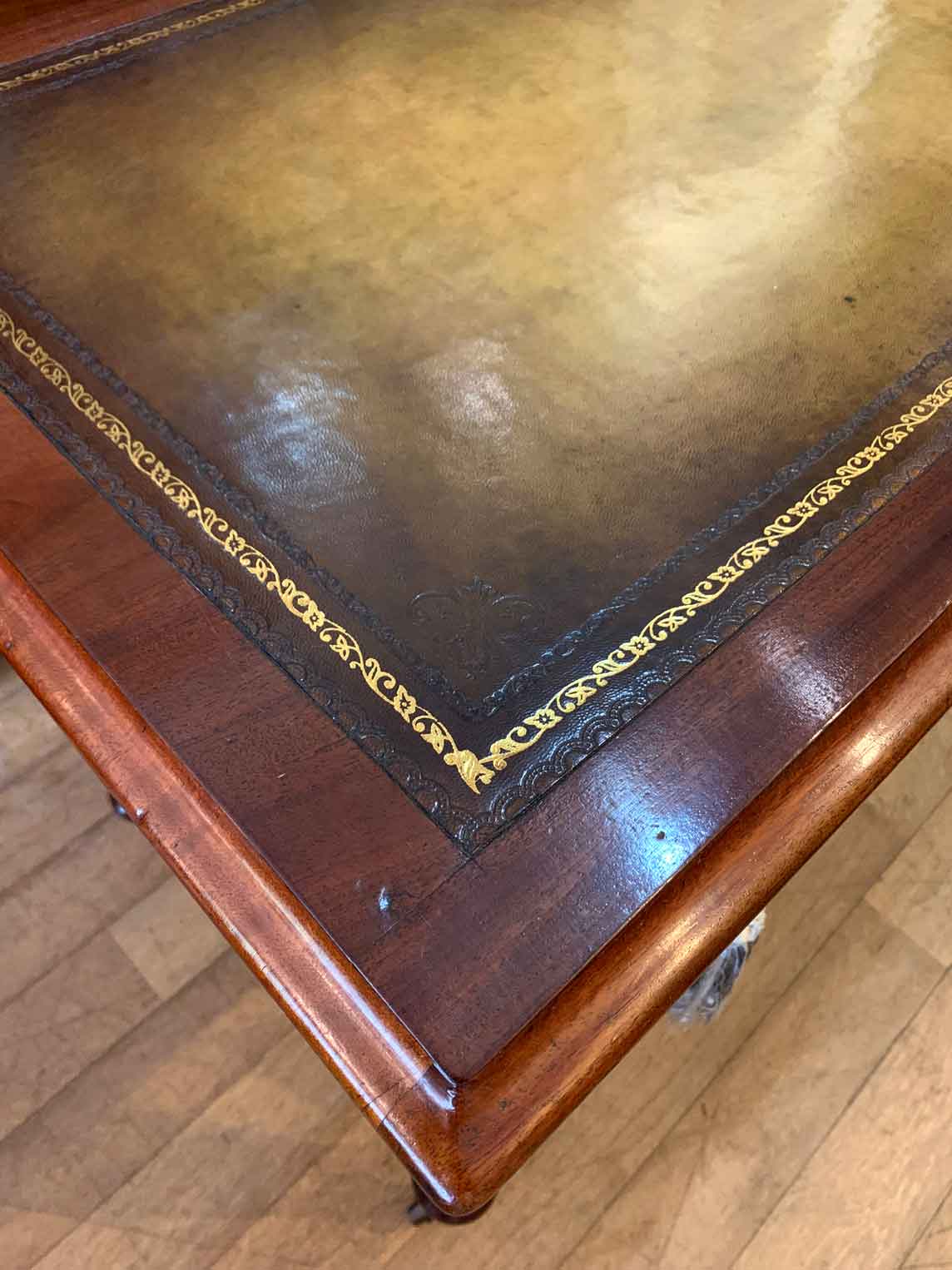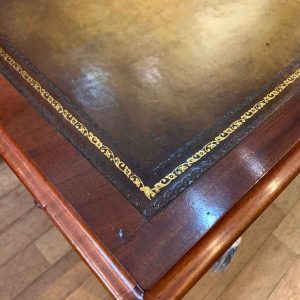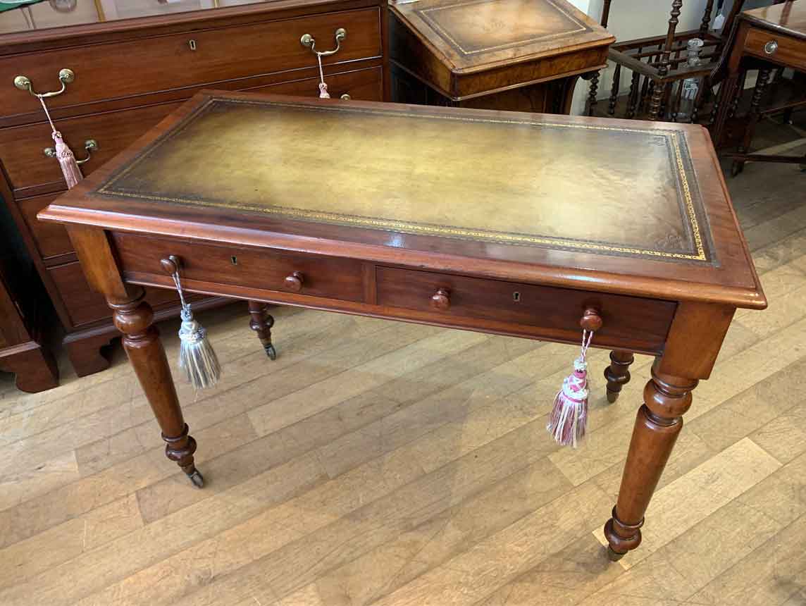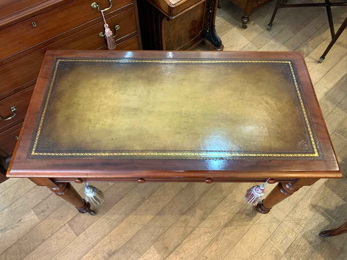 19th Century Victorian Mahogany Writing Table with a leather top, mahogany drawers and bun handles with working keys. On turned legs, with brass castors to base.