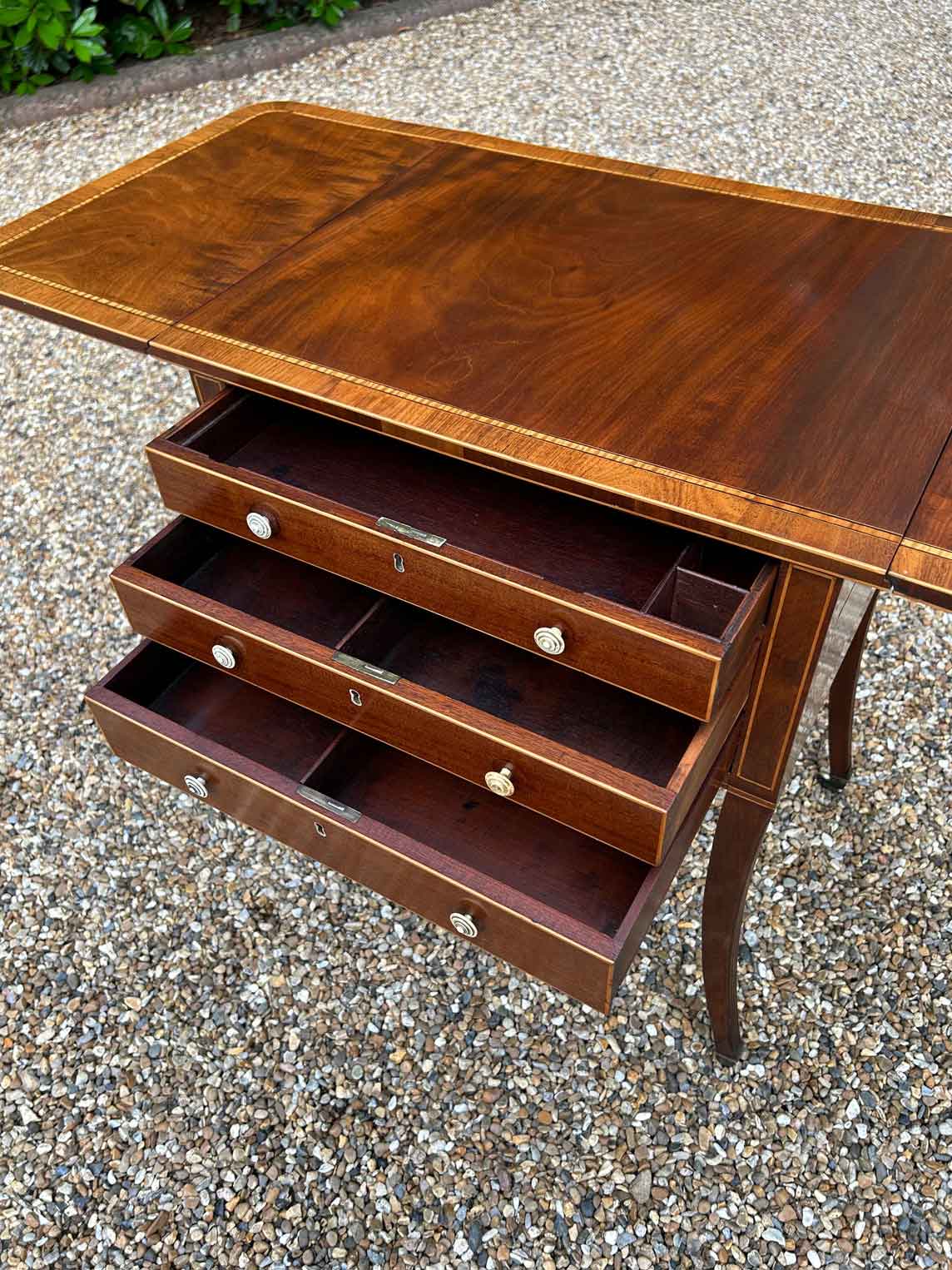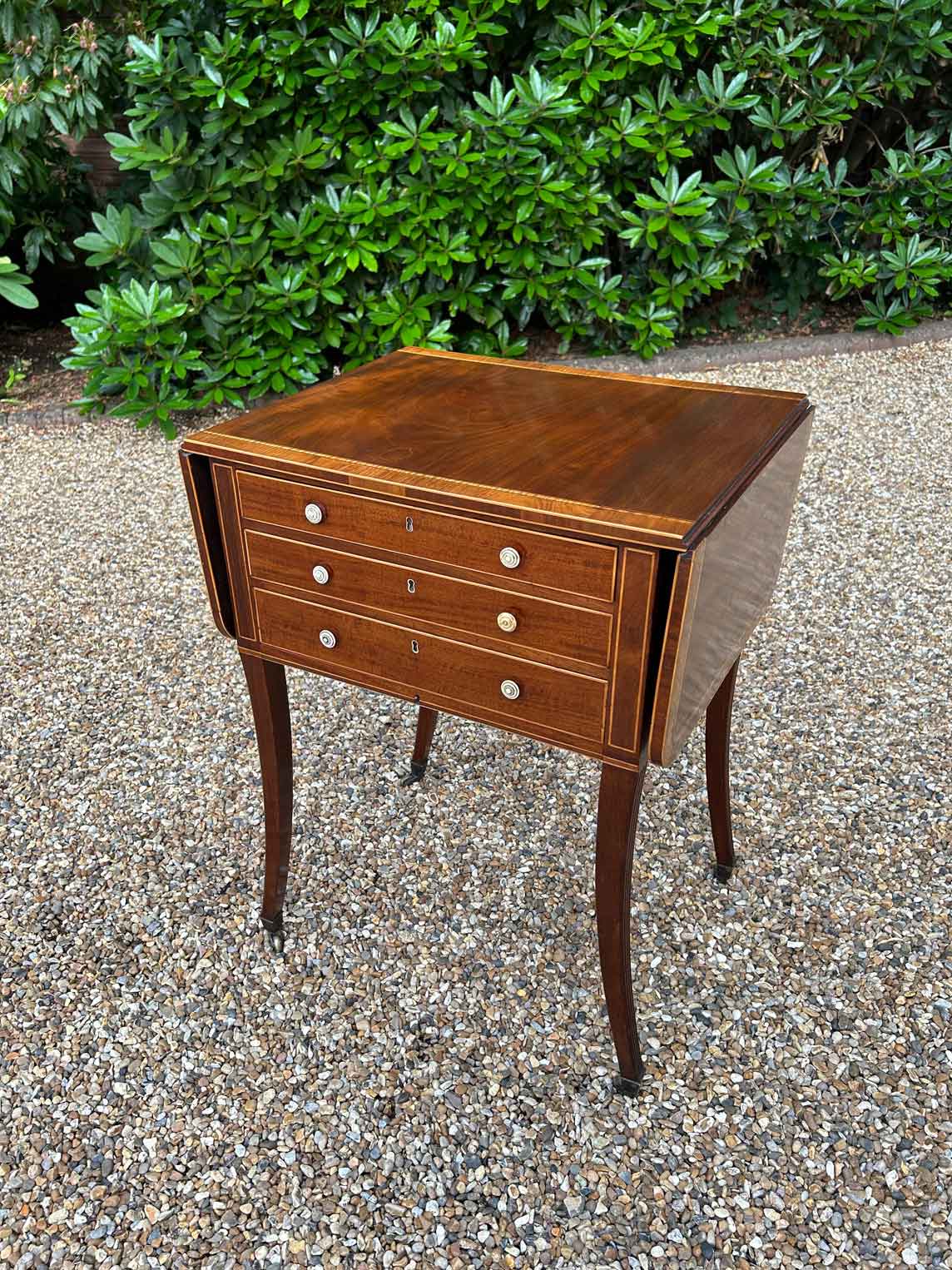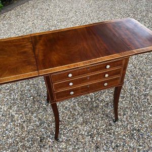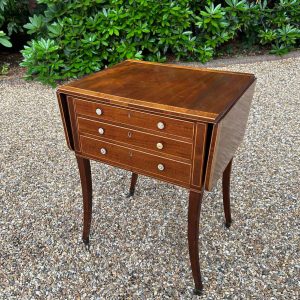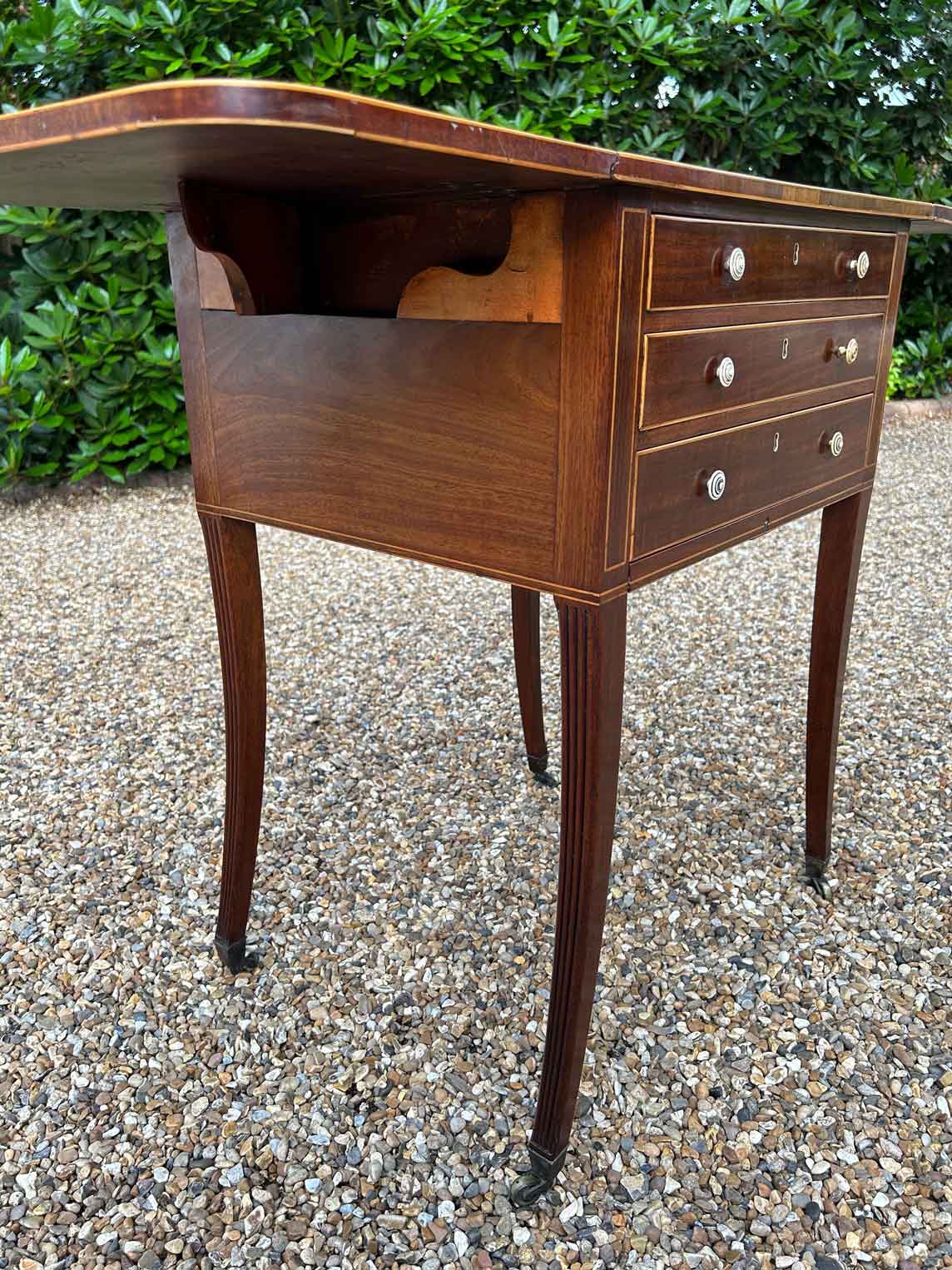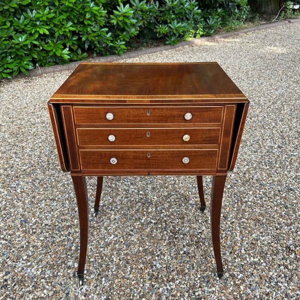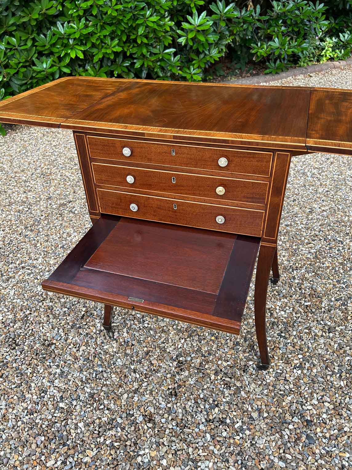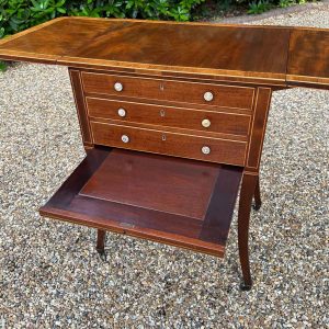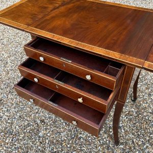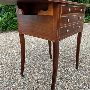 A very high quality George III Inlaid Mahogany Drop Leaf Occasional / Work Table, fitted with three mahogany lined drawers and swept out reeded legs with brass castors.