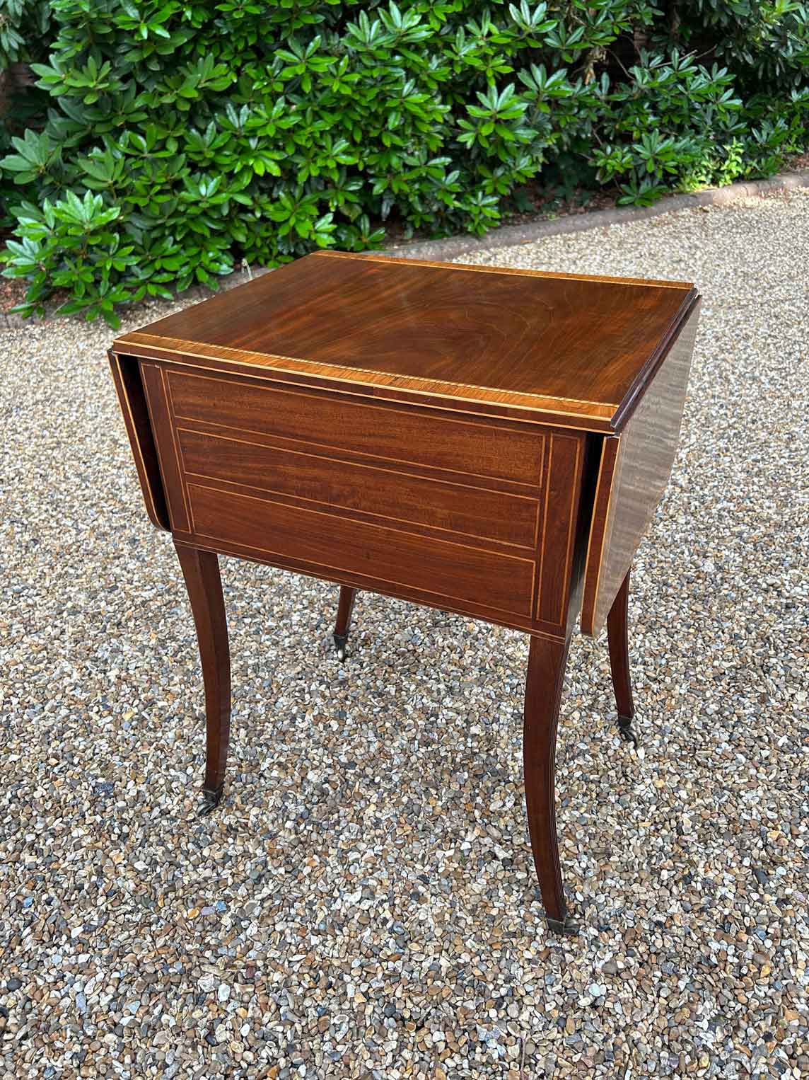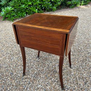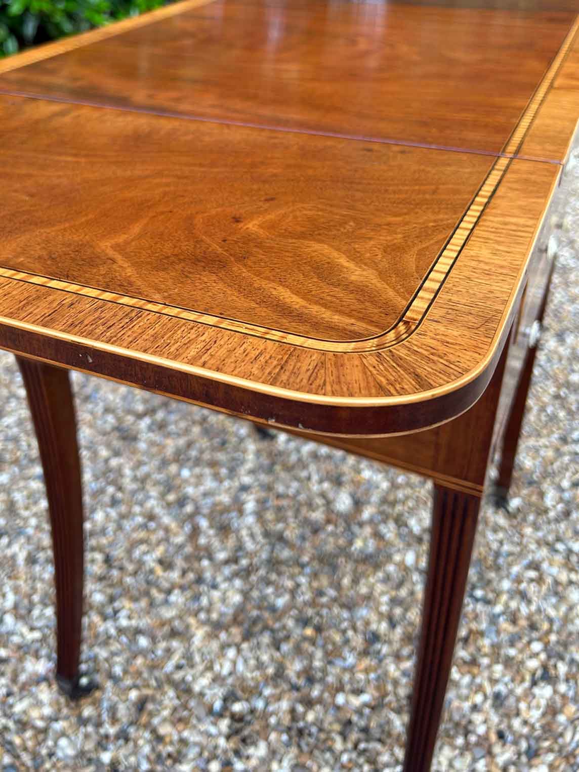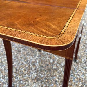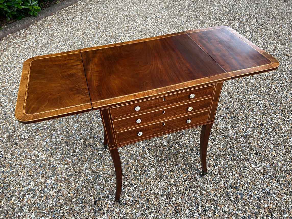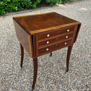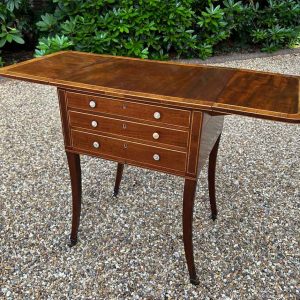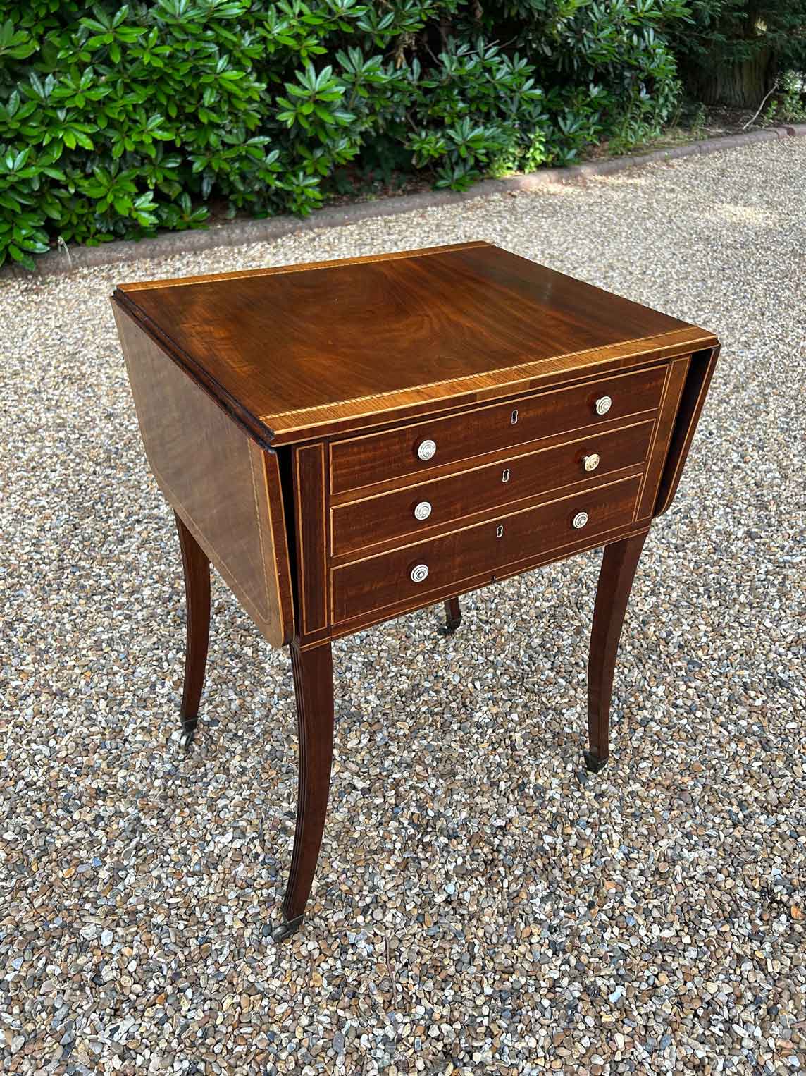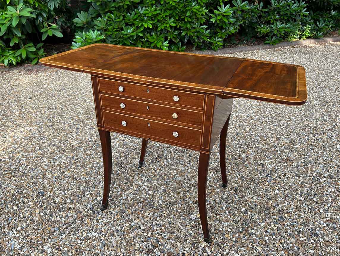 A very high quality George III Inlaid Mahogany Drop Leaf Occasional / Work Table, fitted with three mahogany lined drawers and swept out reeded legs with brass castors.
