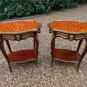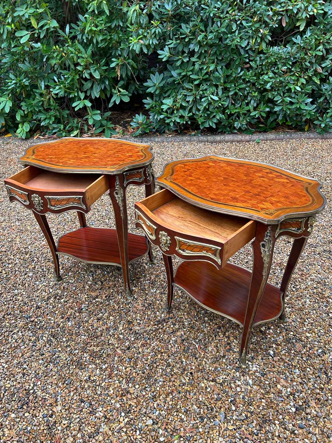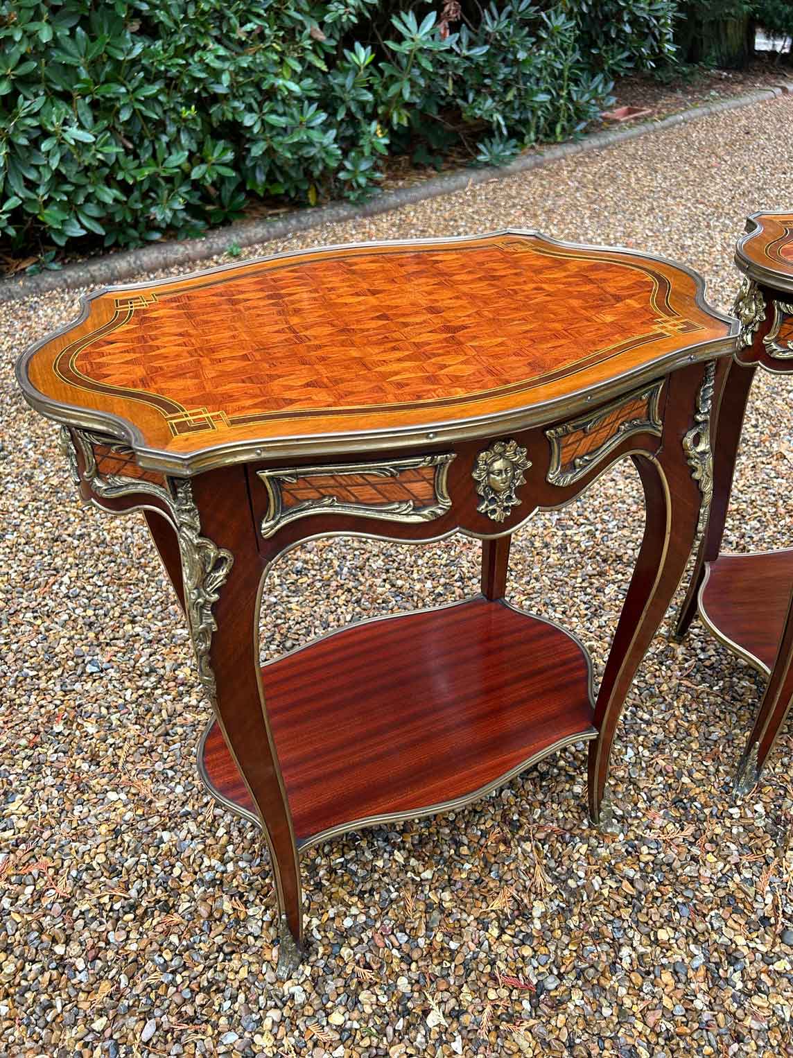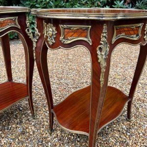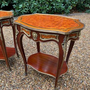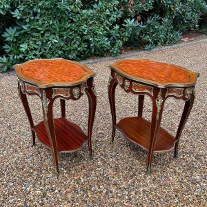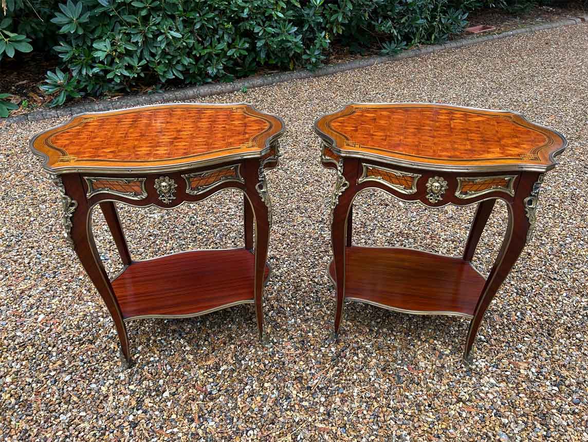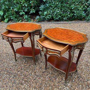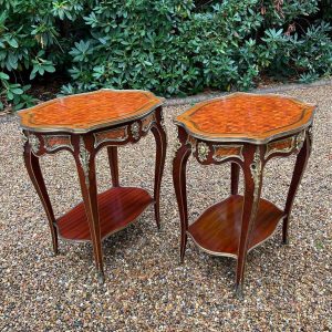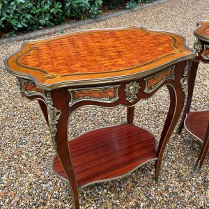 A pair of high quality 1920’s / 30’s French Side Tables, each with Parquetry and Inlay top above a frieze drawer raised upon cabriole legs with gilt metal mounts.
