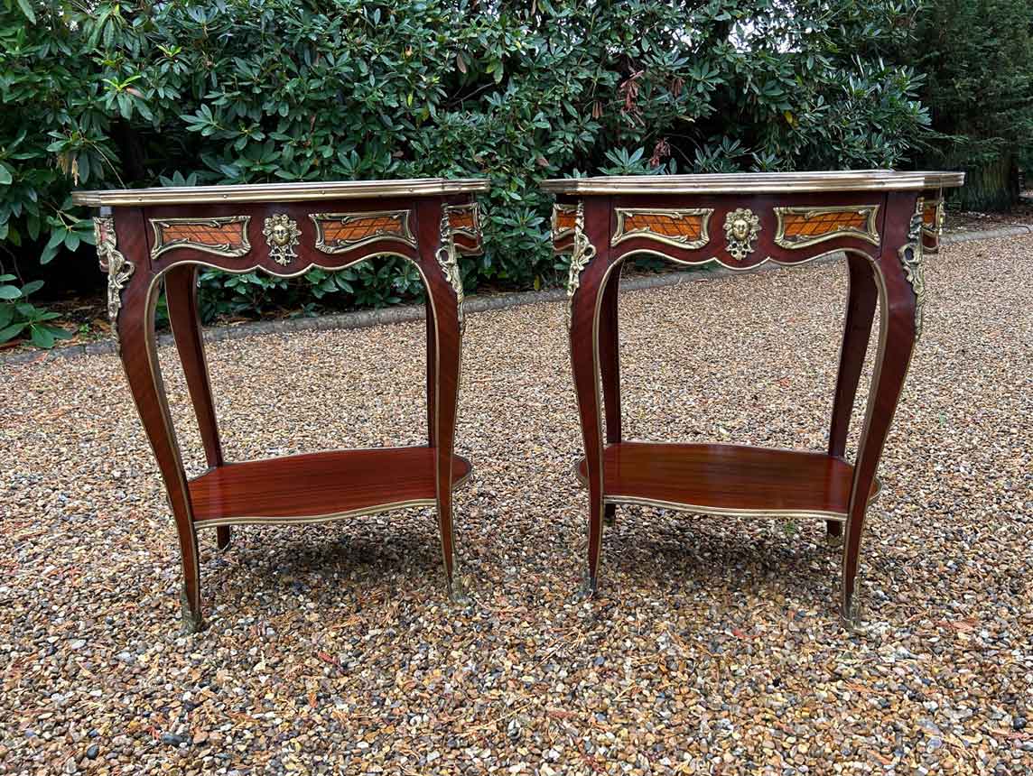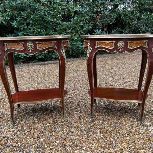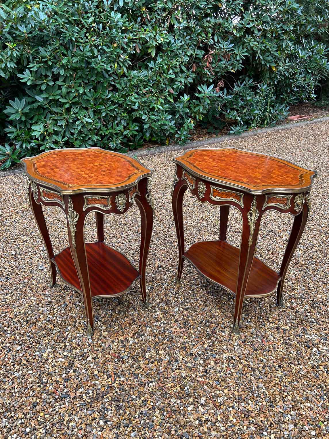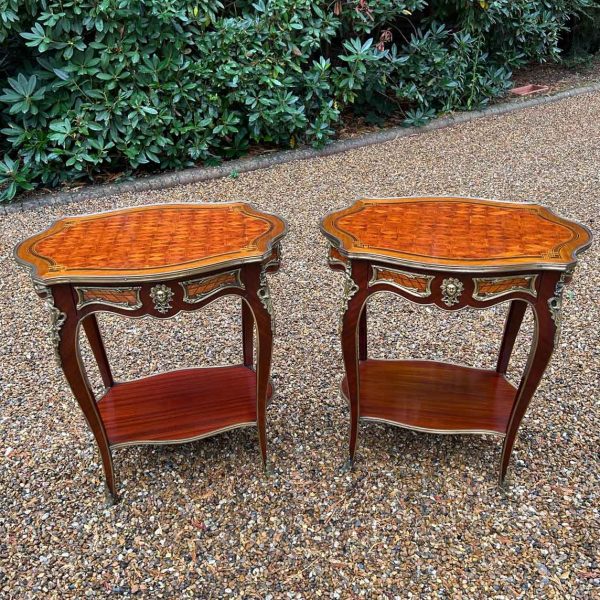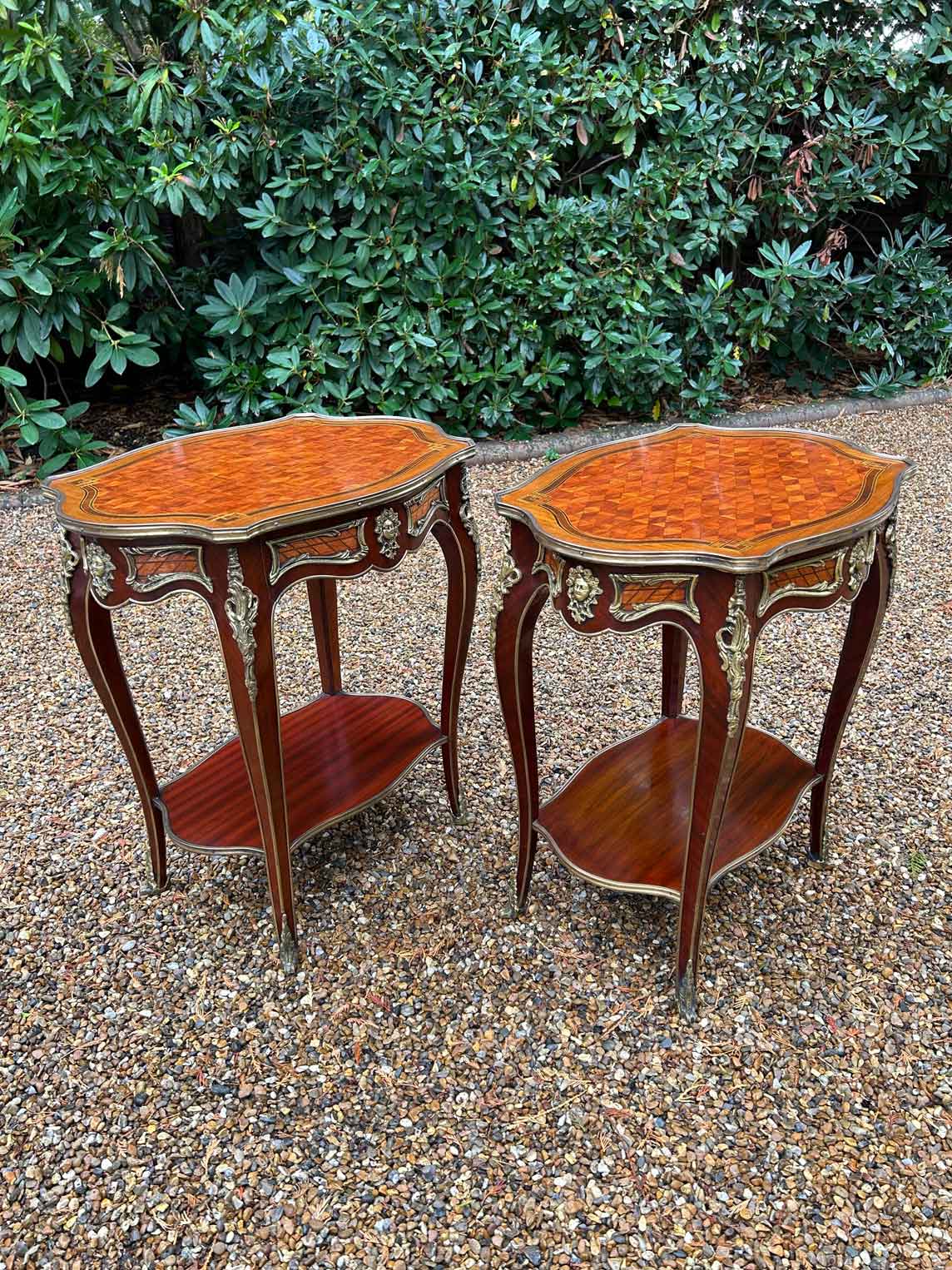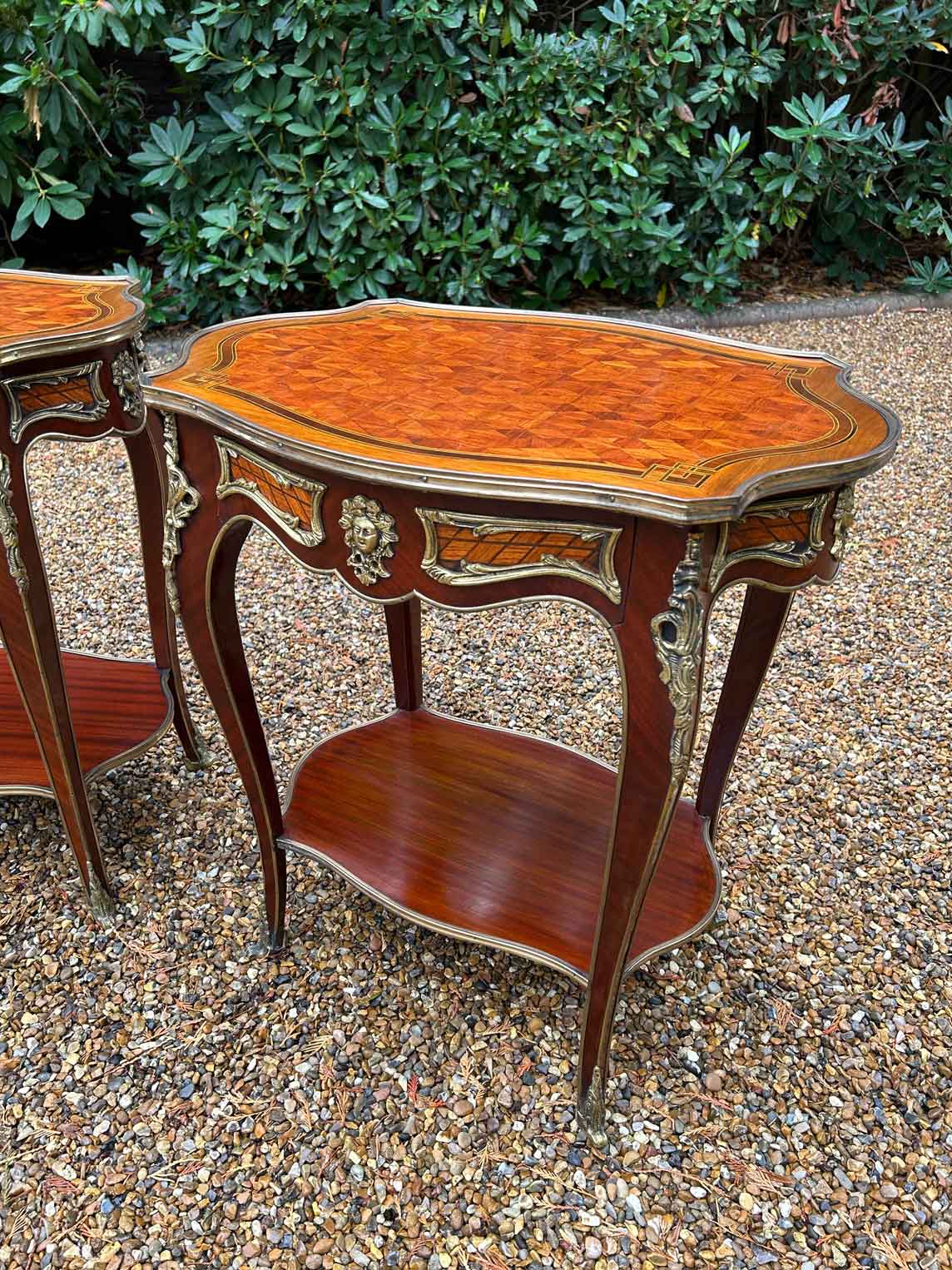 A pair of high quality 1920’s / 30’s French Side Tables, each with Parquetry and Inlay top above a frieze drawer raised upon cabriole legs with gilt metal mounts.