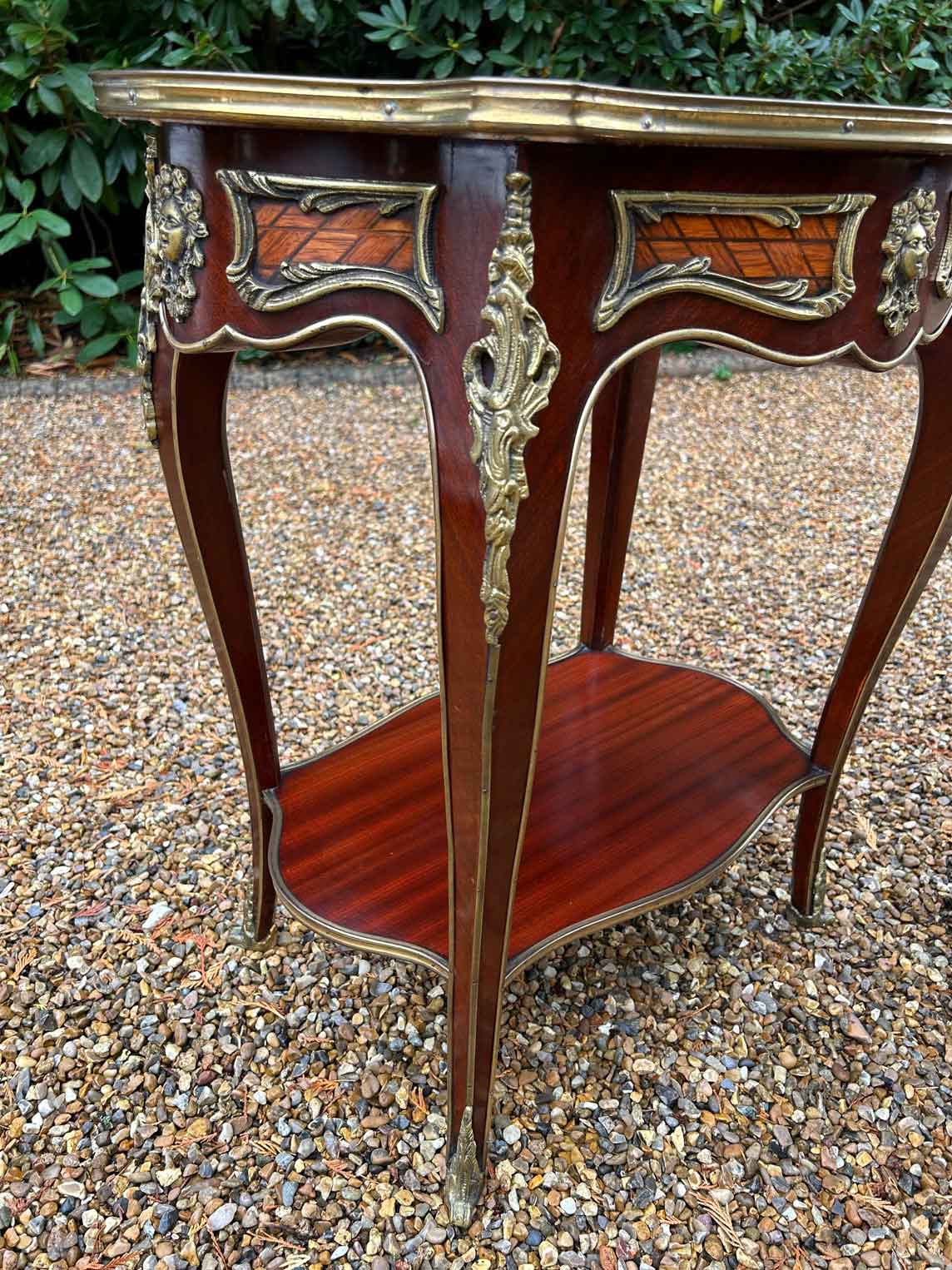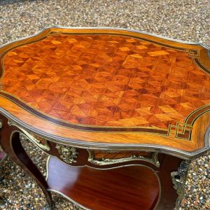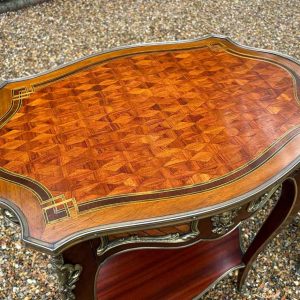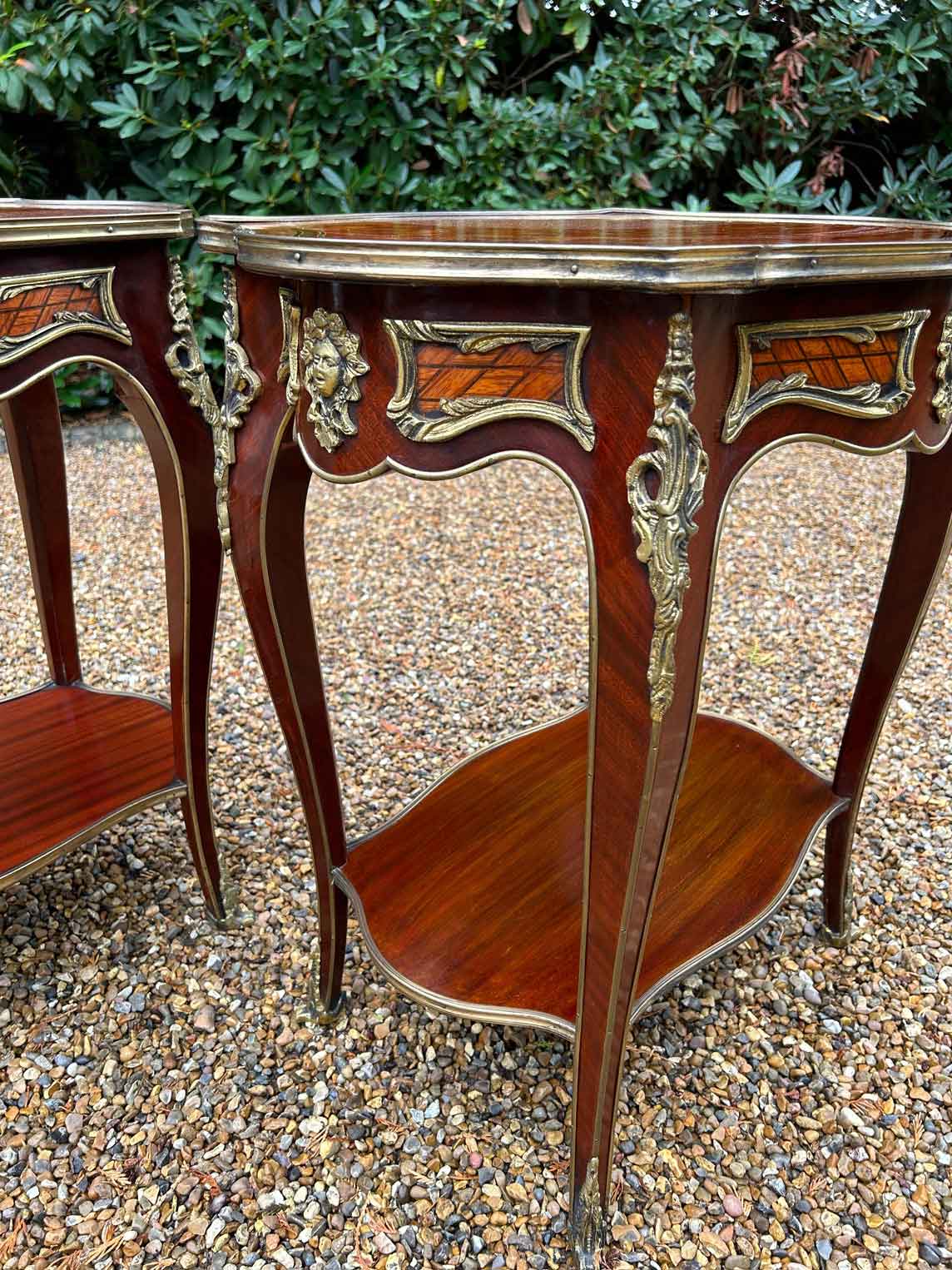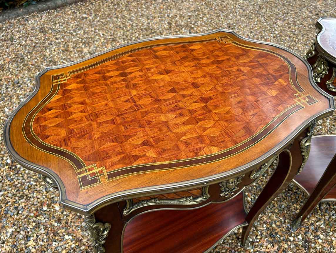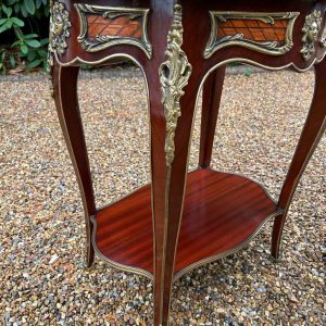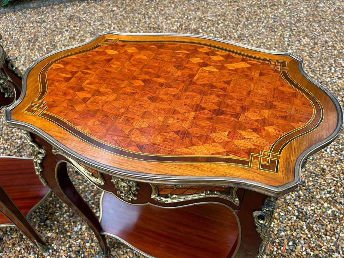A pair of high quality 1920’s / 30’s French Side Tables, each with Parquetry and Inlay top above a frieze drawer raised upon cabriole legs with gilt metal mounts.