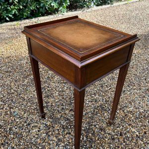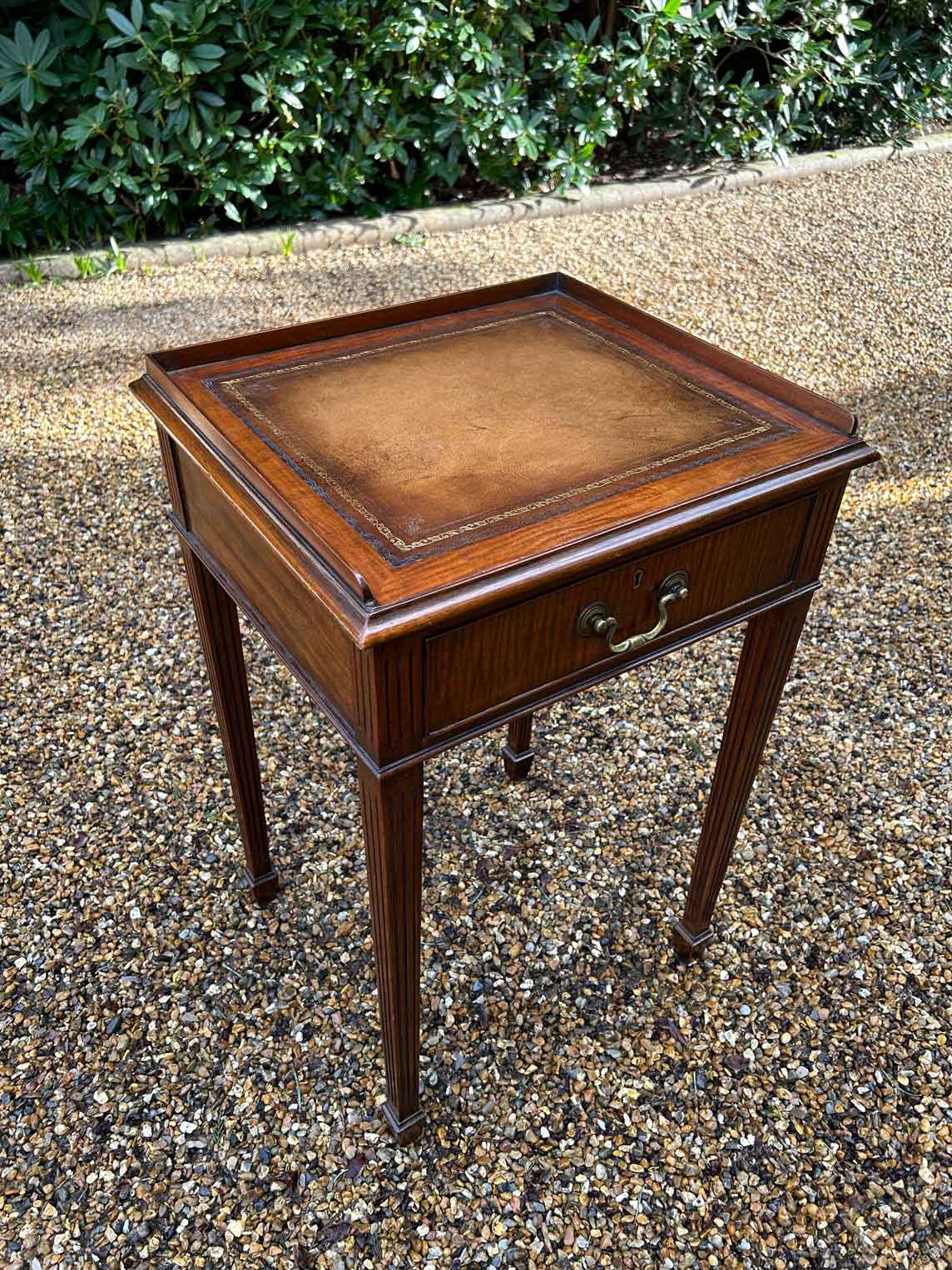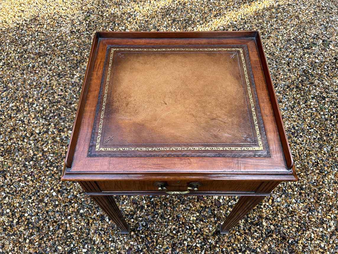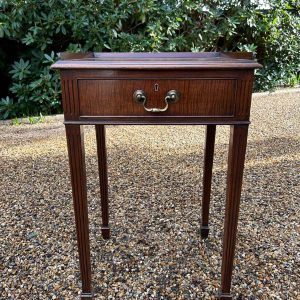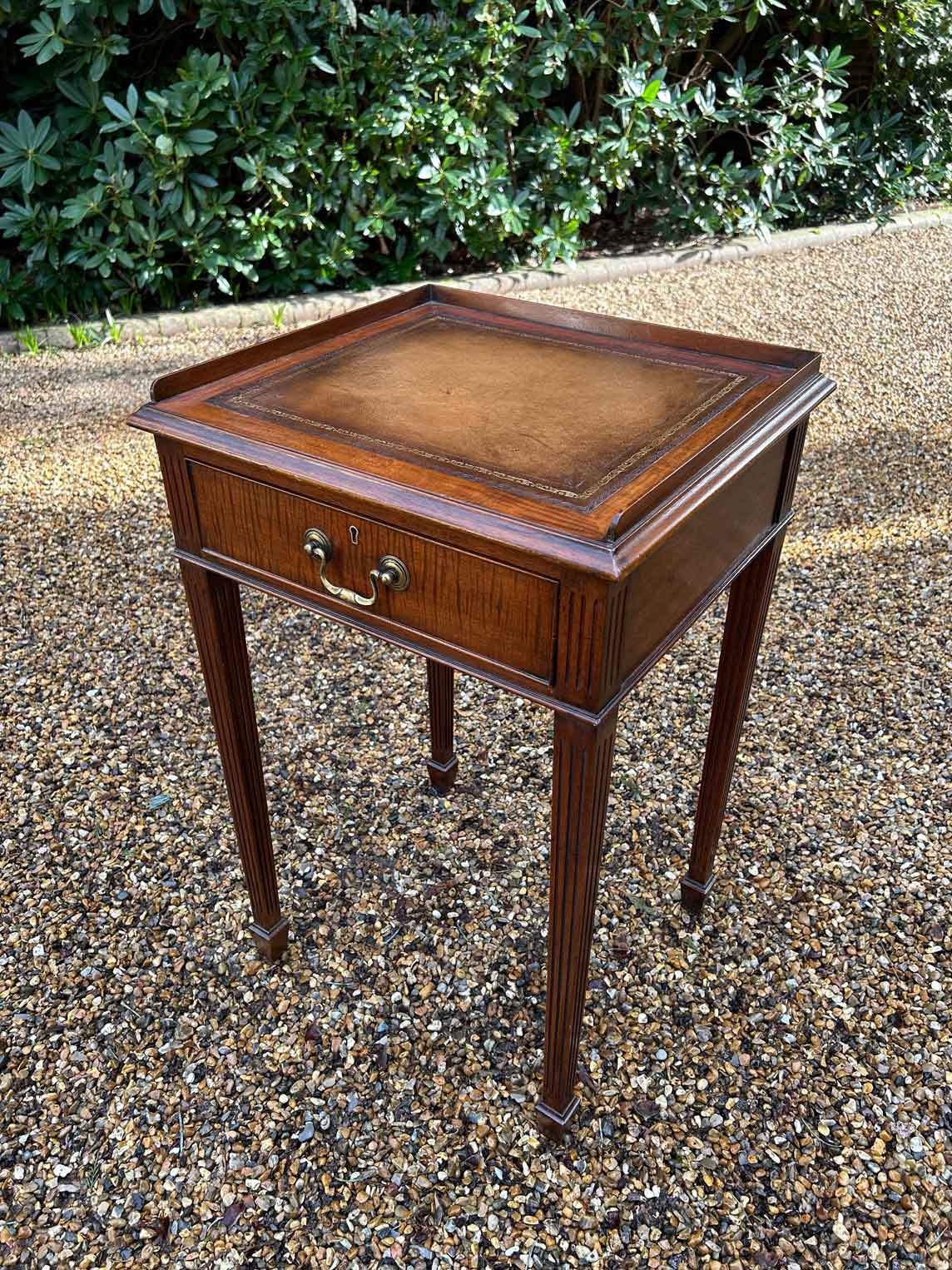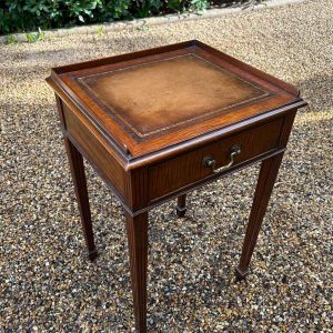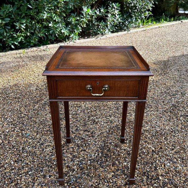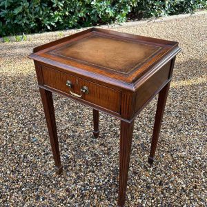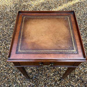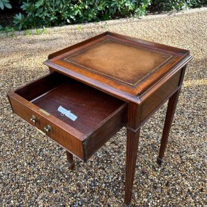 19th Century Mahogany Side Table with a leather and tooled writing surface, a fitted single drawer with a brass swan neck handle. Standing on square reeded legs with spade feet.