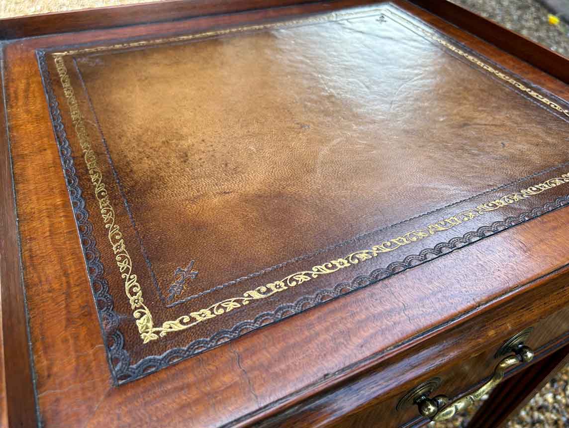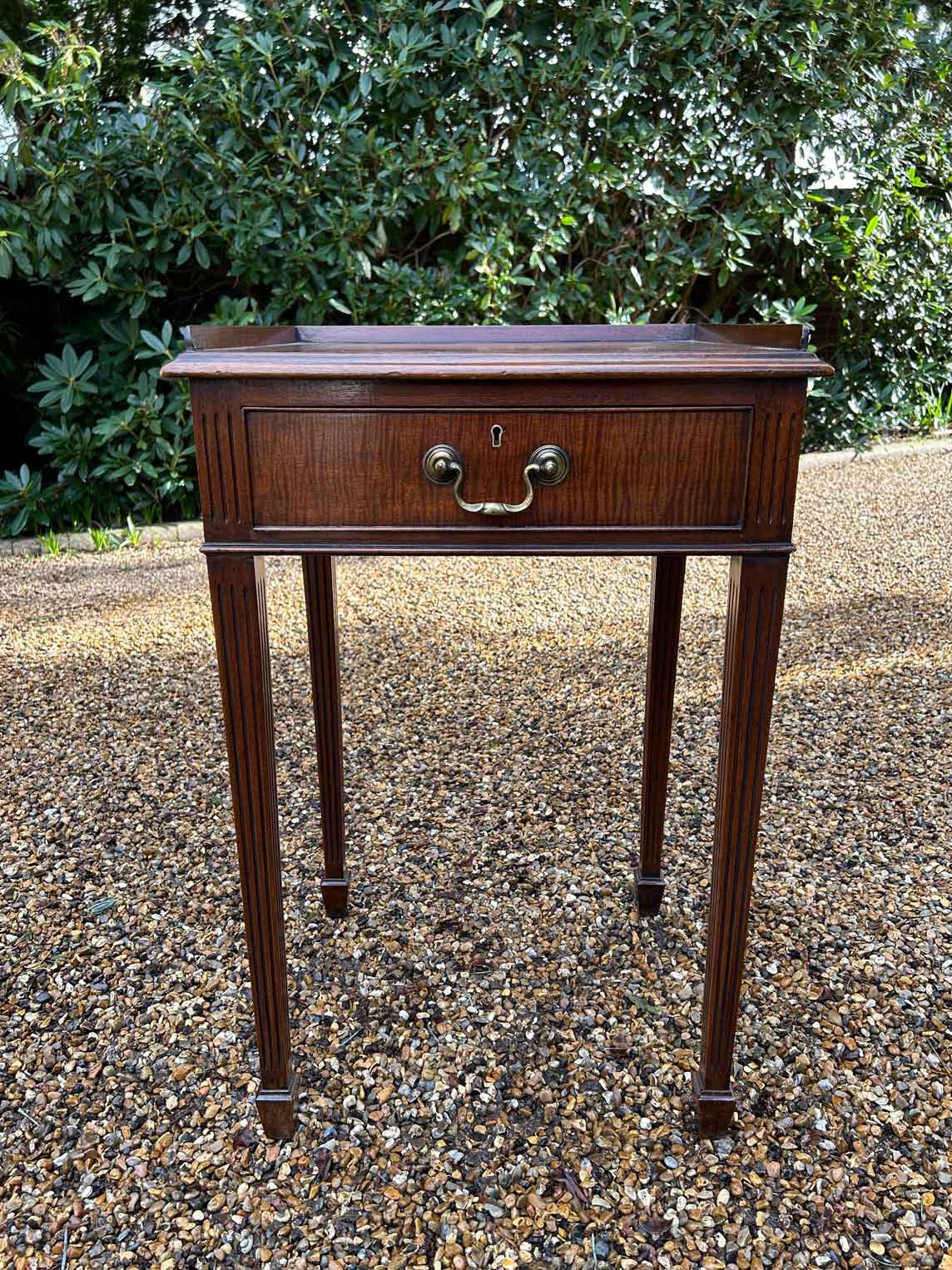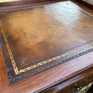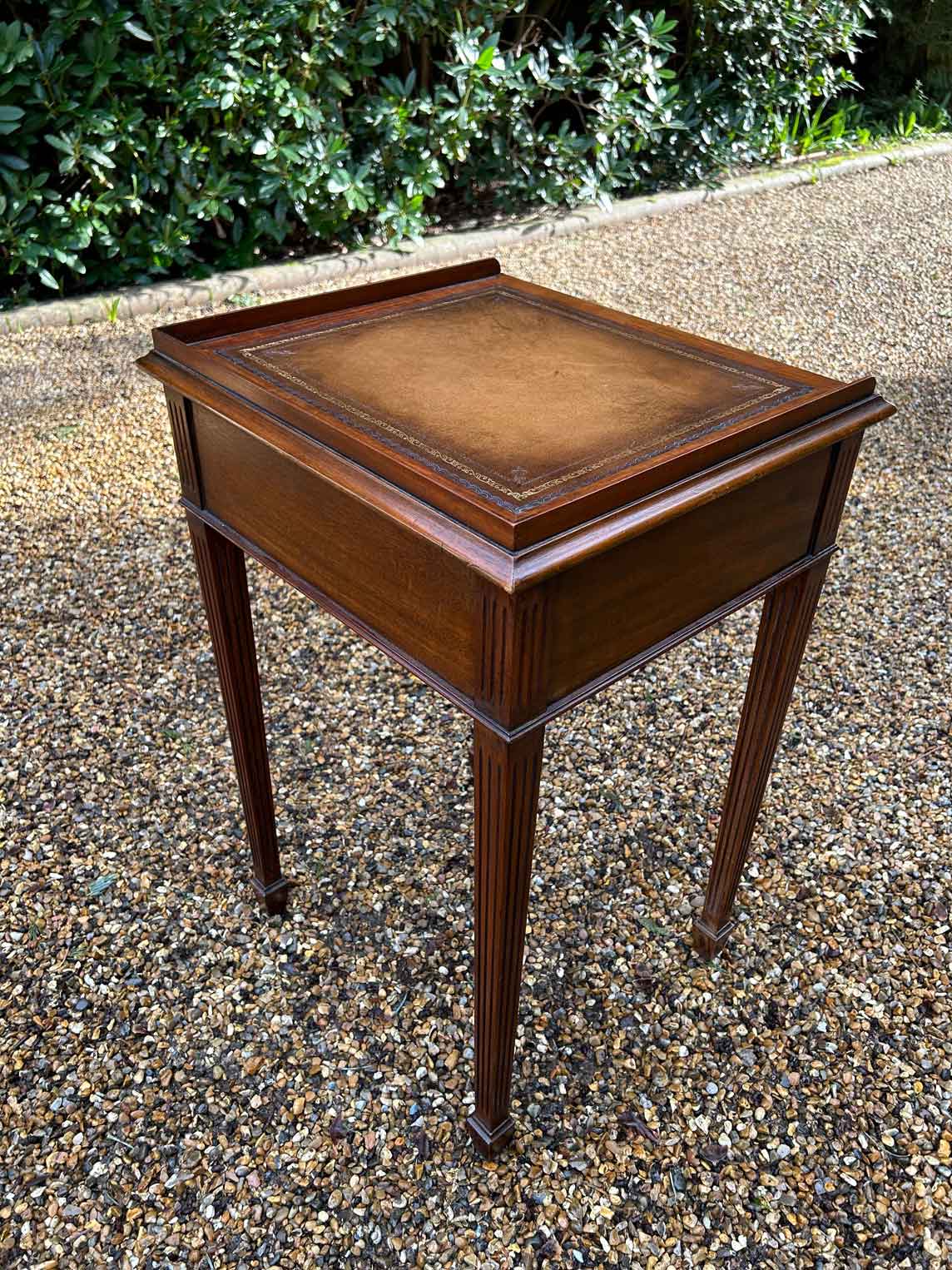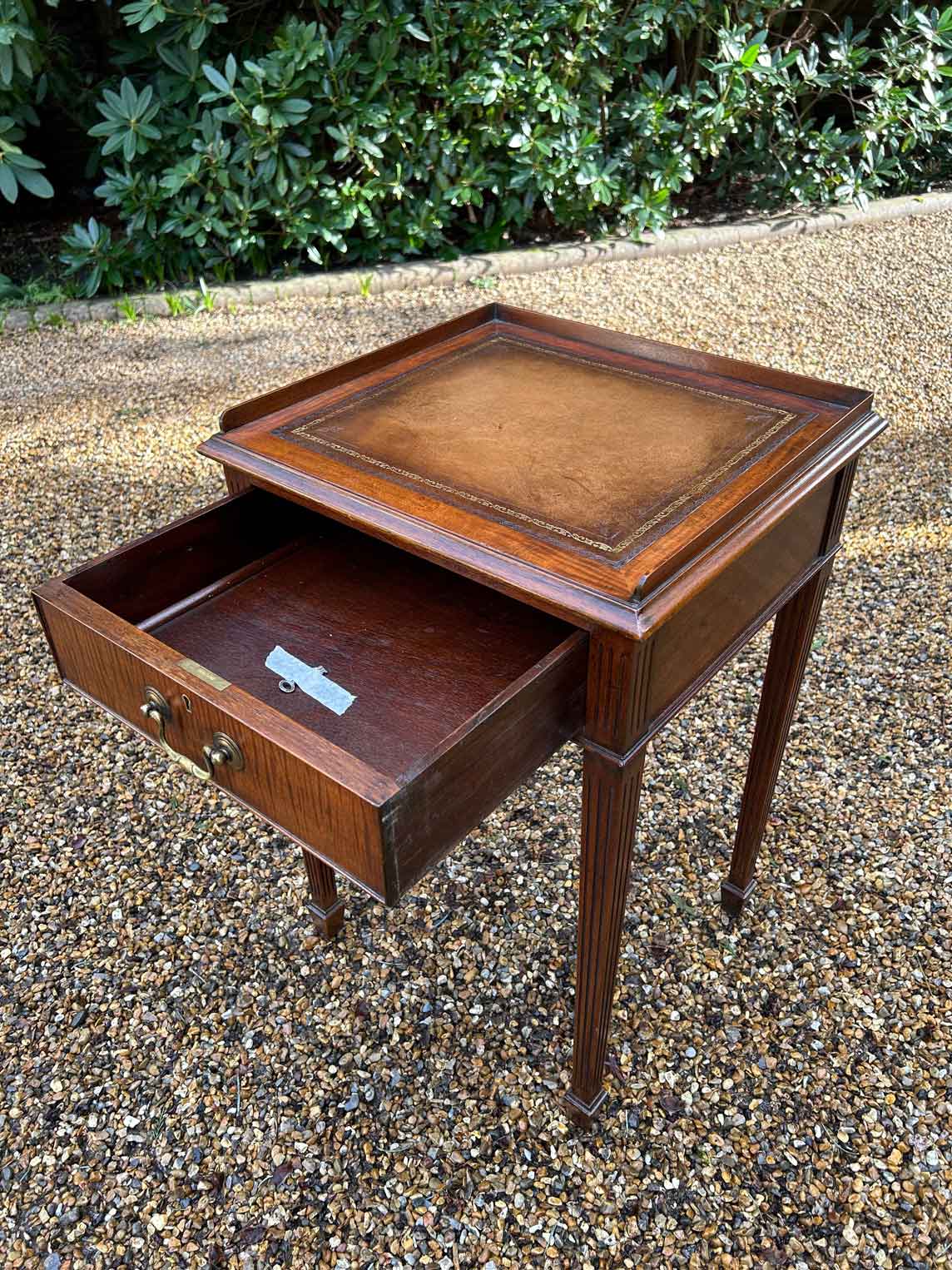 19th Century Mahogany Side Table with a leather and tooled writing surface, a fitted single drawer with a brass swan neck handle. Standing on square reeded legs with spade feet.