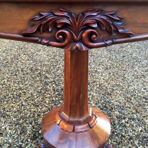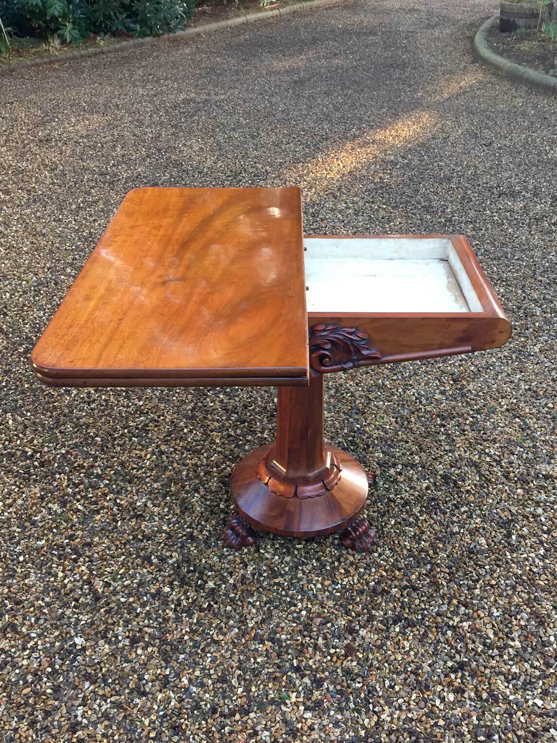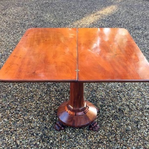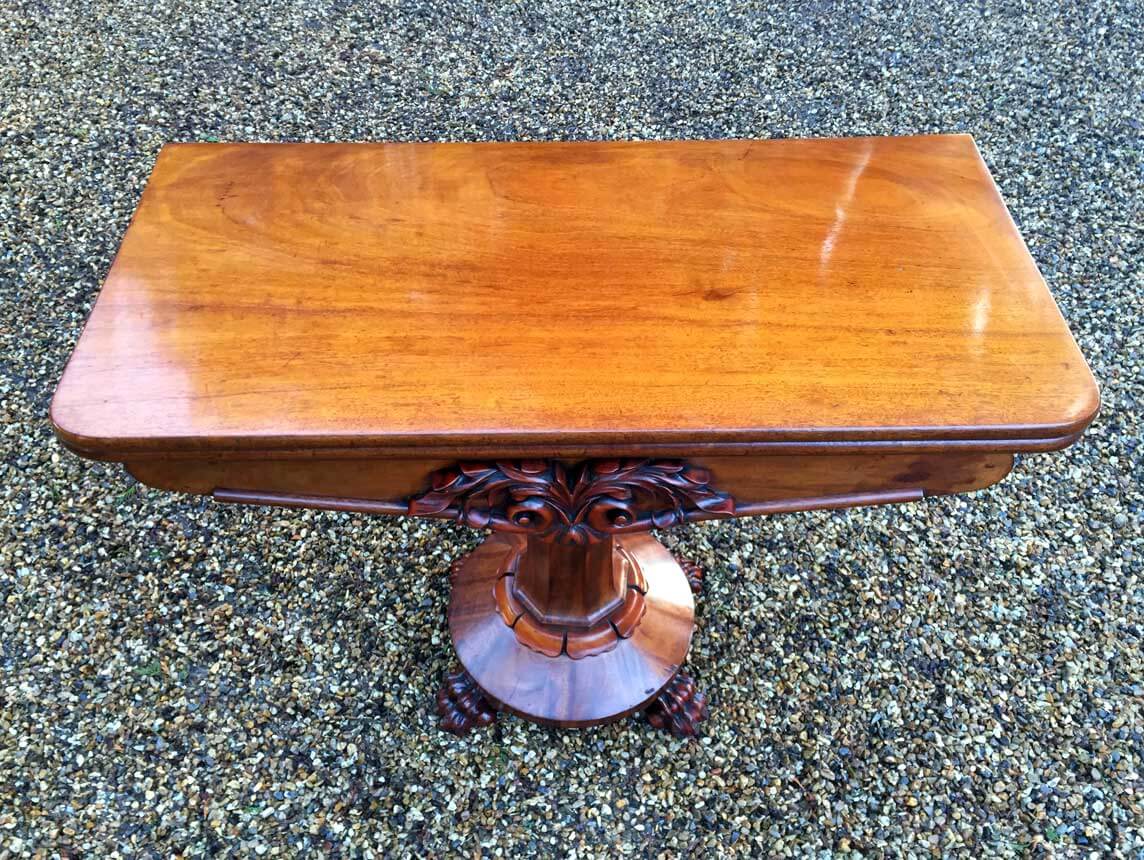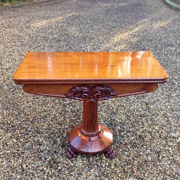 William IV Mahogany fold-over Tea Table with a carved foliate frieze, raised on an octagonal stem and circular platform with carved claw feet.