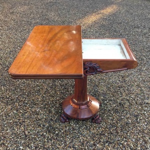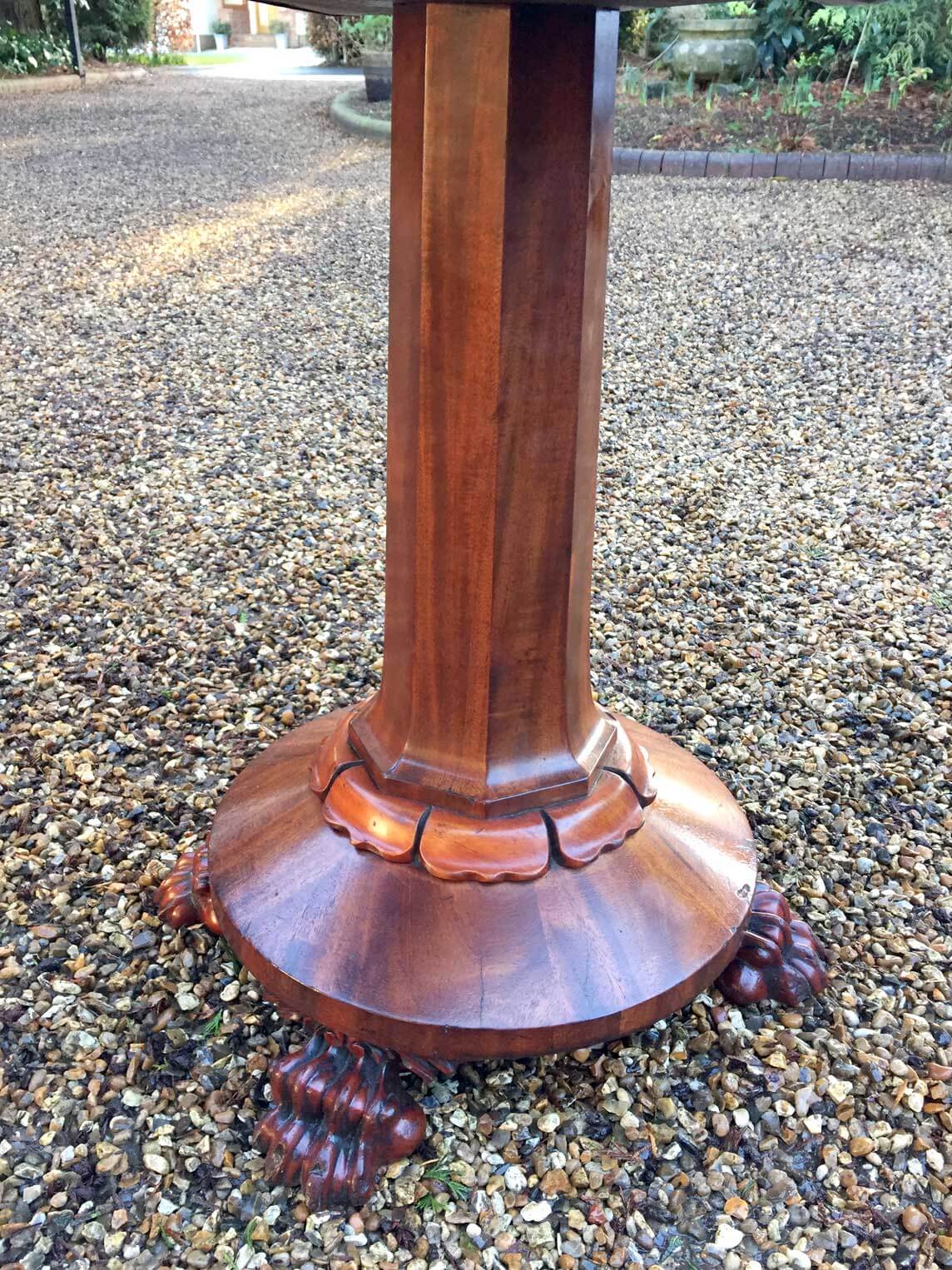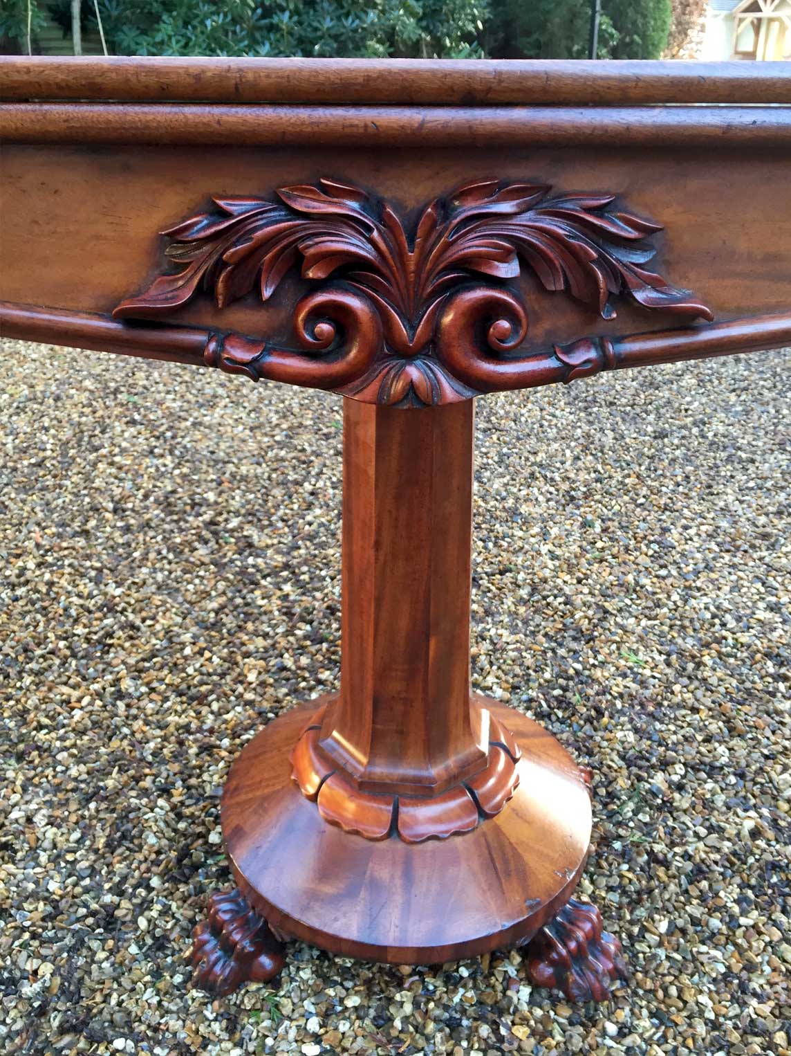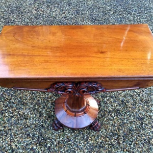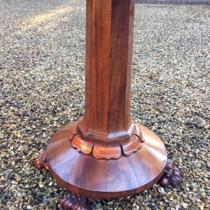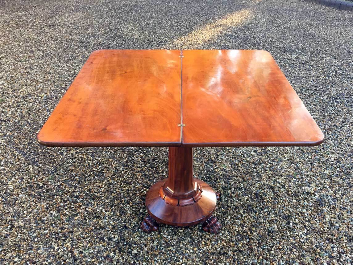 William IV Mahogany fold-over Tea Table with a carved foliate frieze, raised on an octagonal stem and circular platform with carved claw feet.