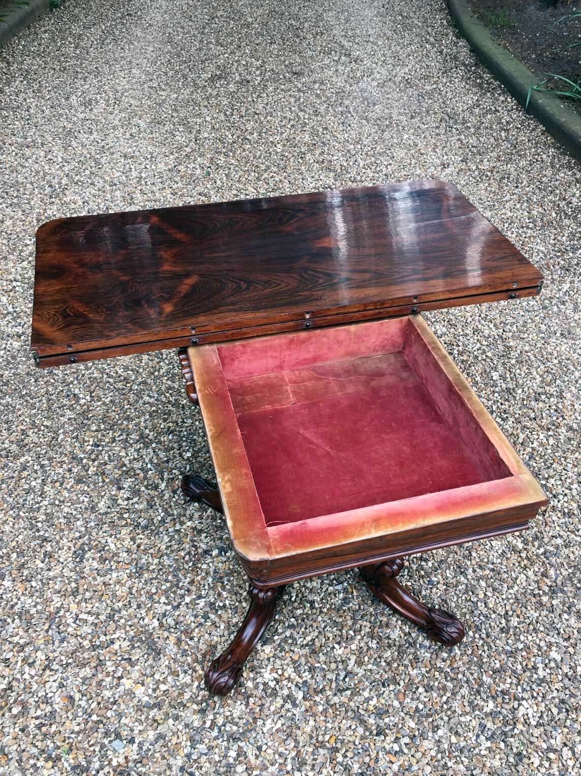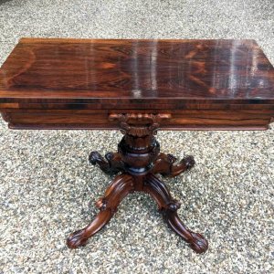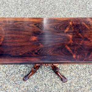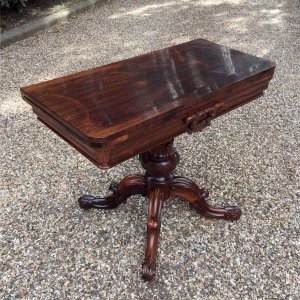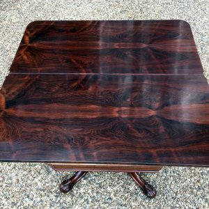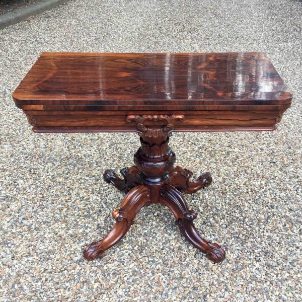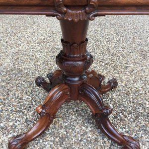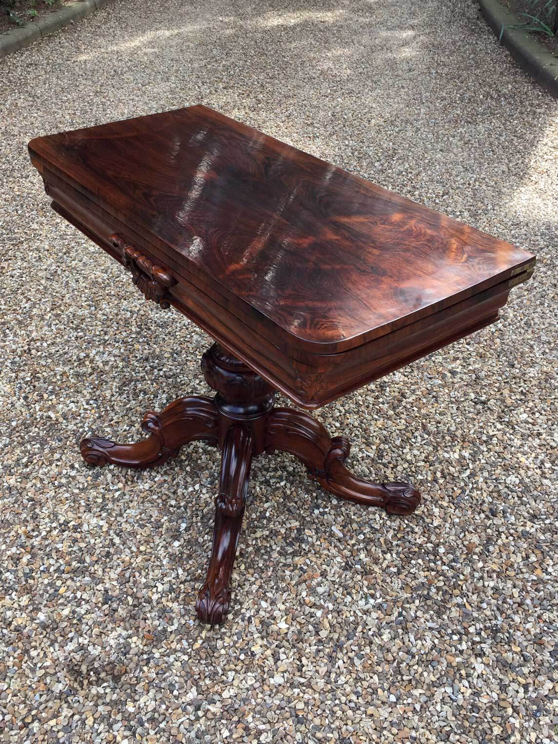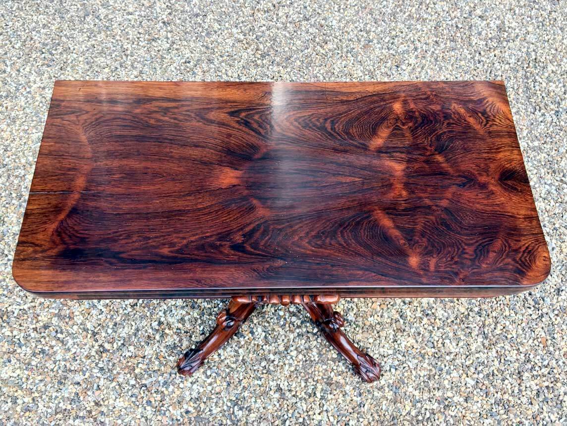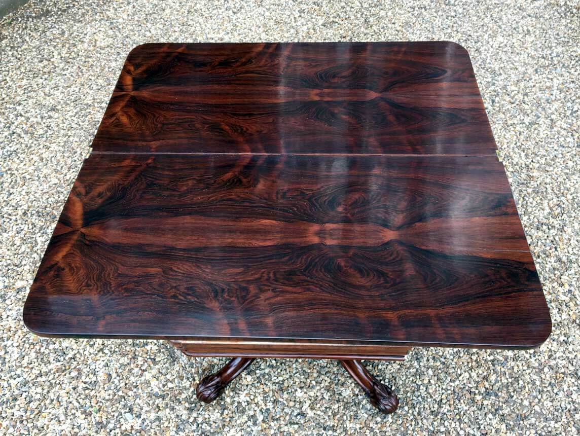 A 19th Century figured William IV Rosewood Tea Table. The top rotates by 90 degrees and unfolds to convert a Tea Table. The table stands on an elegant turned central column with four scrolled legs and carved feet with brass castors.