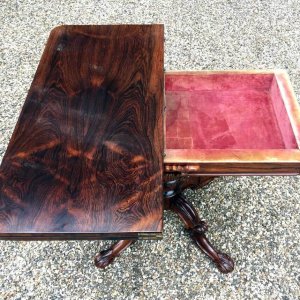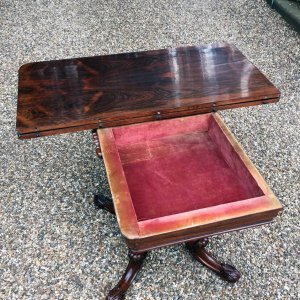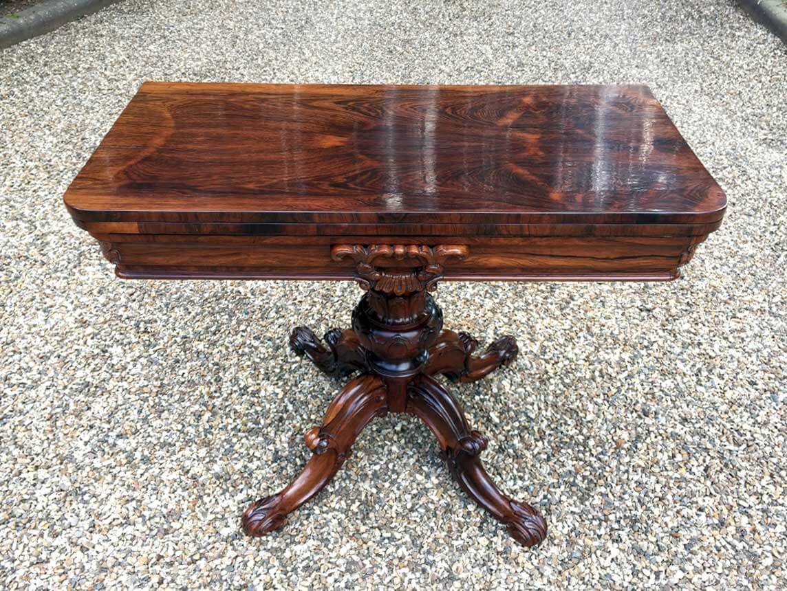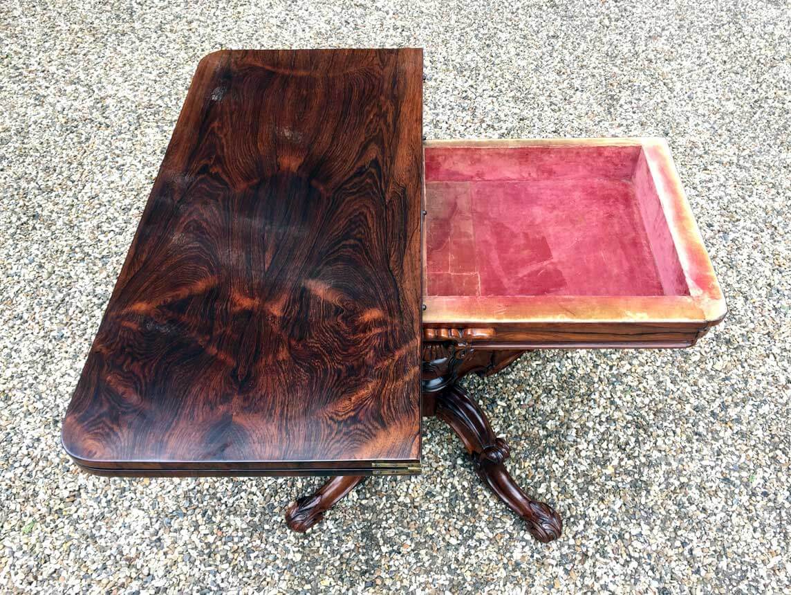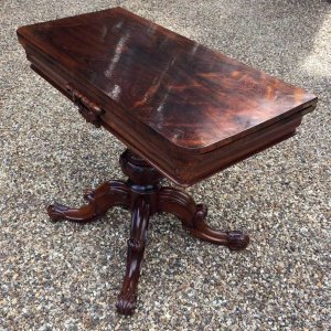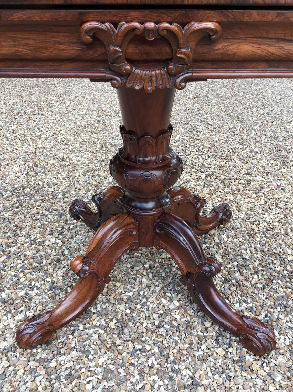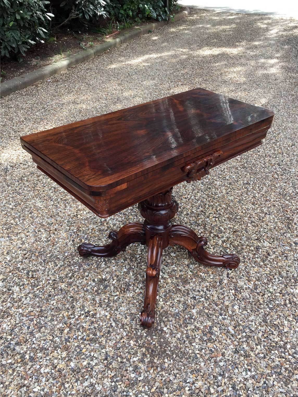 A 19th Century figured William IV Rosewood Tea Table. The top rotates by 90 degrees and unfolds to convert a Tea Table. The table stands on an elegant turned central column with four scrolled legs and carved feet with brass castors.