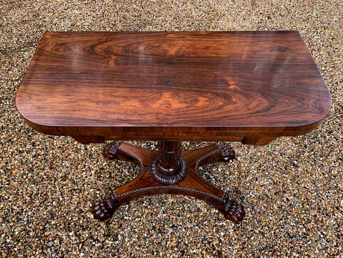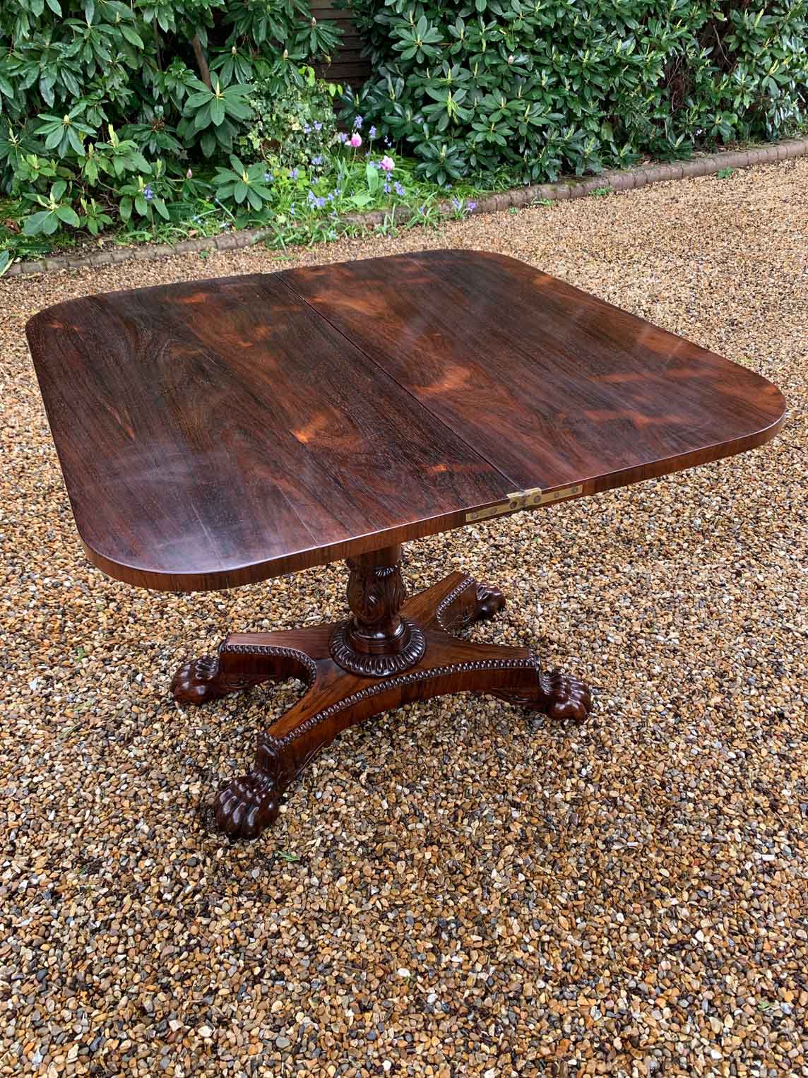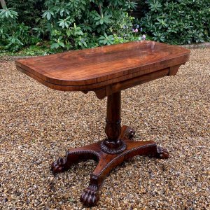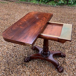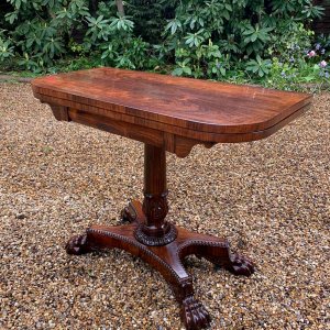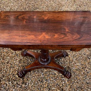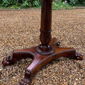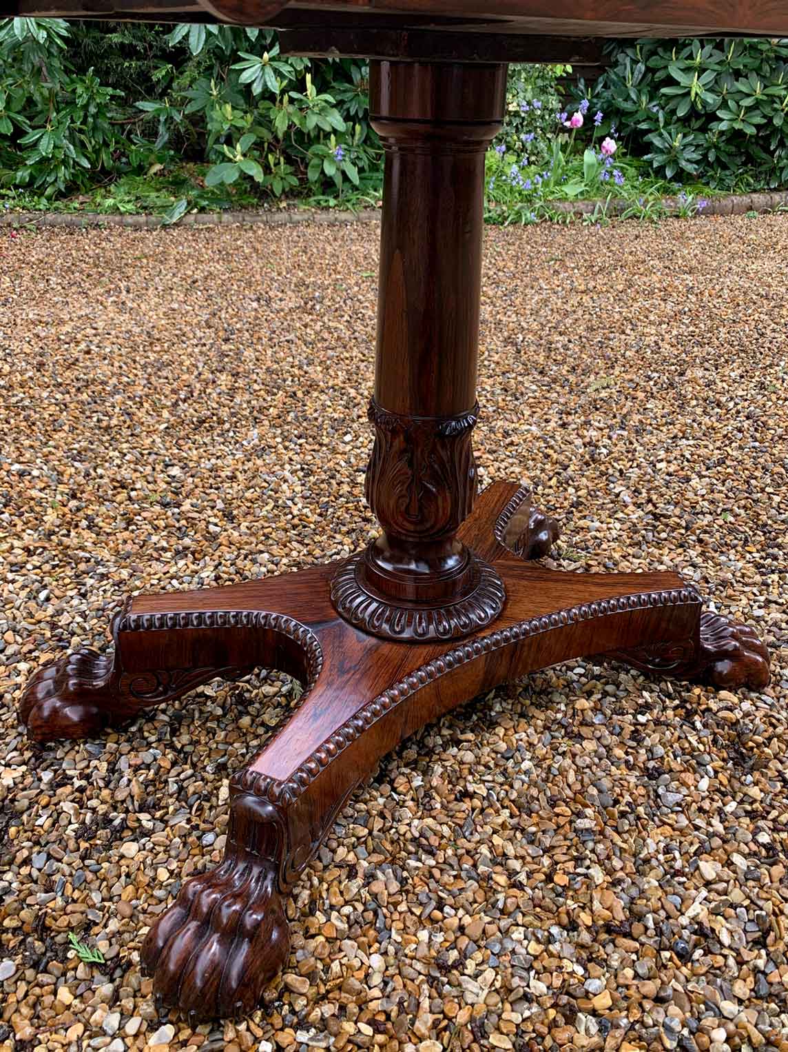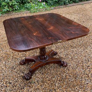 A 19th Century figured William IV Rosewood Tea Table. The top rotates by 90 degrees and unfolds to convert to a Tea Table. The table stands on an elegant turned carved central column with four carved lion claw feet with brass castors.