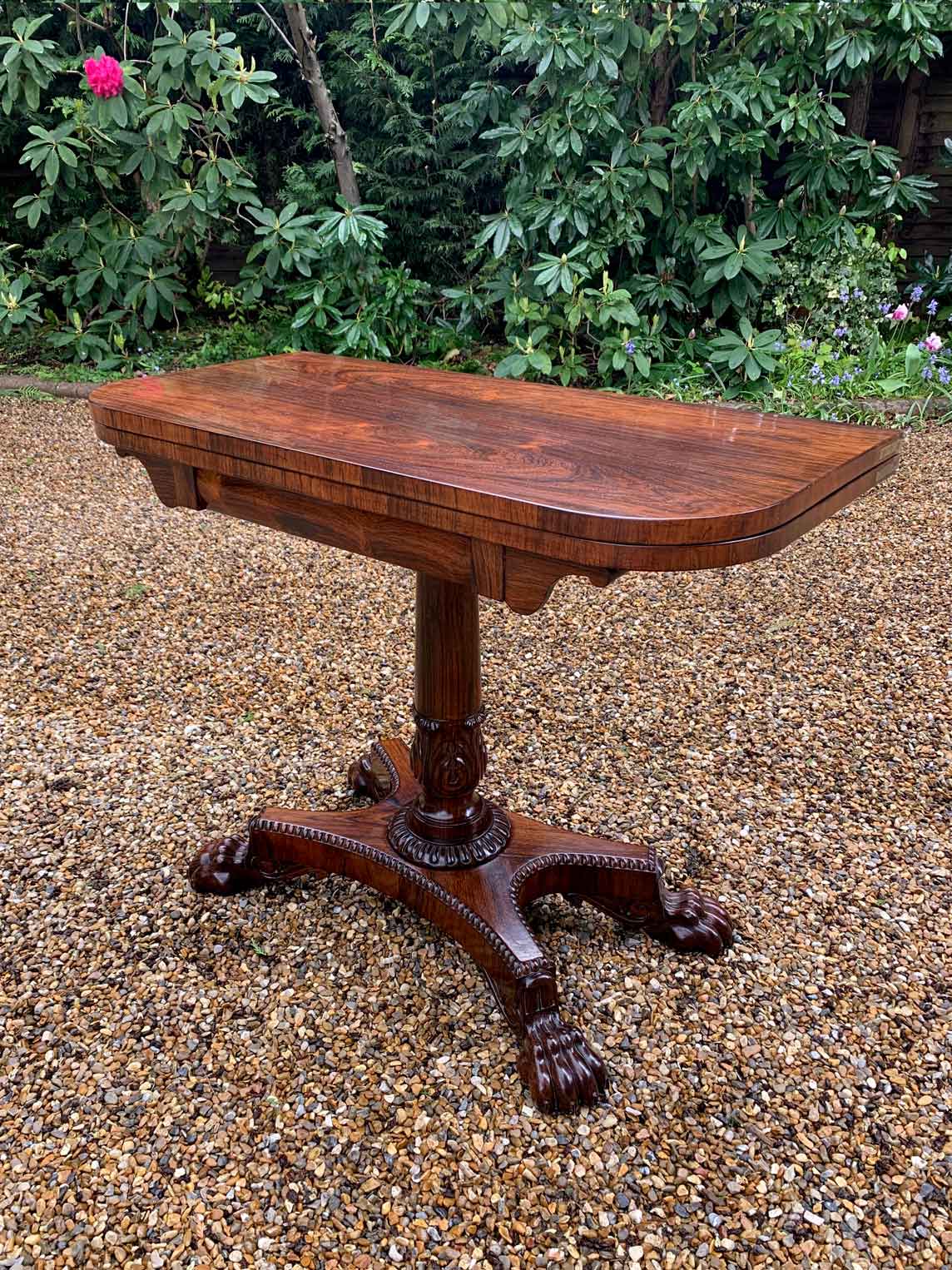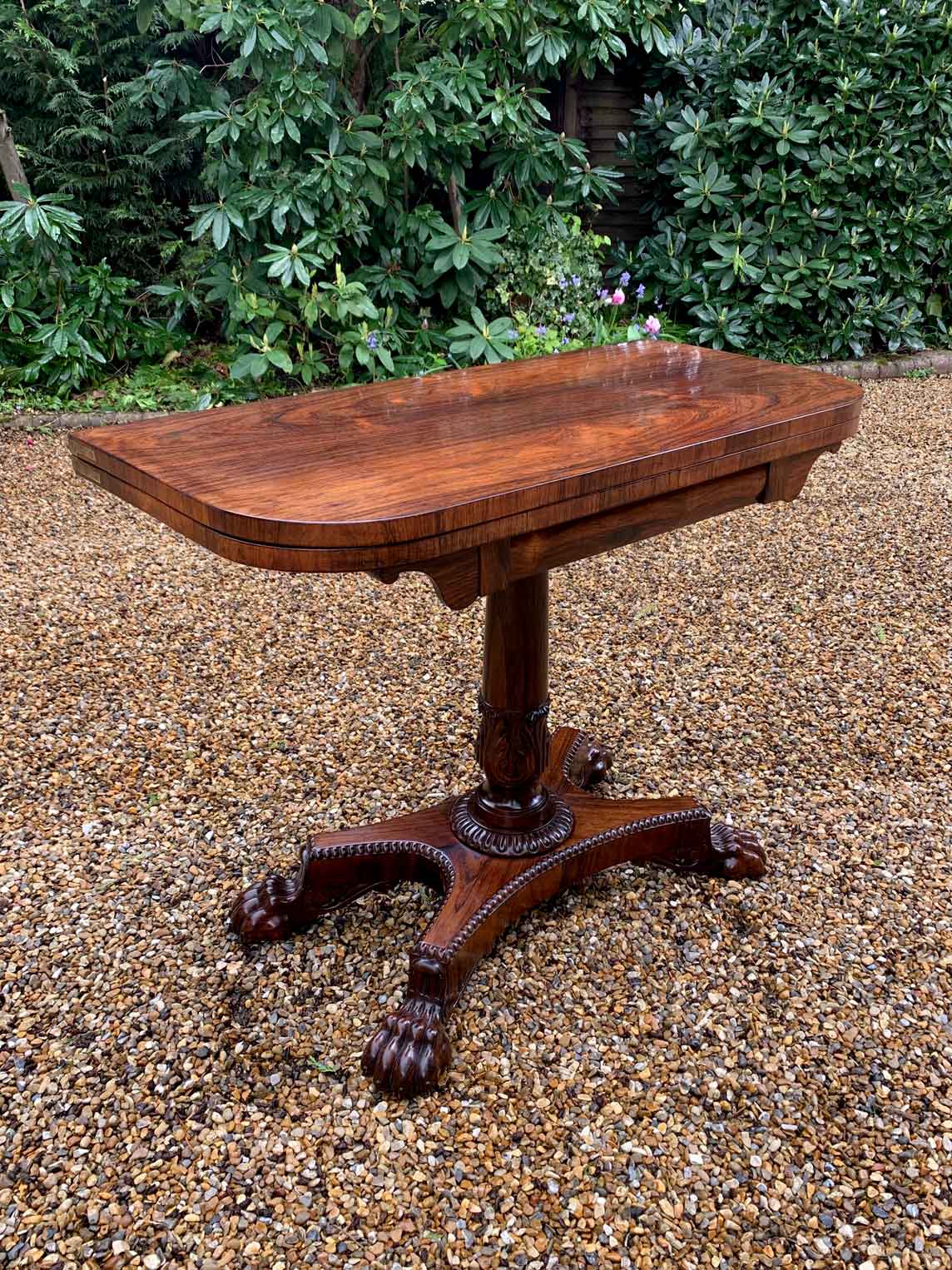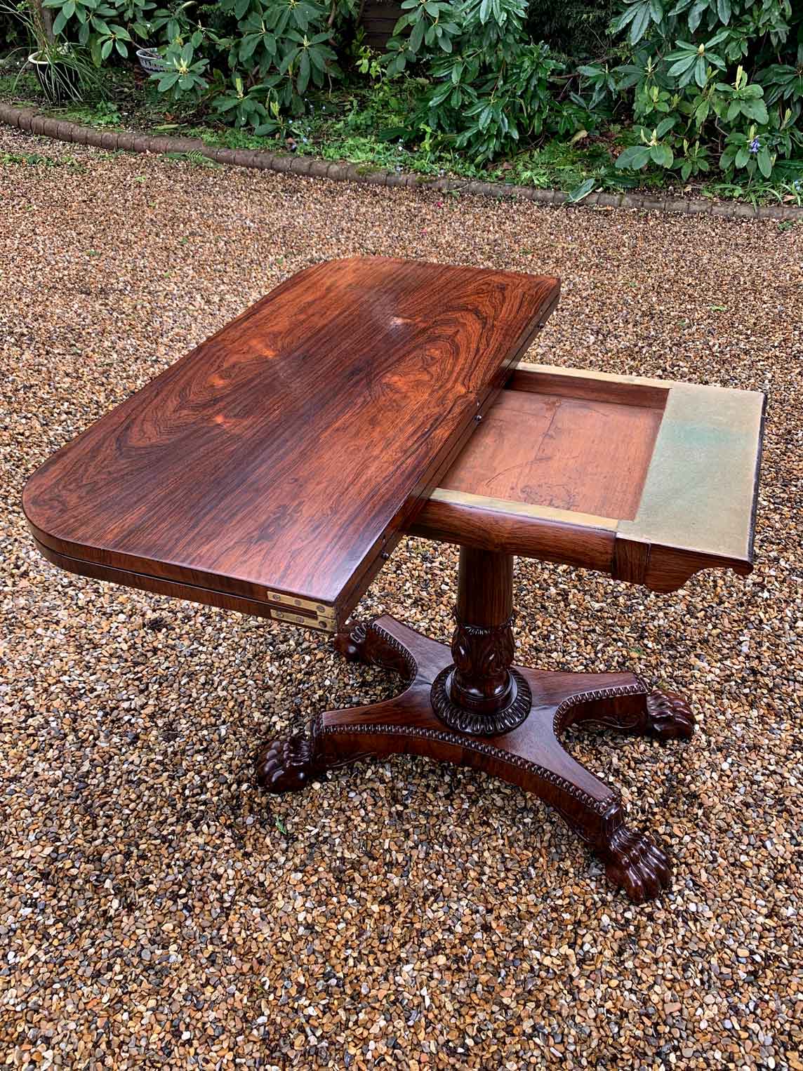 A 19th Century figured William IV Rosewood Tea Table. The top rotates by 90 degrees and unfolds to convert to a Tea Table. The table stands on an elegant turned carved central column with four carved lion claw feet with brass castors.