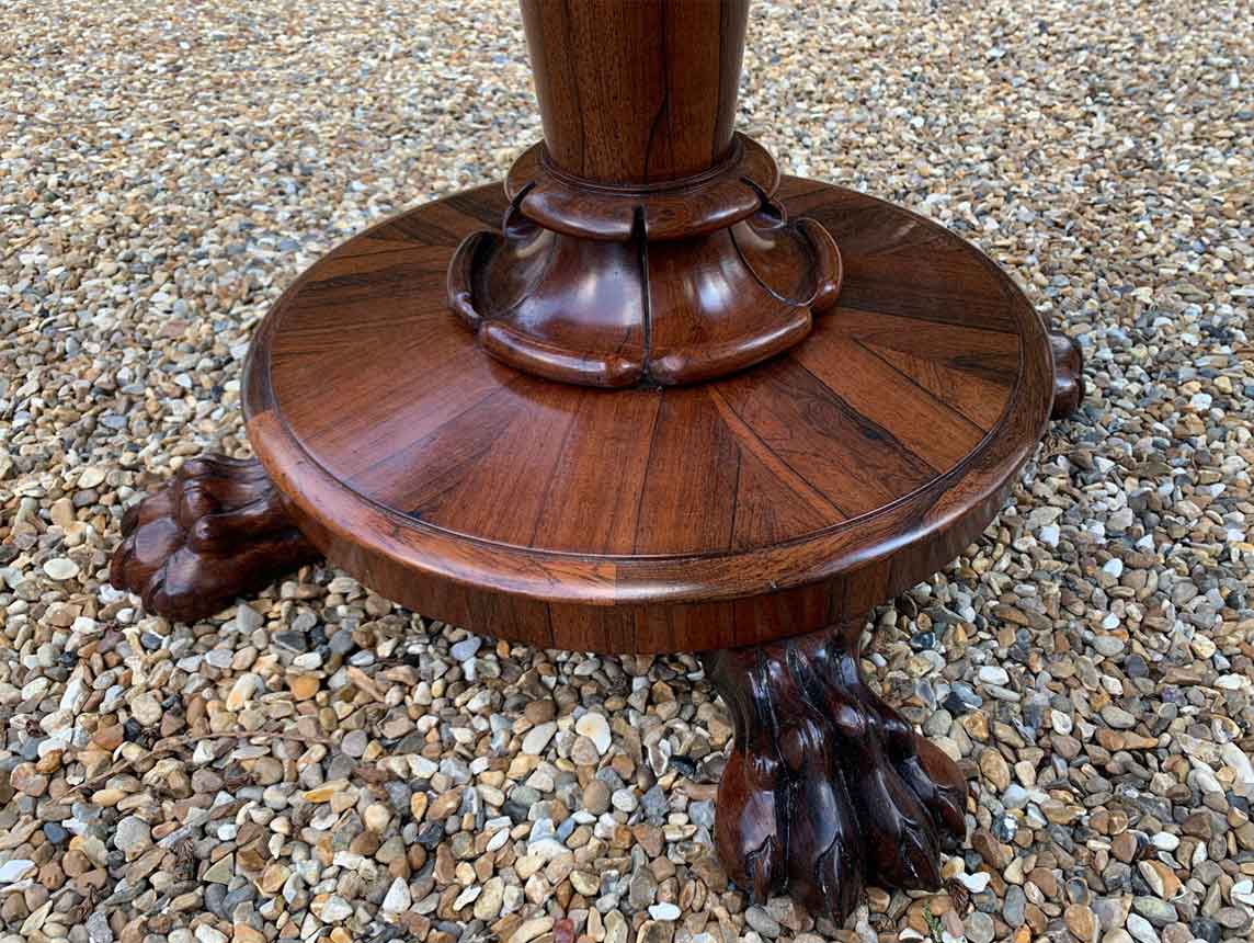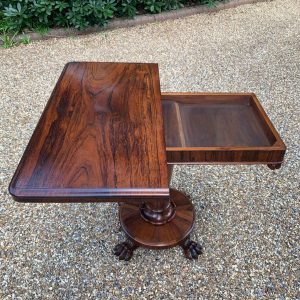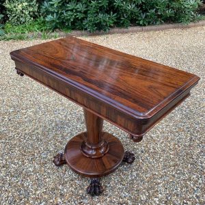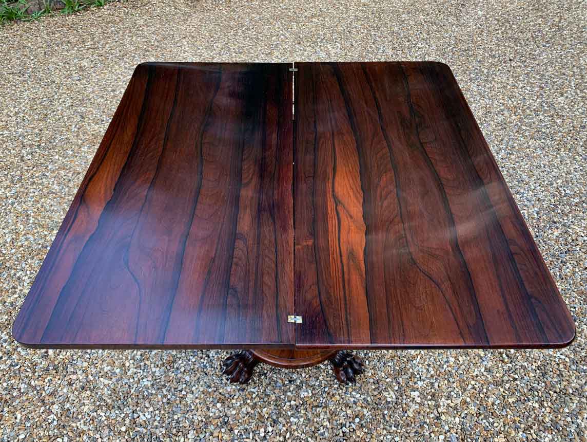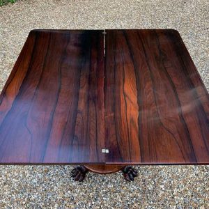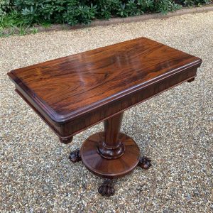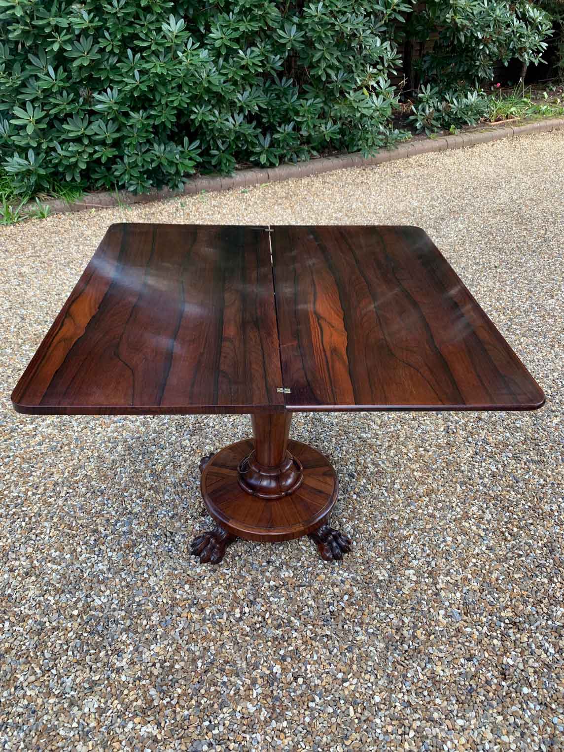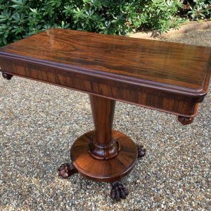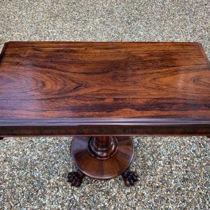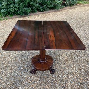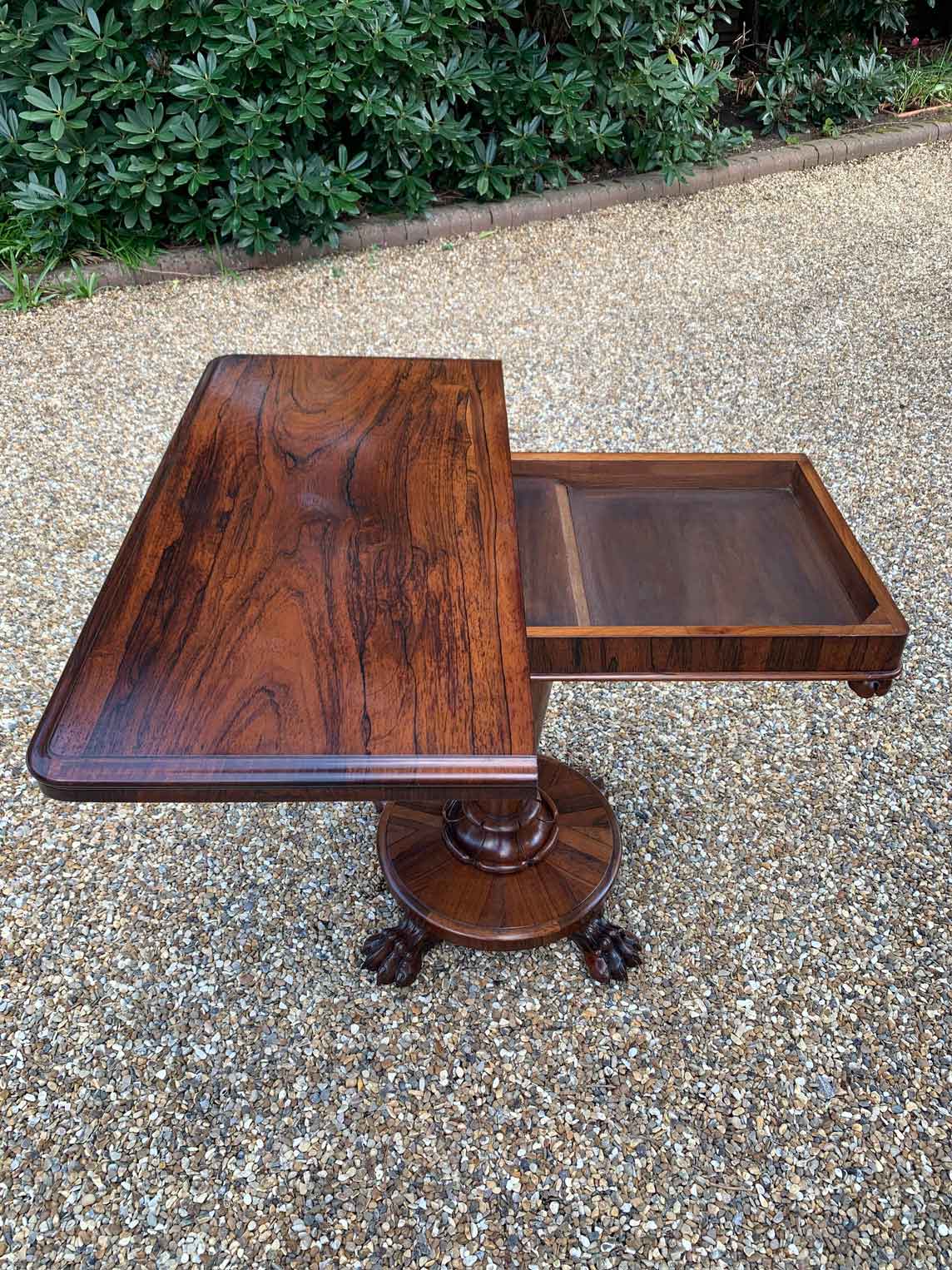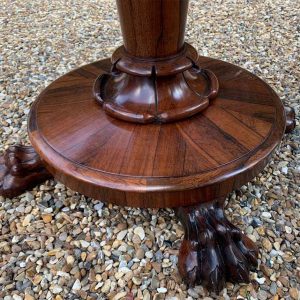 A 19th Century figured William IV Rosewood Tea Table. The table stands on an elegant turned flared stem with four carved lion claw feet with brass castors. The top rotates by 90 degrees and unfolds to convert to a Tea Table.
