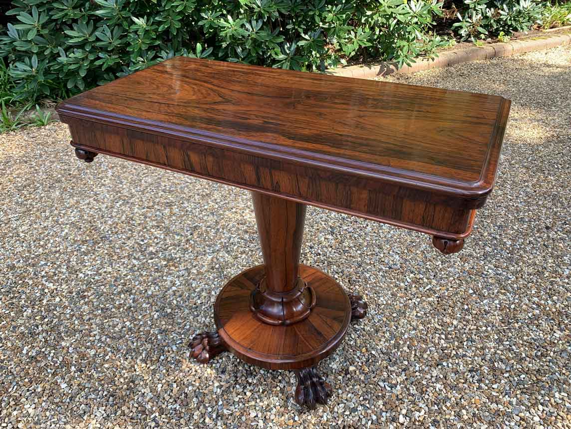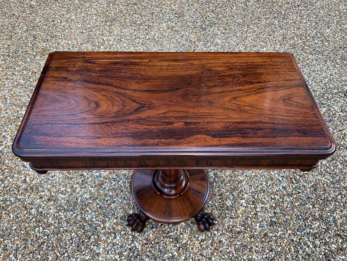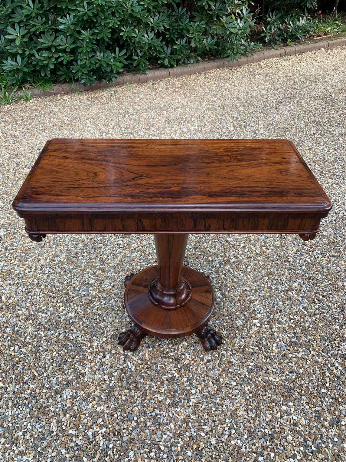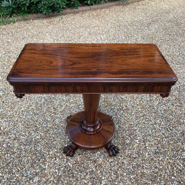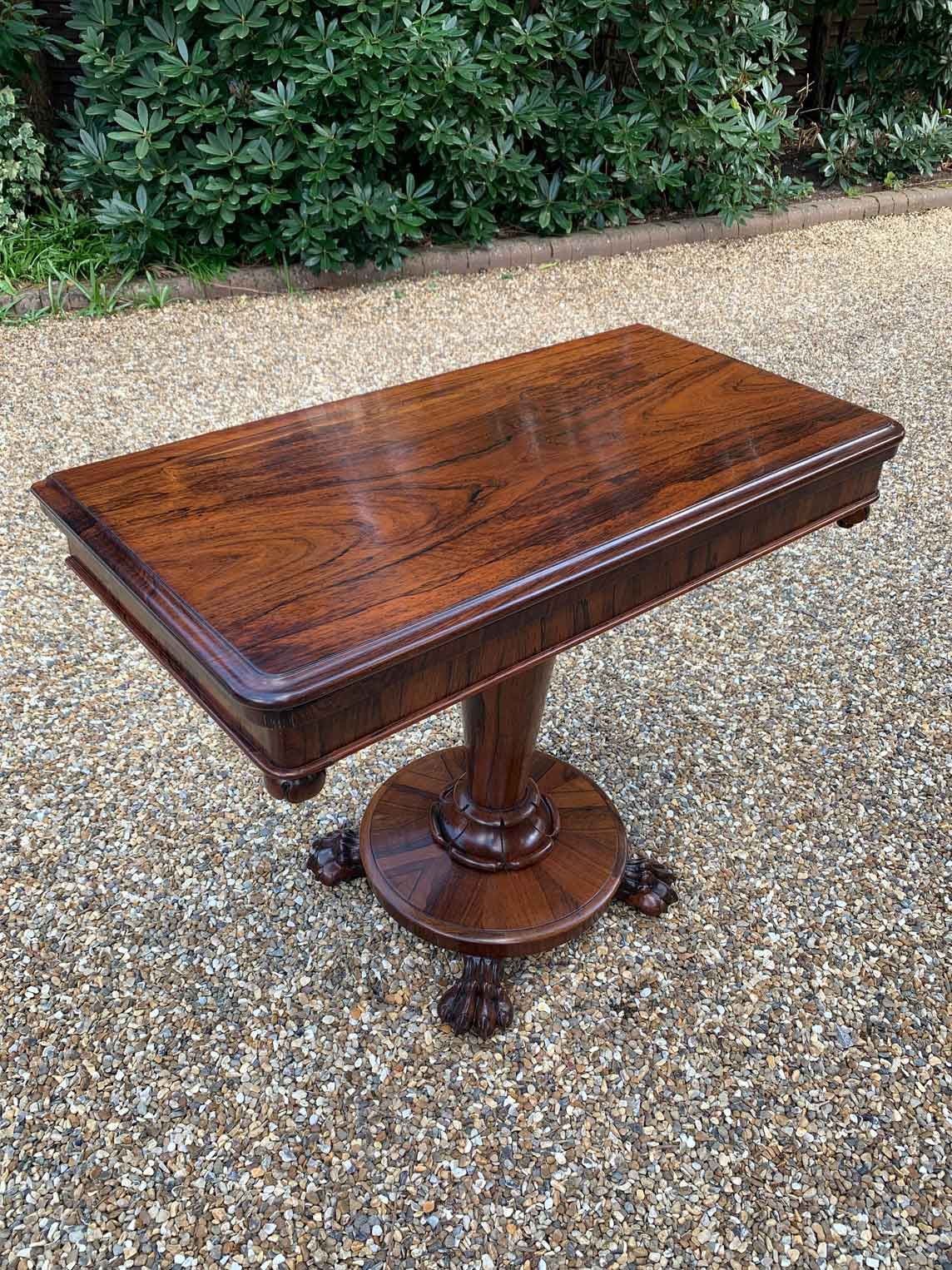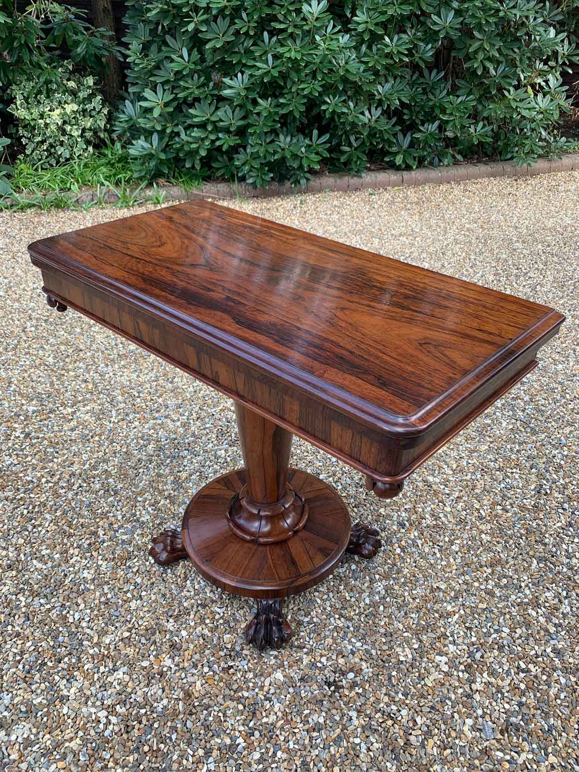 A 19th Century figured William IV Rosewood Tea Table. The table stands on an elegant turned flared stem with four carved lion claw feet with brass castors. The top rotates by 90 degrees and unfolds to convert to a Tea Table.