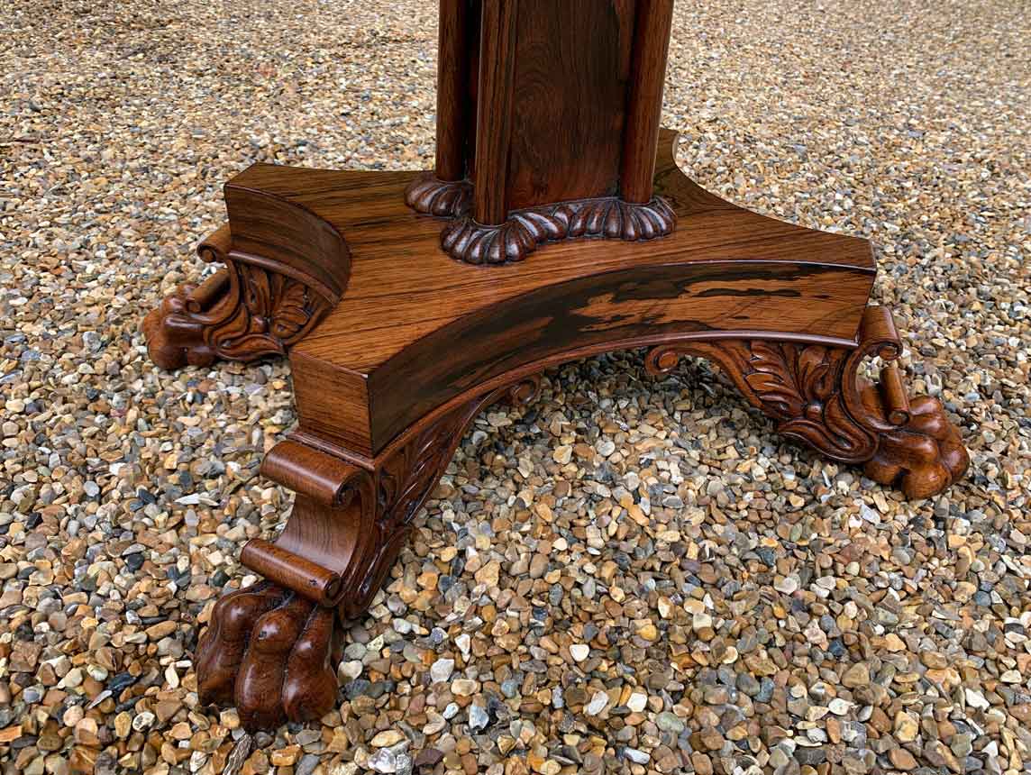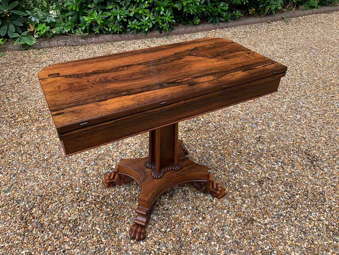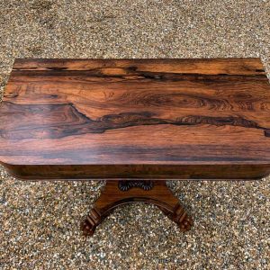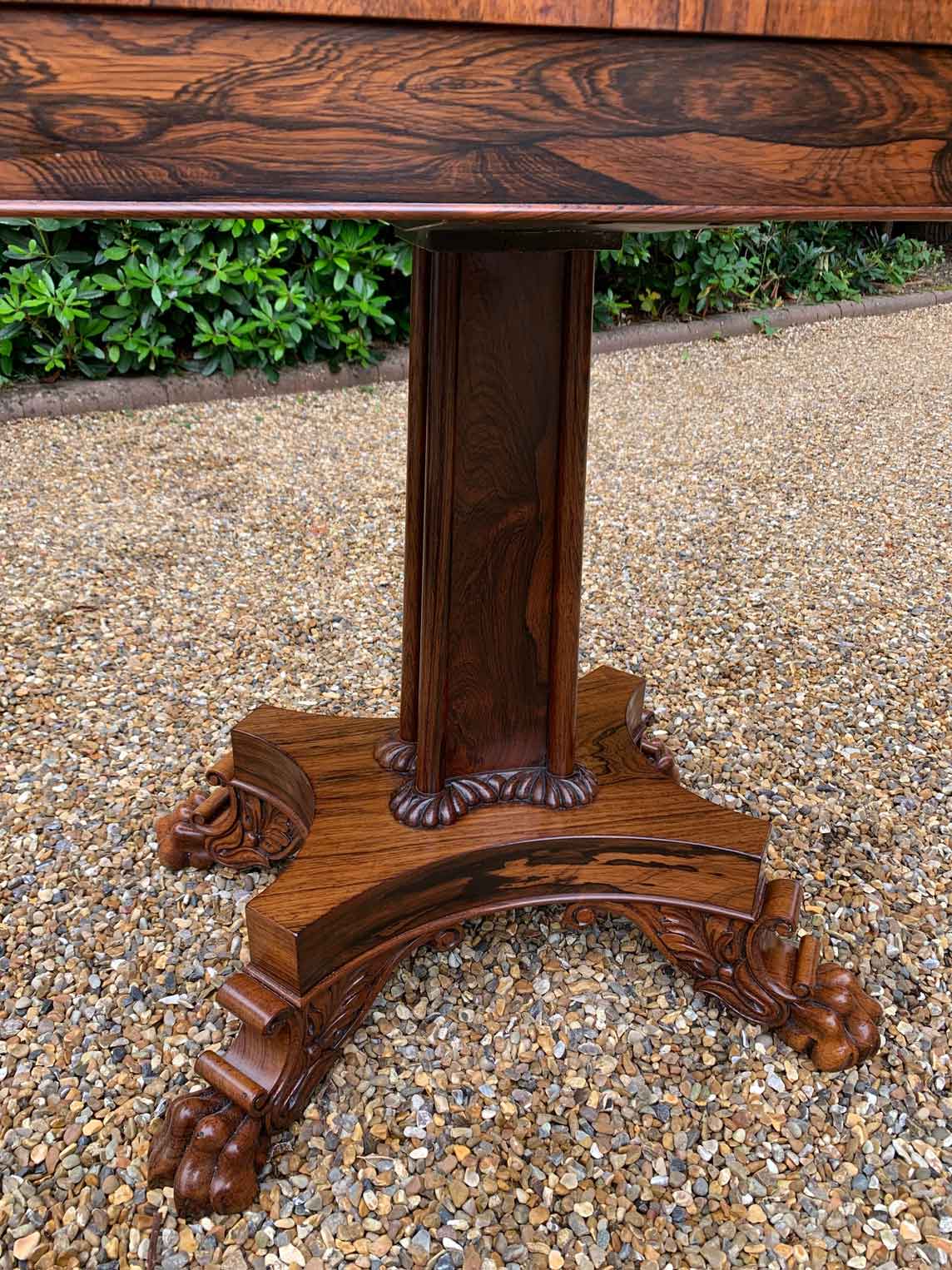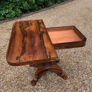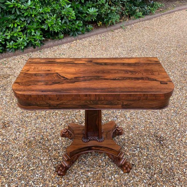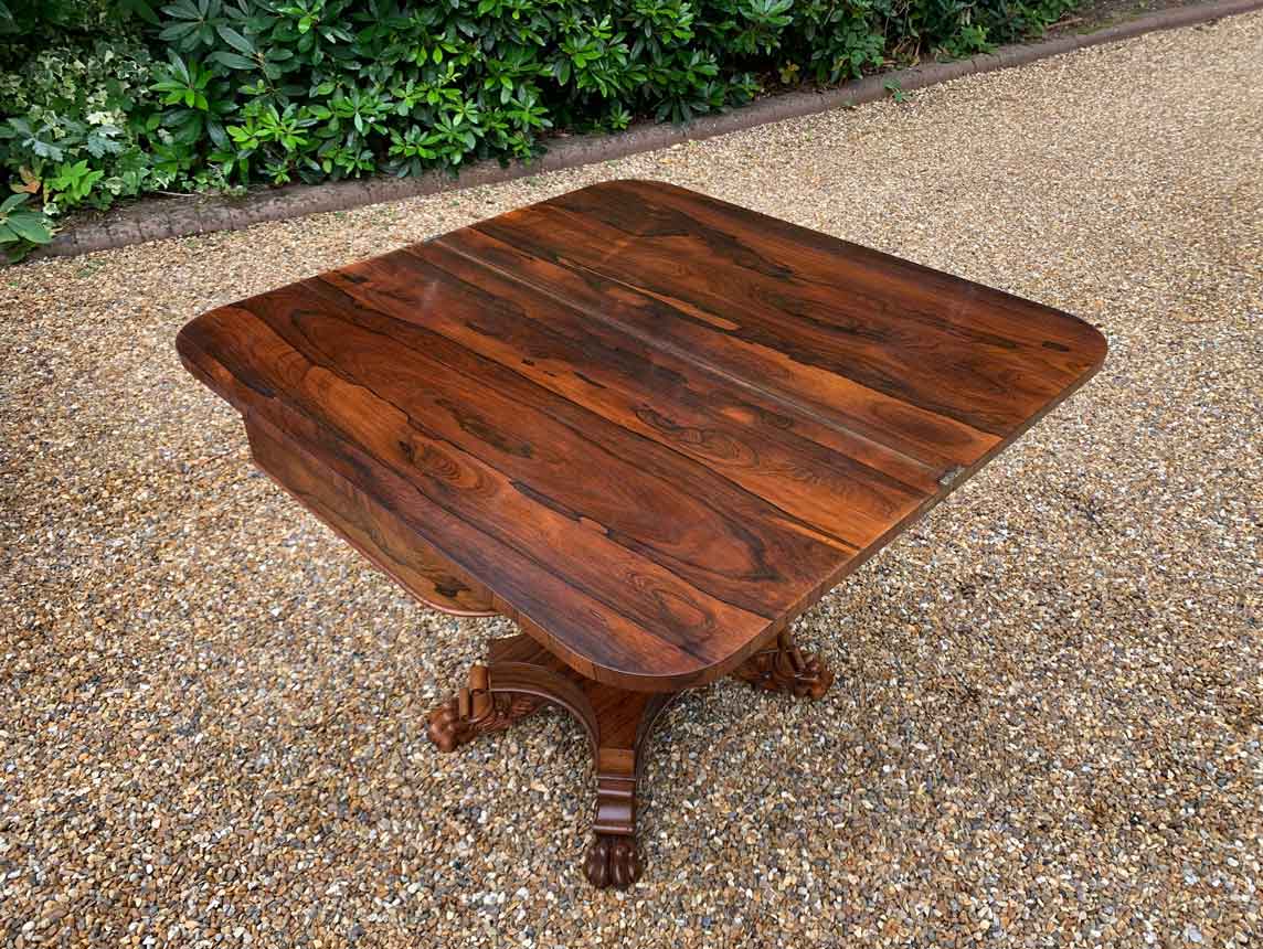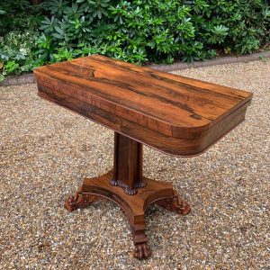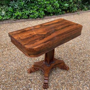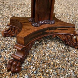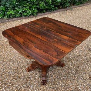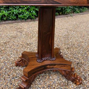 A beautiful 19th Century figured Regency Rosewood Tea Table. The top rotates by 90 degrees and unfolds to convert to a Tea Table. The table stands on an elegant turned carved column on a quatrefoil base with four carved lion claw feet with brass castors.